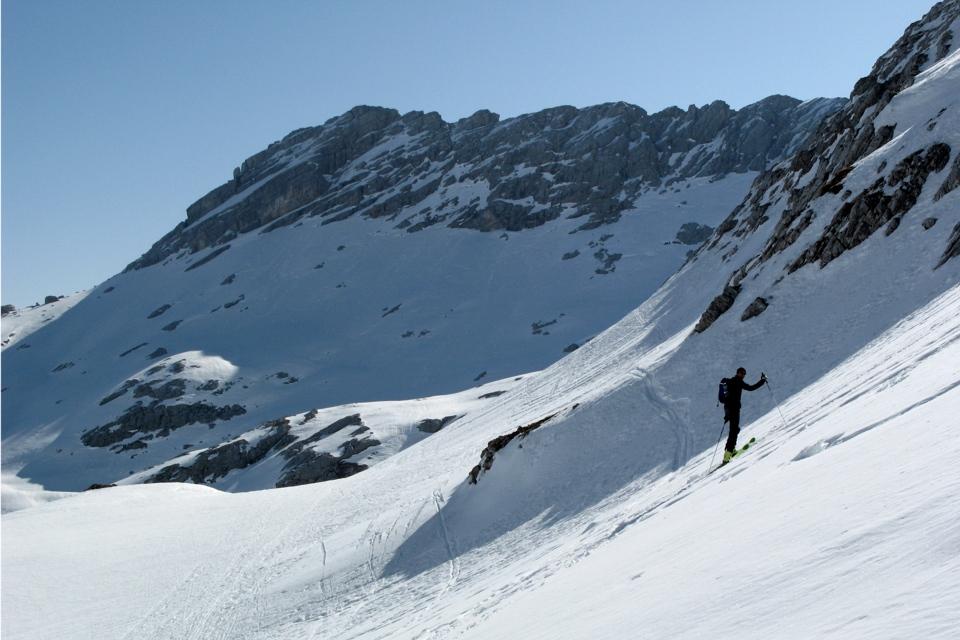 um 10.30Uhr tlw. schon zu stark aufgeweichter Harschdeckel bei der Abfahrt im Heuplattal