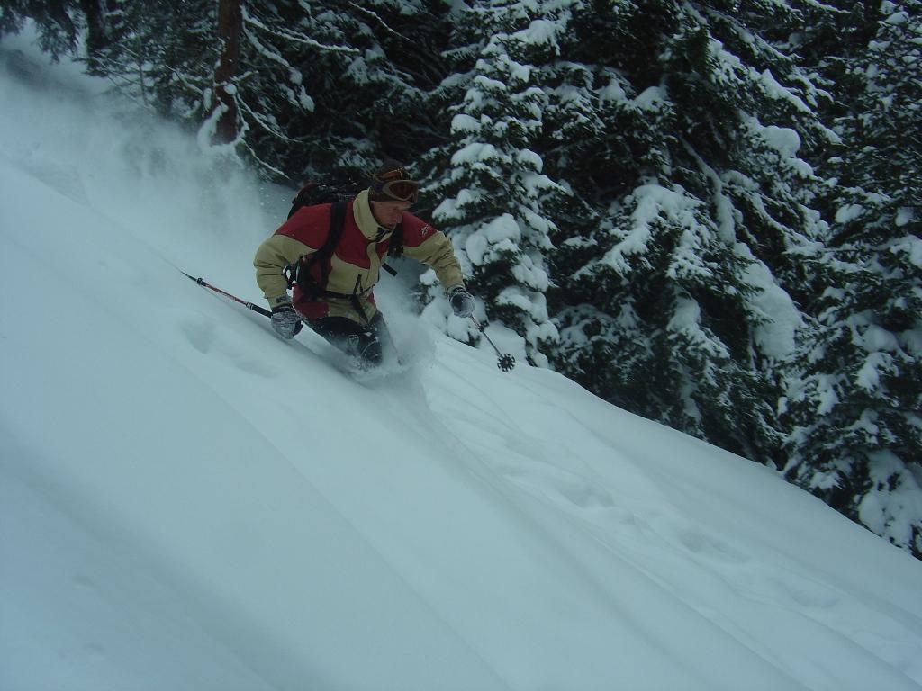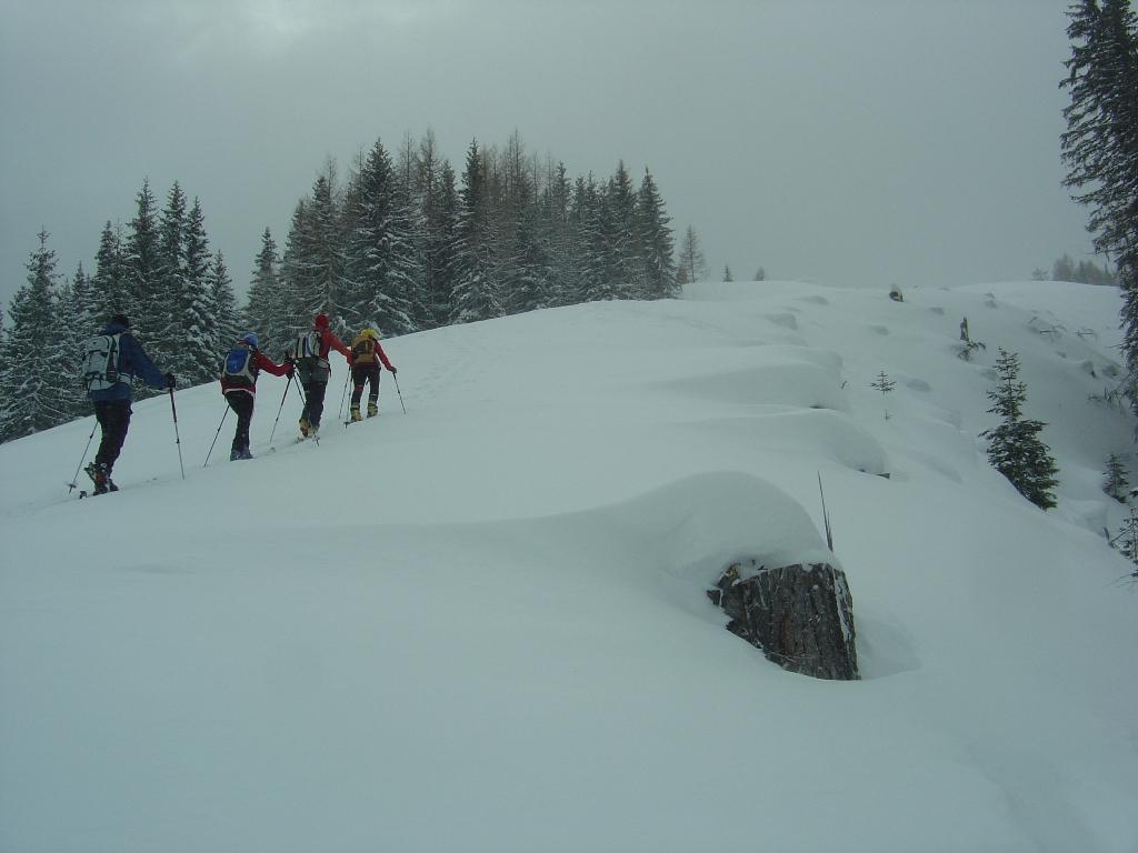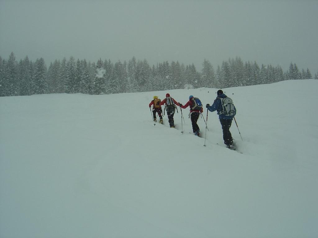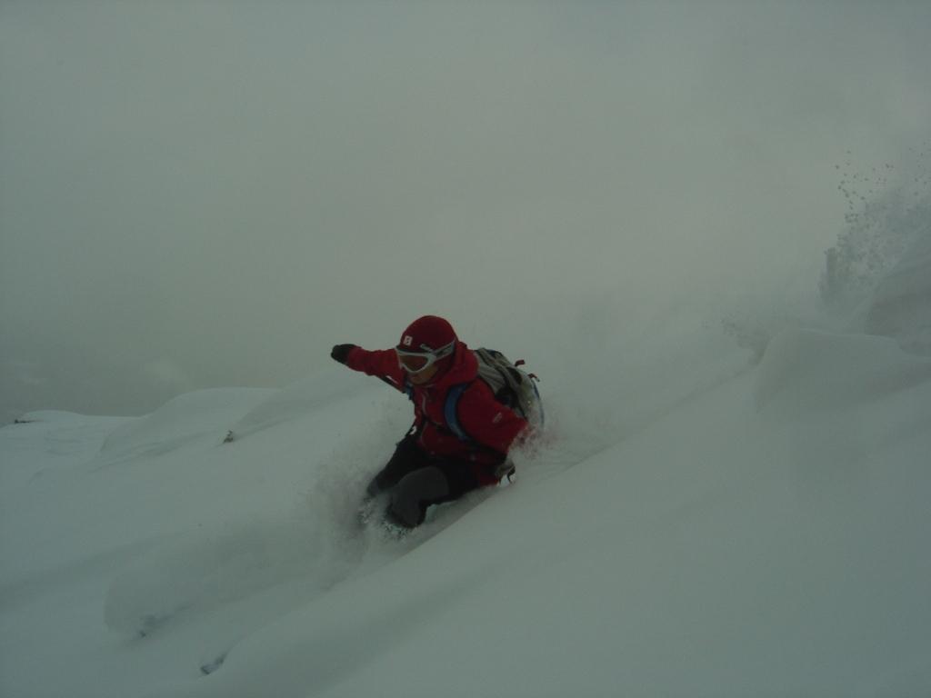 Bei leichtem Schneefall und schlechter Sicht ging`s heute zu den netten Wirtsleuten Christiane und Lois mit ihren fleißigen Helfern Anita und Alois auf die Kleinarlerhütte. Hier ließen wir uns von der Wirtin mit ihren Köstlichkeiten aus der Küche verwöhnen. Danach ging`s ab in den Tiefschnee, der unterhalb der Hütte ohne nennenswerten Windeinfluß gefallen ist. Erst im Bereich der Hütte setzte heute zeitweise stärkerer Wind ein.