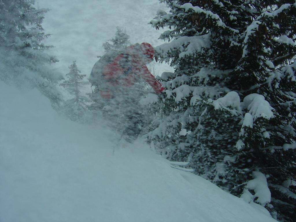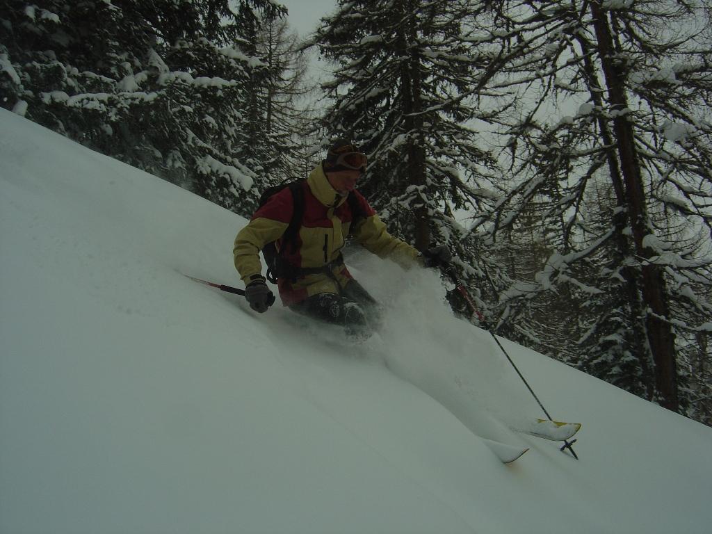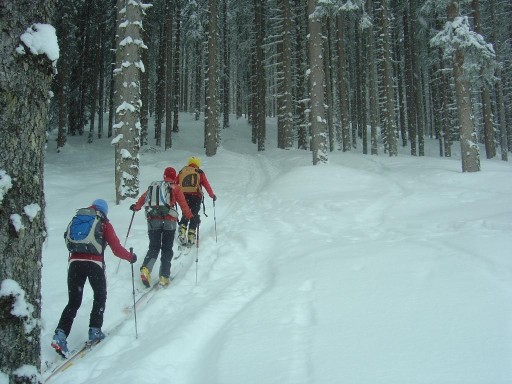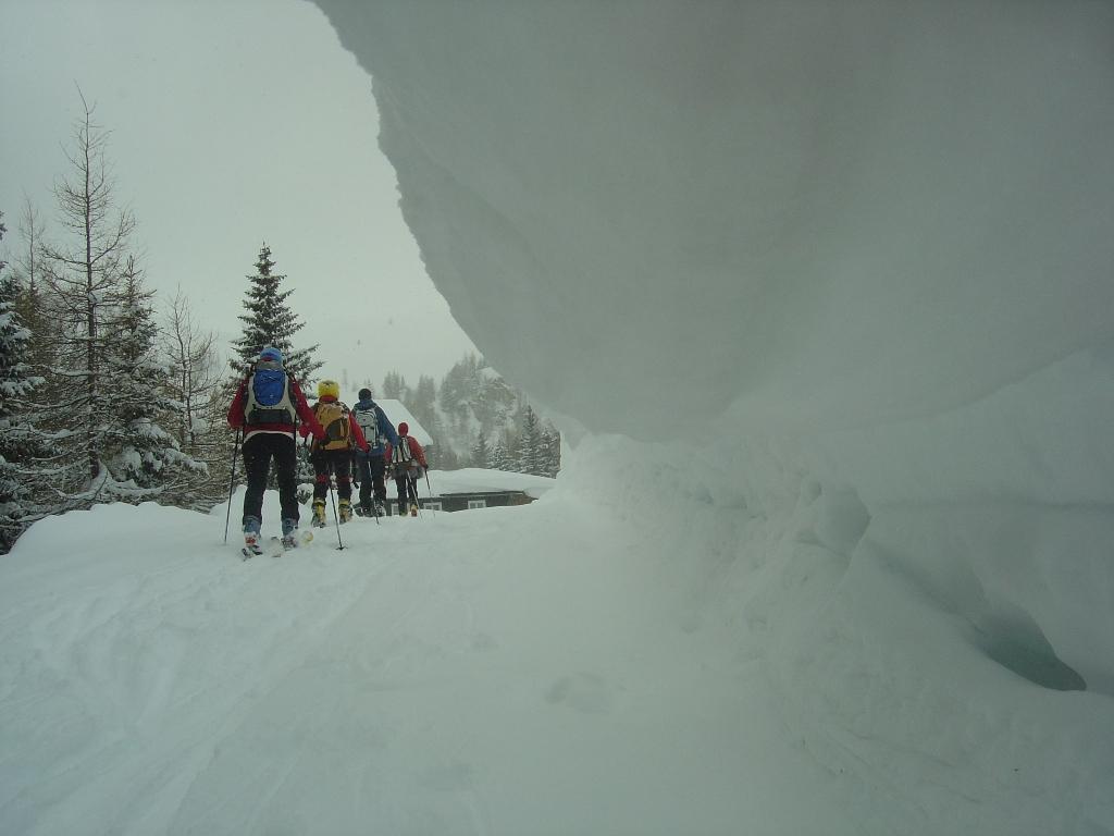 Bei leichtem Schneefall und schlechter Sicht ging`s heute zu den netten Wirtsleuten Christiane und Lois mit ihren fleißigen Helfern Anita und Alois auf die Kleinarlerhütte. Hier ließen wir uns von der Wirtin mit ihren Köstlichkeiten aus der Küche verwöhnen. Danach ging`s ab in den Tiefschnee, der unterhalb der Hütte ohne nennenswerten Windeinfluß gefallen ist. Erst im Bereich der Hütte setzte heute zeitweise stärkerer Wind ein.