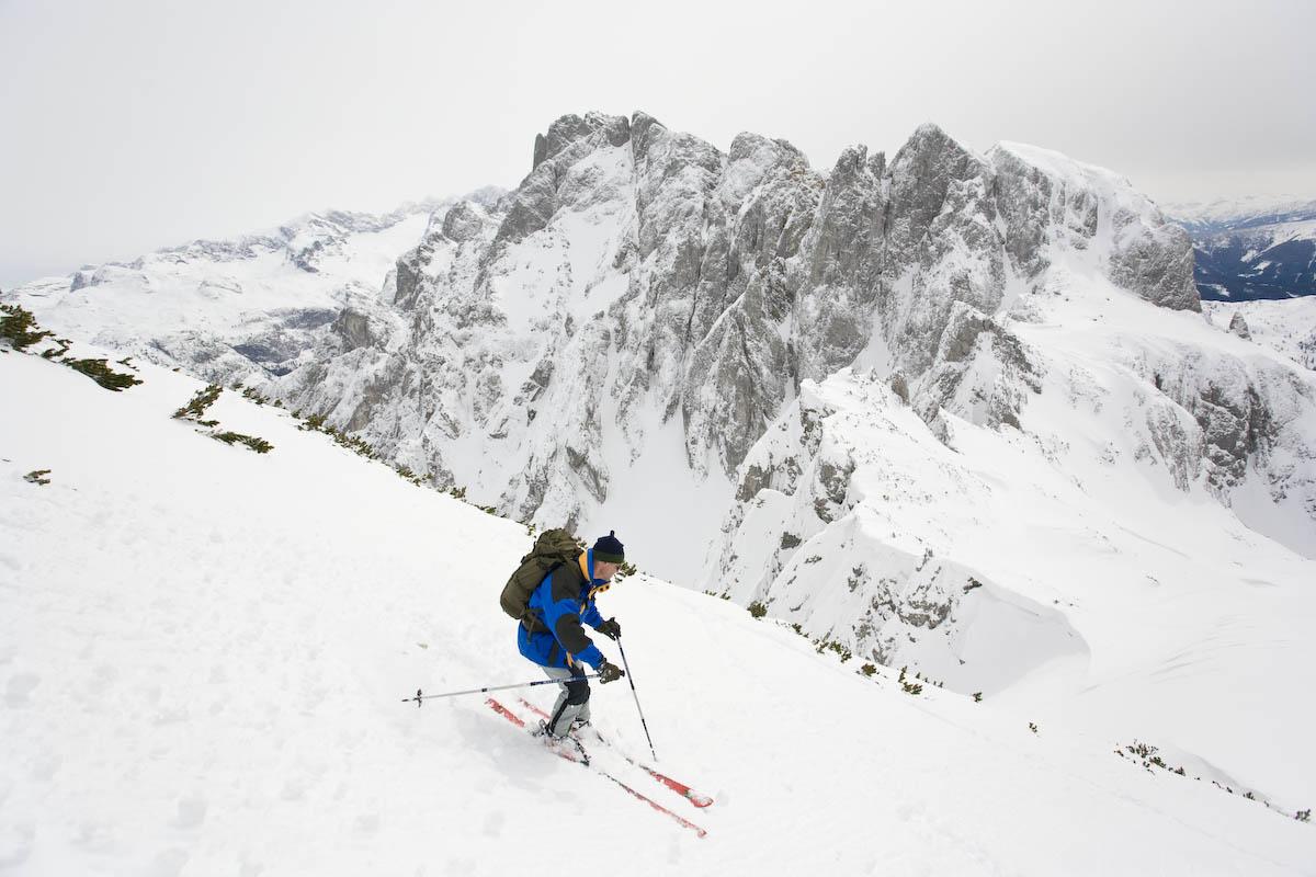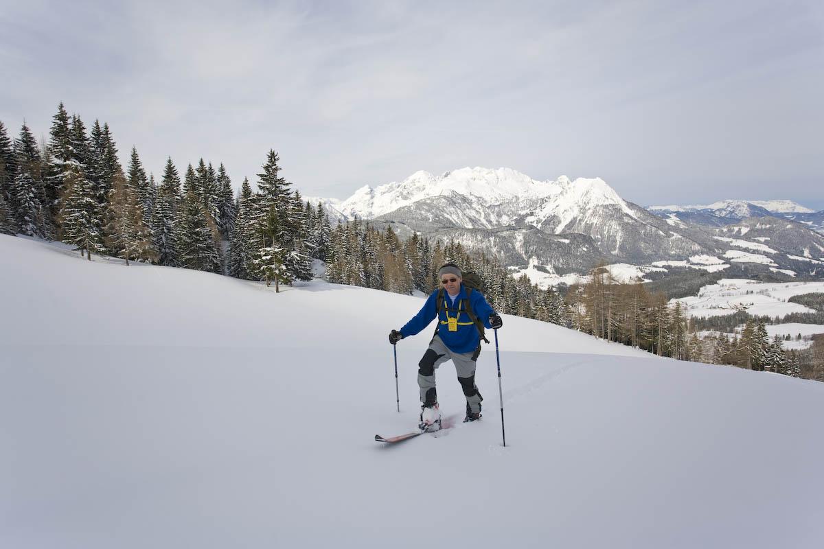 Start beim Liftparkplatz im Astauwinkel, Annaberg, die Schipiste hinauf und dann hieß es auch schon Eintauchen in den Pulver, der hier am Gosaukamm wirklich reichlich gefallen ist. Im Mittelteil der Tour dürften so etwa 70 - 80 cm gefallen sein, oben, nach der zweiten Steilstufe, war er teilweise doch ziemlich verblasen. Darunter war kaum Windeinfluss feststellbar, was sich sehr positiv auf die lokale Lawinensituation auswirkt. Es gab keinerlei Warnzeichen wie Setzungsgeräusche oder Sprünge in der Schneedecke. Die Setzung und Verbindung mit der Altschneedecke war gut.