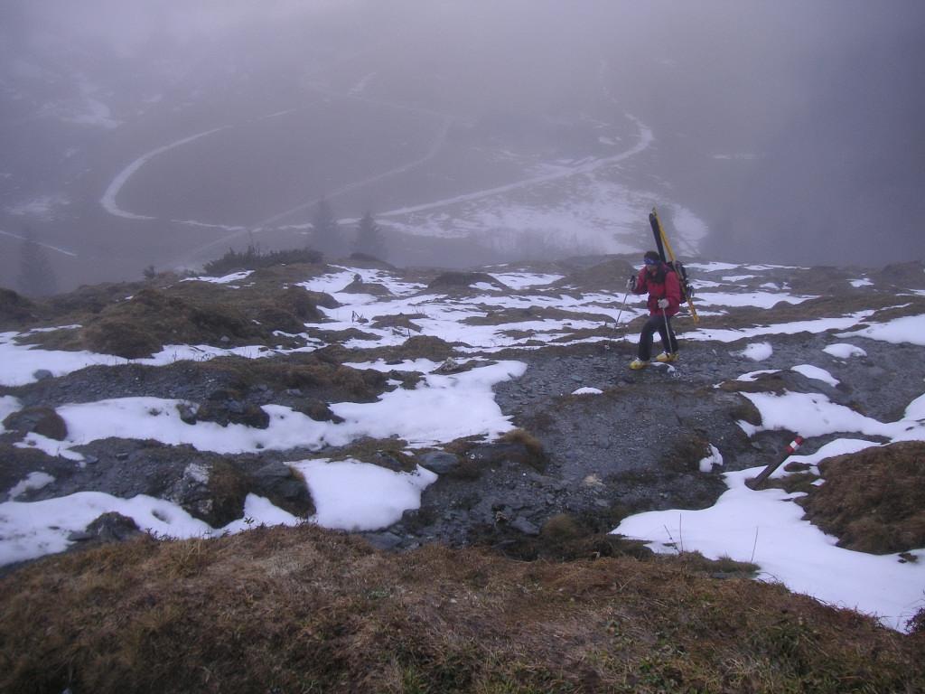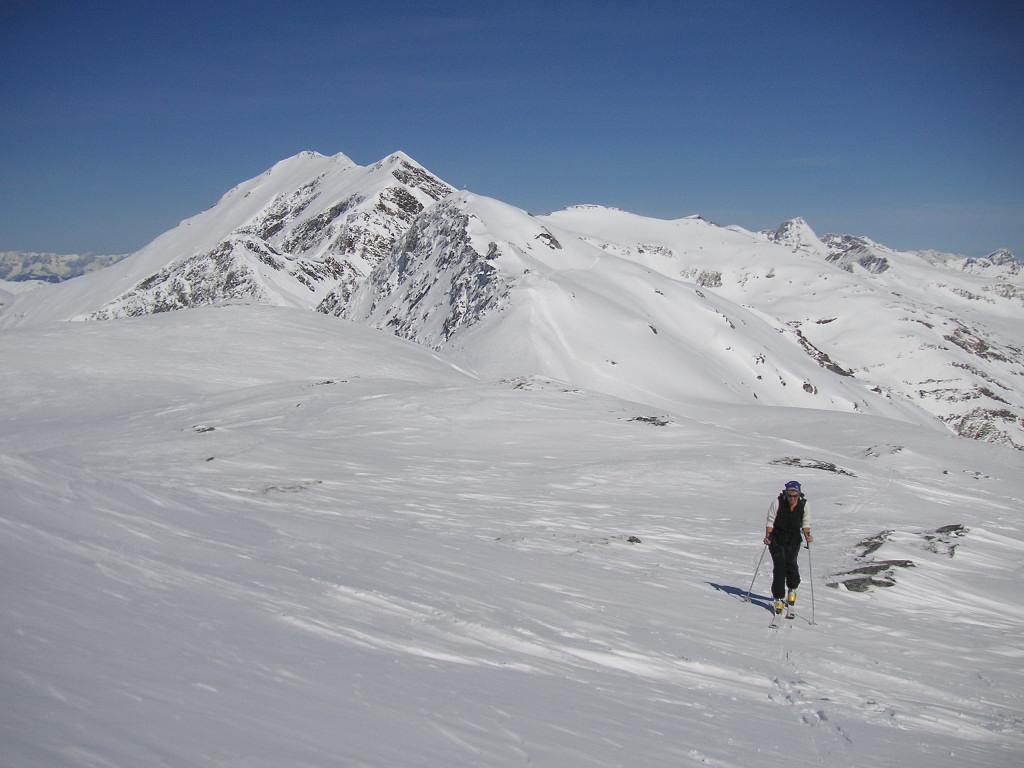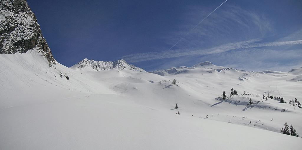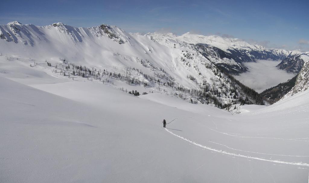 bei der prognostizierten Neuschneemenge und der verworrenen Lawinensituation entschieden wir uns zum Kreekar: nicht steil, breit genug zum Ausweichen, zur Not das Murtörl als Ziel. Doch: kaum Neuschnee (maximal 2-3cm auf der gerade tragenden weichen Unterlage im Kar), es dürfte hoch hinauf geregnet haben. Eine herrliche und sichere Aufstiegstour, der Abfahrtsgenuß hielt sich in Grenzen: in Gipfelnähe windgepresster Schnee, im Kar eine kleine feuchte freudige Pulverauflage, danach im Schatten Bruchharsch, in der Sonne Feuchschnee.