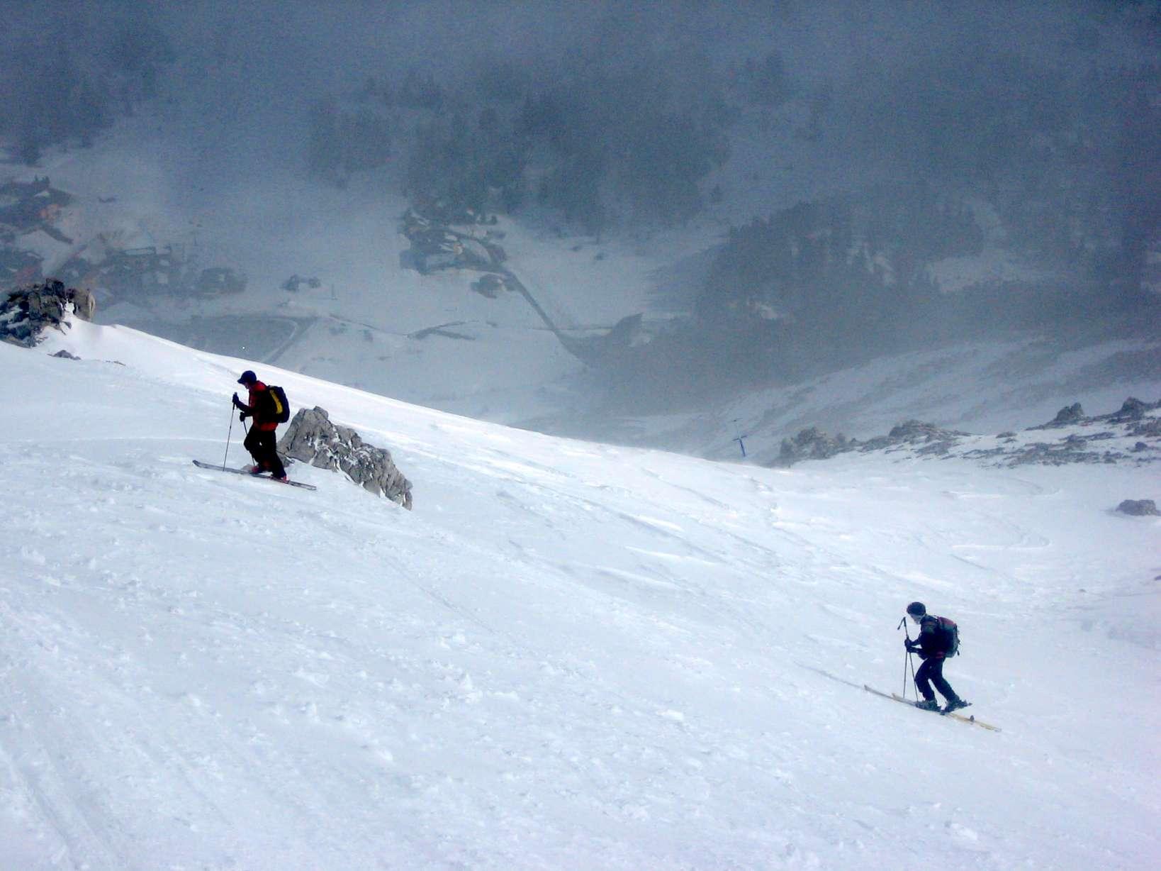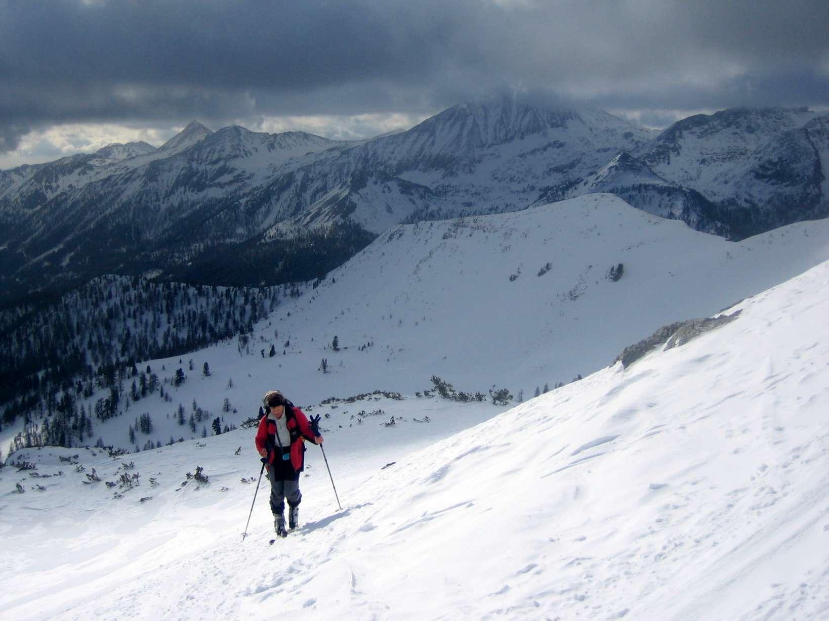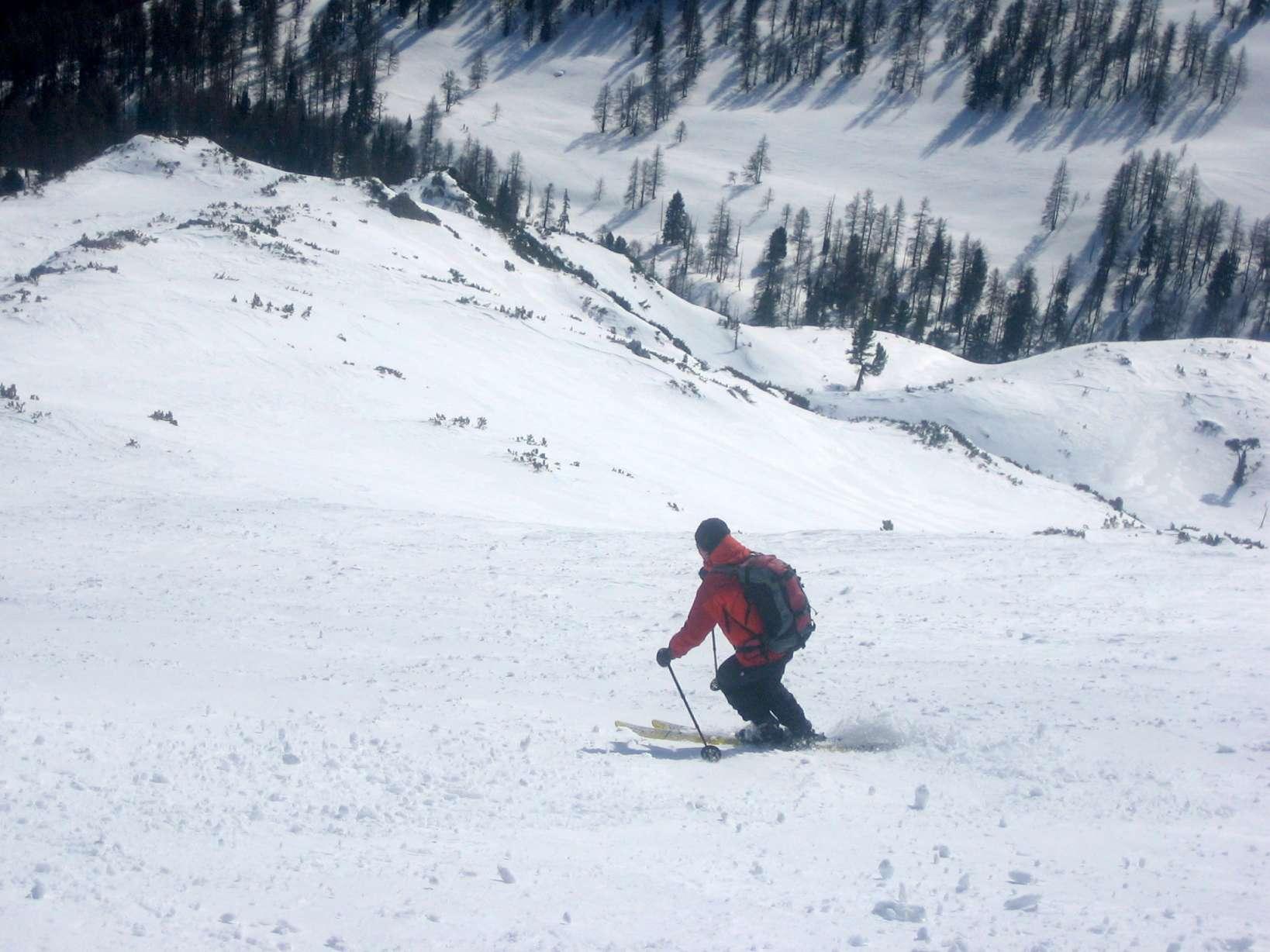 Bei Nieselregen über den Tauern. Im Anstieg zur Gastalm haben mehrere eindrucksvolle Nassschnee-Lawinen den Almweg verlegt - Auswirkungen der ersten massiven Erwärmung in dieser Höhenlage! Der auflebende Wind verblies gegen10:30 Uhr die Wolken, die zunächst noch ab etwa 2.100 m die Gipfel gänzlich einhüllten, und sorgte schließlich für eine sonnige Abfahrt. Schnee im obersten Abschnitt noch kalt, dann leicht verwärmt bis sumpfig unterhalb der Gastalmen. Der frühe Start bei noch zweifelhaftem Wetter wurde jedenfalls belohnt!