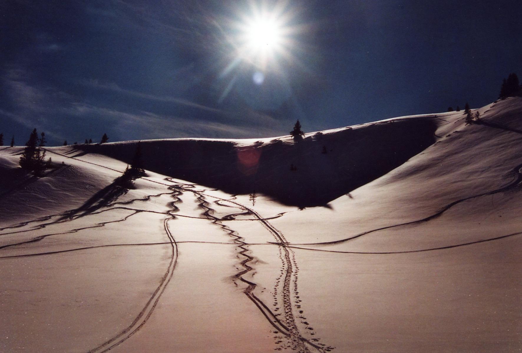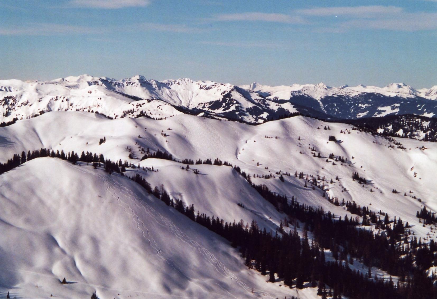 Die Rundtour führt von Mühlbach auf den Mühlbacher Schneeberg, weiter auf den St. Veiter Schneeberg (beide waren ohne Schnee) und dann zum Ahornstein. Von dort kann man über schöne Hänge zur Tiergartenalm und zum Liftparkplatz abfahren, wo das Auto steht.