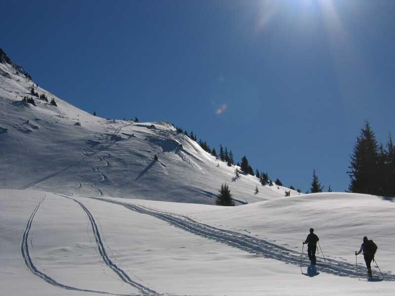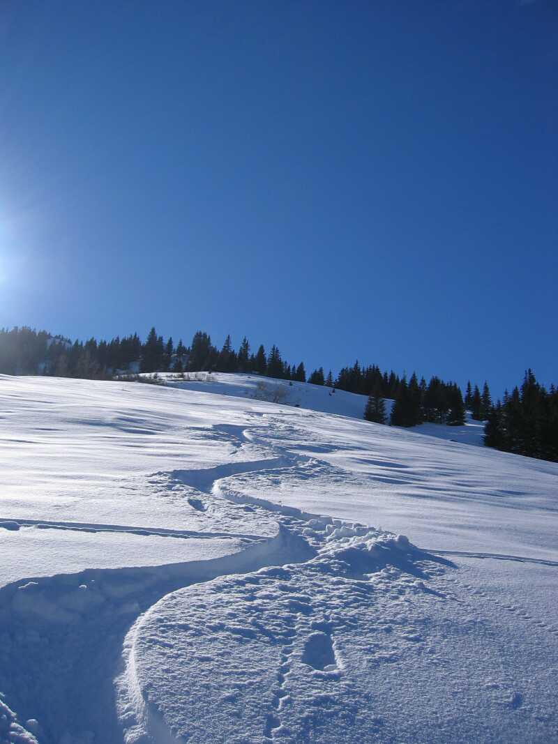 Vom Ghs. Alte Wacht (964) auf den Kuhkaser (2054). Im Tal ca. 5cm Pulverauflage . Bis ca. 1400m teilweise nur geringe Unterlage mit immer wieder fast aperen Wiesenflecken, die aber alle problemlos umgangen werden konnten. Oberhalb ca. 1400m deutliche Zunahme der Pulverauflage auf ca. 15-20cm. Am windstillen Gipfel war ungetrübte Fernsicht zu genießen. Trotz des hohen Bekanntheitsgrades waren rel. wenige Tourengänger unterwegs, sodass bei der Abfahrt größtenteils unverspurte Pulverhänge befahren werden konnten.