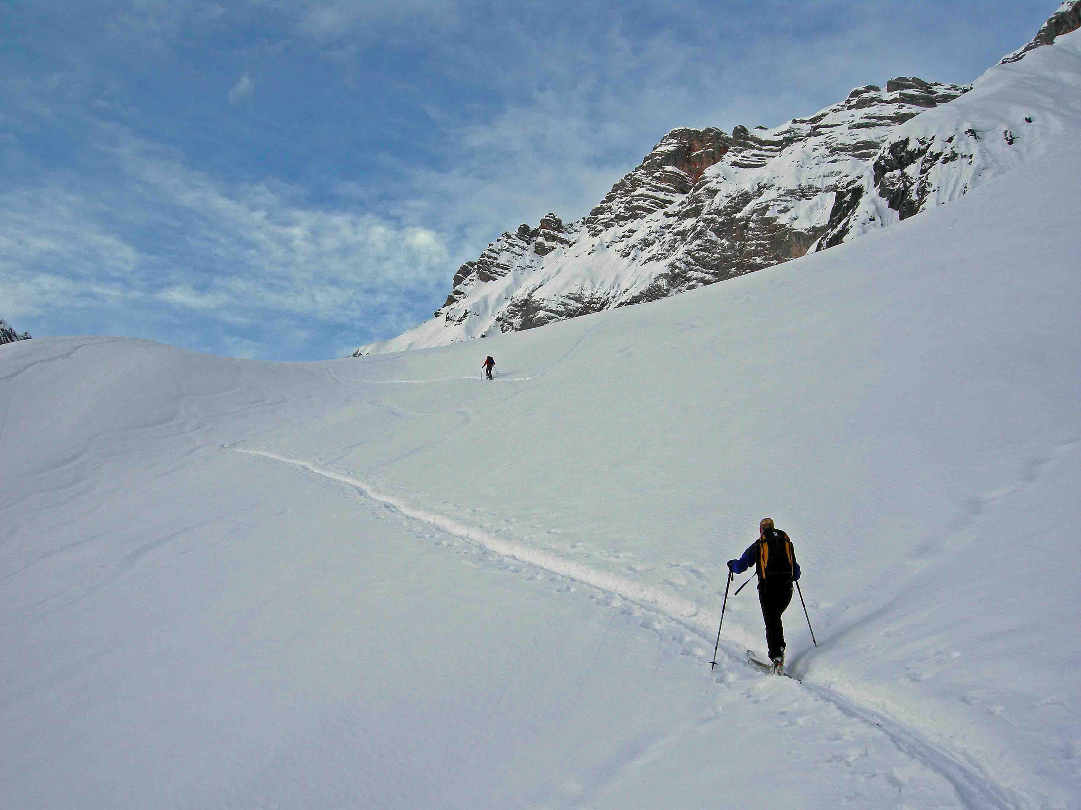 In der Früh gab es in der Kinderstube an den rein ostseitigen Hängen noch Pulver. Der Föhn bzw. +5°C haben aber auch hier um die Mittagszeit den Schnee zu einem "toign" gemacht. Früh aufstehen hat sich gelohnt.