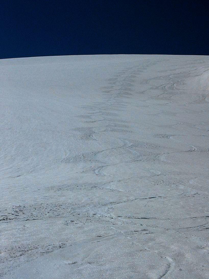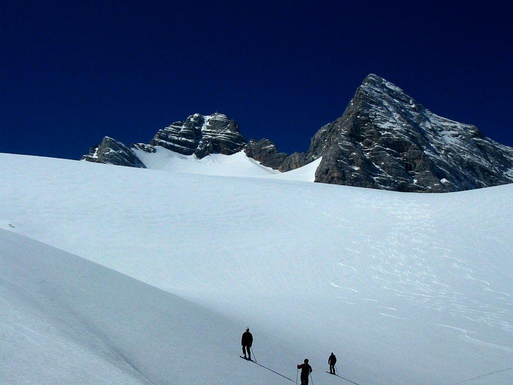 Rückblick: Stahlblauer Himmel,Traumhafte Firnverhältnisse am Hallstätter Gletscher,im Edelgries schon etwas tiefer werdender Firn.