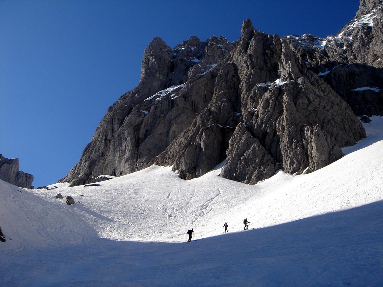 Aufstieg durchs Griesener Kar zur Fritz Pflaum Hütte, kurze Abfahrt ins Kleine Griesener Tor und über den Normalweg aufs Lärcheck. Abfahrt im Westteil des Griesener Kares geht noch bis 1300 m.
