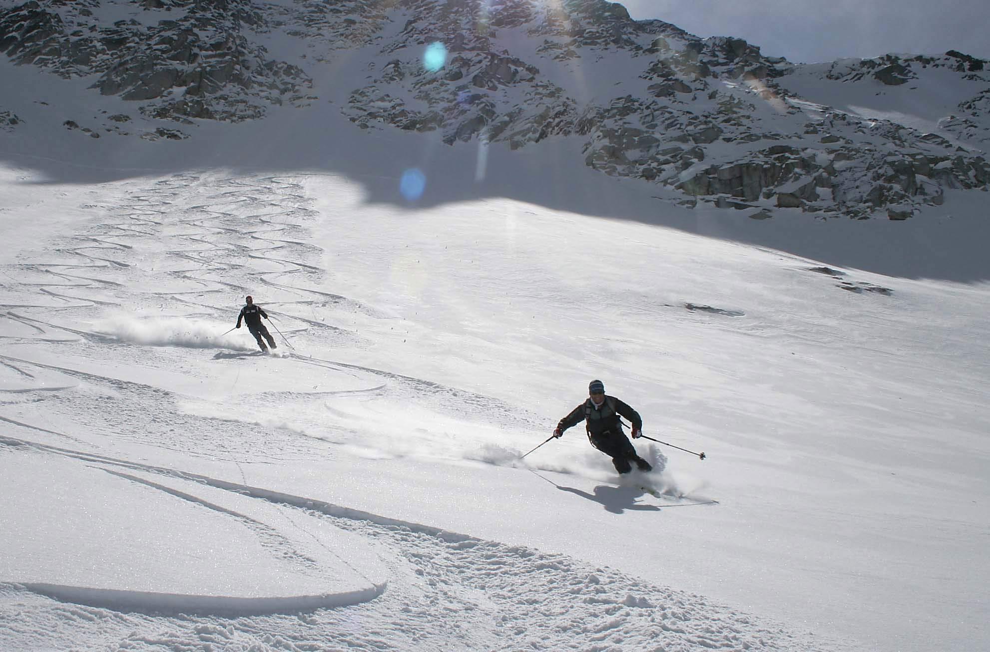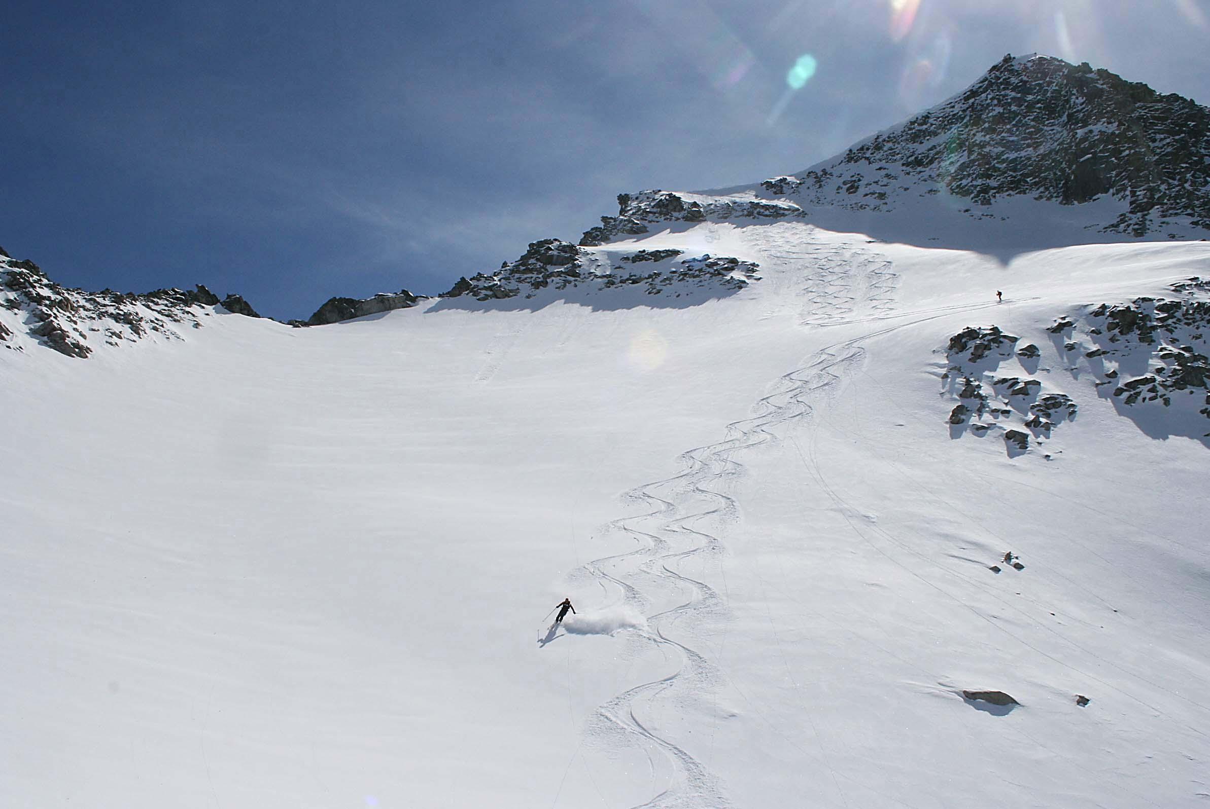 Fürleg 2925m- Kitzkar Aufstieg in die Granatscharte über den Südgrat auf den Sonnblick- Abfahrt Sonnblick Kees- über den Fürleg Südgipfel weiter zum Nordgipfel 2925m. Abfahrt durch das Kitzkar in die Dorfer Öd und talauswärts zur Schneiderau. Verhältnisse: Sonnblick Südgrat problemlos zu begehen, keine Vereisung- 15 cm Pulverschnee am Sonnblickgletscher- 15 bis 20 cm Pulver im Kitzkar bis 2000m- danach Firn. Gefahrenstellen im Bereich der Einfahrt in das Kitzkar, ansonsten ist der Unterbau der Schneedecke sehr gut verfestigt auf dem der lockere Pulver liegt. Die Talausfahrt ist bis zur Brücke über den Ödbach 1345m gut möglich. Danach über ein schmales Schneeband, mehr oder weniger mühsam, entlang des geräumten Forstweges bis zur Kreuzung 1214m. Von hier noch eine halbe Stunde zu Fuß in die Schneiderau. PS: Der Fußmarsch wird von Tag zu Tag länger und steht bald nicht mehr im Verhältnis zur Abfahrt. In diesem Fall würde ich das Kitzkar abfahren solange es Spaß macht , wieder zum Fürleggipfel aufsteigen und mich über die Osthänge Richtung Rudolfshütte verabschieden.