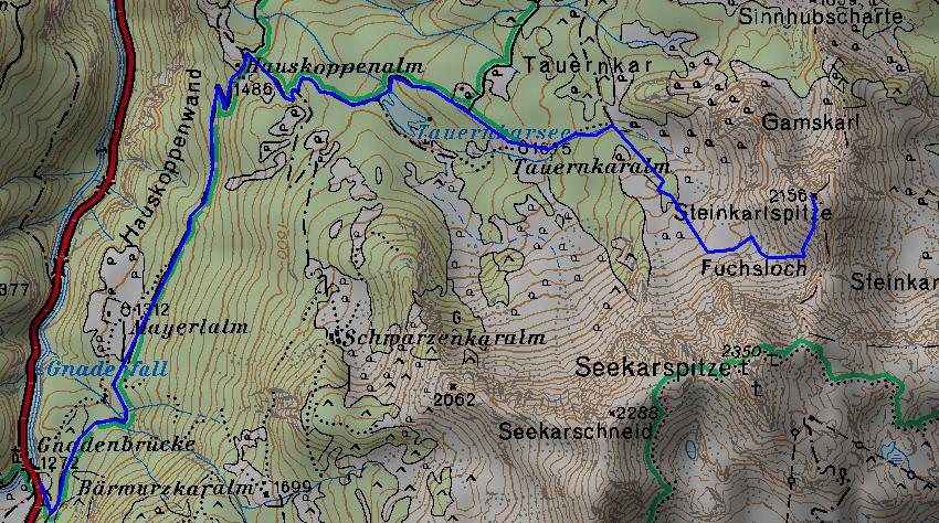 Von der Gnadenbrücke vor Obertauern über die Tauernkaralm und das Fuchsloch auf die Steinkarlspitze - eine einsame und schöne Tour. Der Schnee bietet alle paar Meter Abwechslung - aper,eisig,harschig,pulvrig,firnig,bruchharschig,sulzig und wieder von vorne.