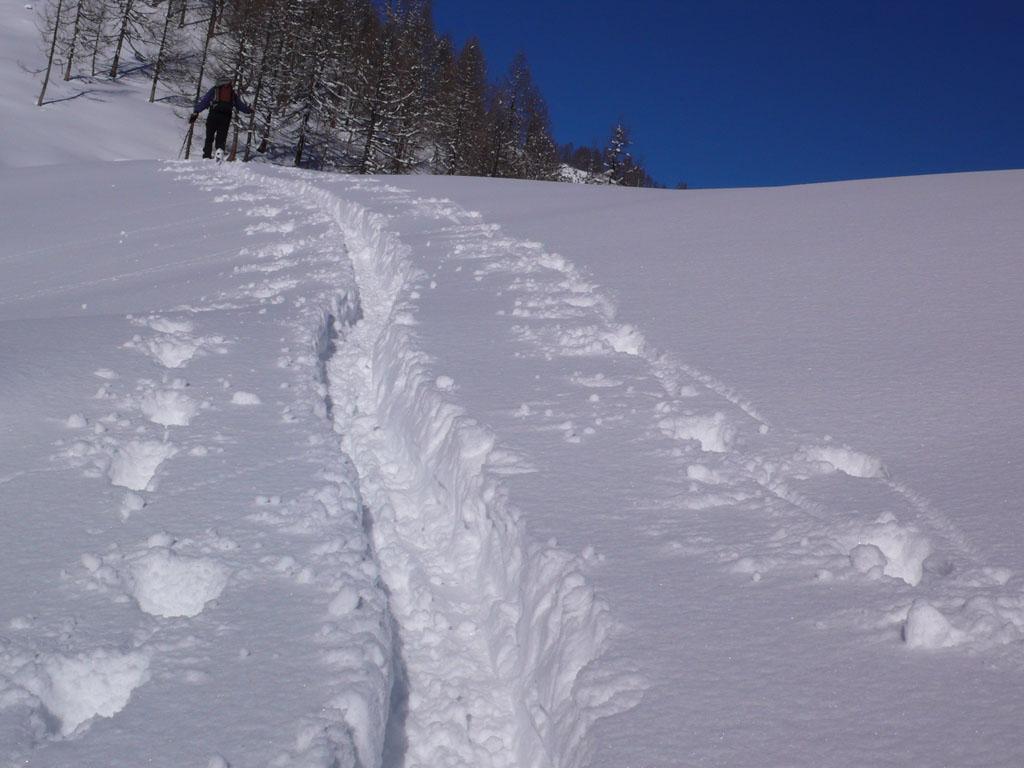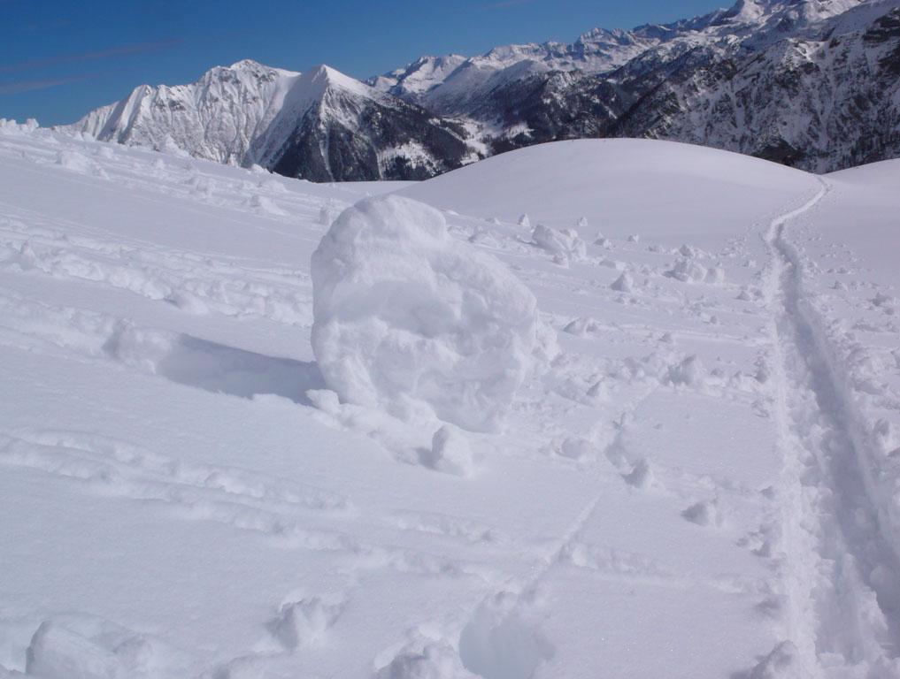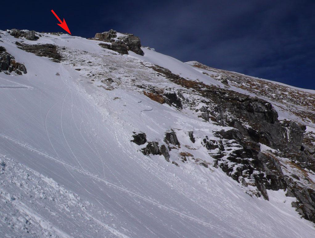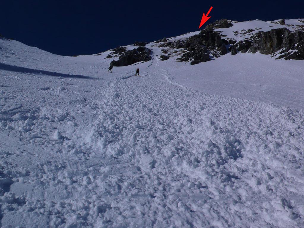 Schneeverhältnisse: ca. 15cm Neuschnee beim Start (ca. 1100hm) und 30 bis 40cm oben, wenn kein Wind im Spiel war. Am exponierten Gipfelgrat hat der Westwind nicht viel vom Neuschnee übriggelassen. Durch die warmen Temperaturen am heutigen Tag konnte die Sonne in südseitigen Lagen dem Schnee schon am Vormittag zusetzten. Soll heißen: südseitig starke oberflächige Anfeuchtung (siehe Bild:Kugel). Schon beim Aufstieg konnten wir aus steilen Südseiten einige selbstausgelöste kleine Schneebrettabgänge aus sicherer Distanz live beobachten. Einem anderen waren wir näher (siehe Bilder).