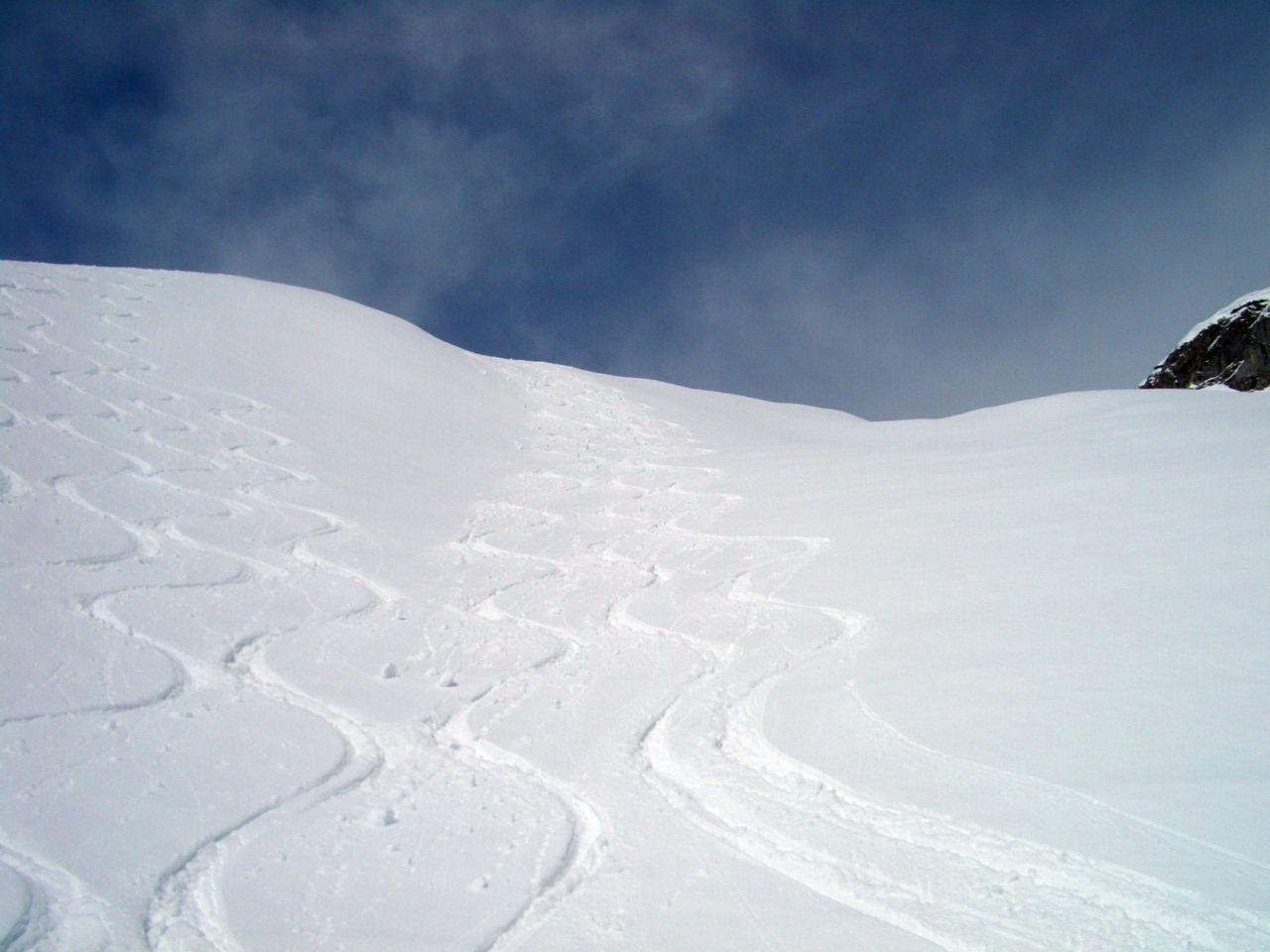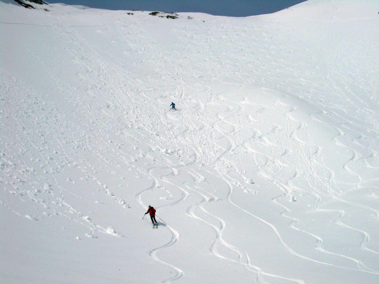 Tourziel der altbewährte Hochkarfelderkopf. Aufstieg um 7.45 Uhr beim immer freundlichen Ruggbauern nach einem kleinen Schwätzchen bei bewölkten Himmel aber schon sehr warm. Man darf immer bei seinem Hof parken, das ist nicht selbstverständlich, und man sollte es aber nicht auf der Wiese neben der Straße tun. Gut zu gehende Aufstiegsspur, wenn auch ein wenig steil angelegt. Abfahrt um 11.00 Uhr bei ausgezeichneten Firnverhältnissen. Wir wählten die Abfahrt Richtung Wasserfall, dann aber rechts in die Waldabfahrt.