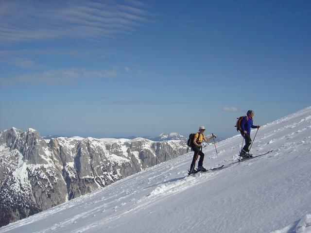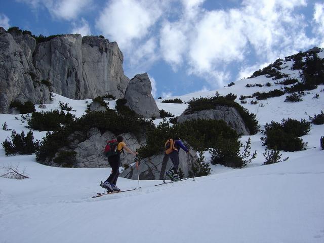 Bei sich zunehmend besserndem Wetter stiegen wir von Hirschbichl-Reubl über den Sommerweg auf den Karlkogel und weiter auf das Kammerlinghorn. Die Schi mußten wir ca. 20 Min. tragen. Da die Schneedecke während der Nacht nur oberflächlich gefroren war, fanden wir keinen tragfähigen Harschdeckel vor. Bei der Abfahrt gab es daher zum Teil Bruchharsch und im unteren Teil Sulzschnee.