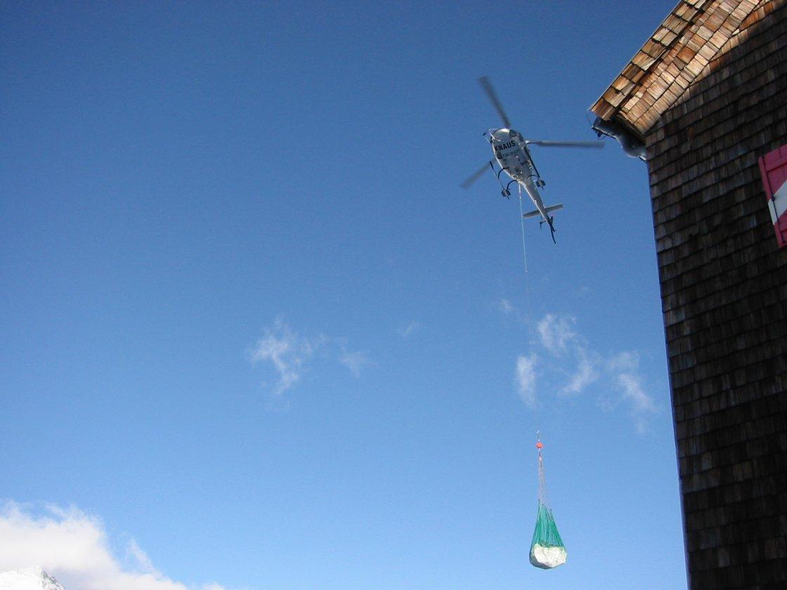 Kürsingerhütte 2004-04-02 Hüttenwart Ing. Christian Schmuck organisiert den 2.Versorgungsflug auf die Kürsingerhütte ( ÖAV). Der Aufbau der Infrastruktur einer Schutzhütte ist nach einer Woche abgeschlossen. (Gas, Wasser und Strom sind eingeleitet) Die Schutzhütte ist jetzt gut beheizt und Wirt Josef Hetz begrüßt die Alpinisten, welche nach einer schönen hochalpinen Tour zurückkehren, auf das Herzlichste.
