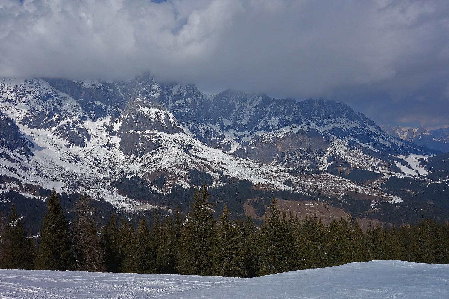 Von Mühlbach/Hk. über die Ostabfahrt zum Schneeberg, Liftbetrieb Werkstag geschlossen, durchgehend noch reichlich Schneedecke, vom Auto weg eine 1000 Meter Tour ohne Güterweg. Heute großteils hart geblieben, ab ca.1700 m dünne Pulverschneeschicht, die Hänge ost/ nordseitig gerichtet, die Sonne gegen den kalten Wind keine Chance.