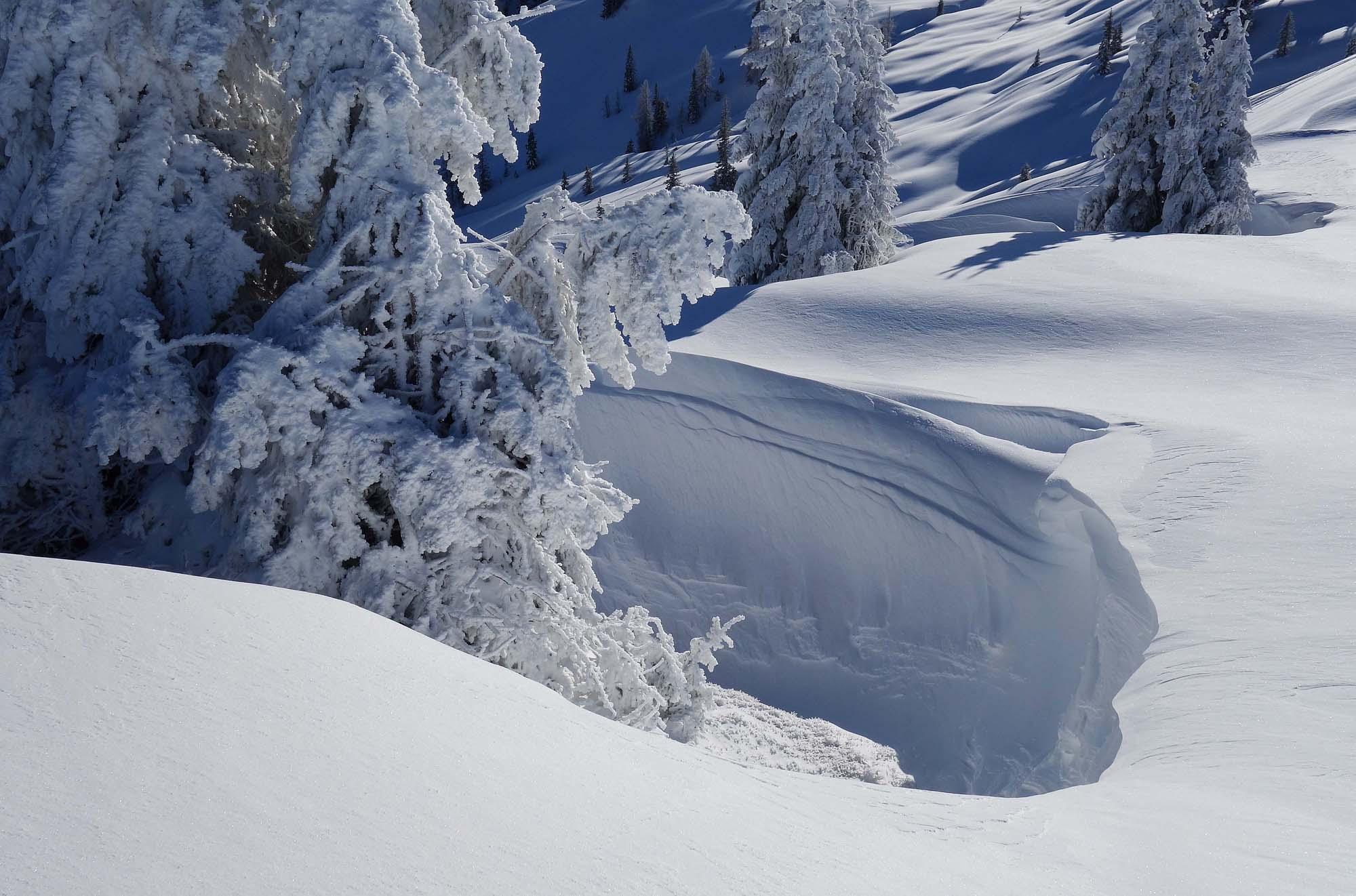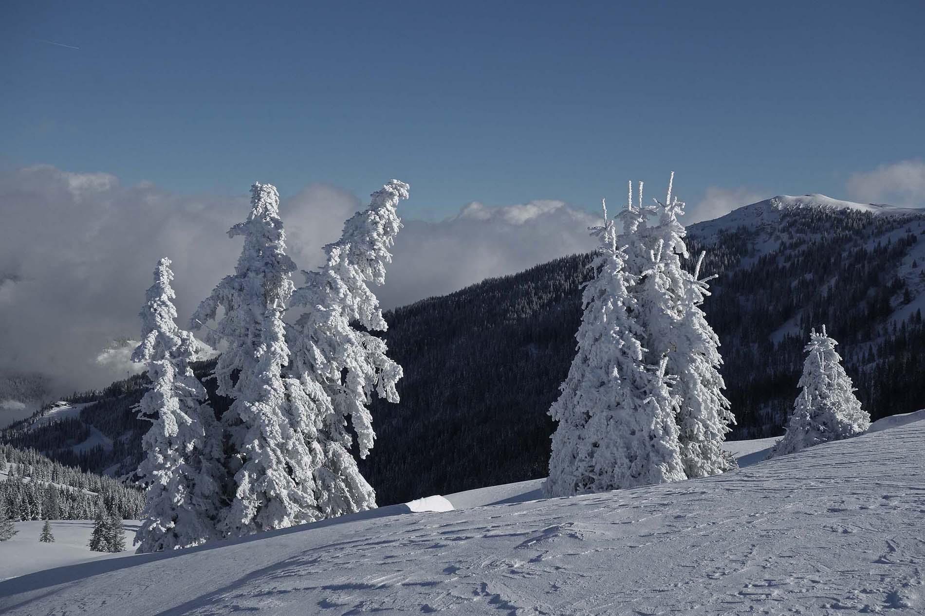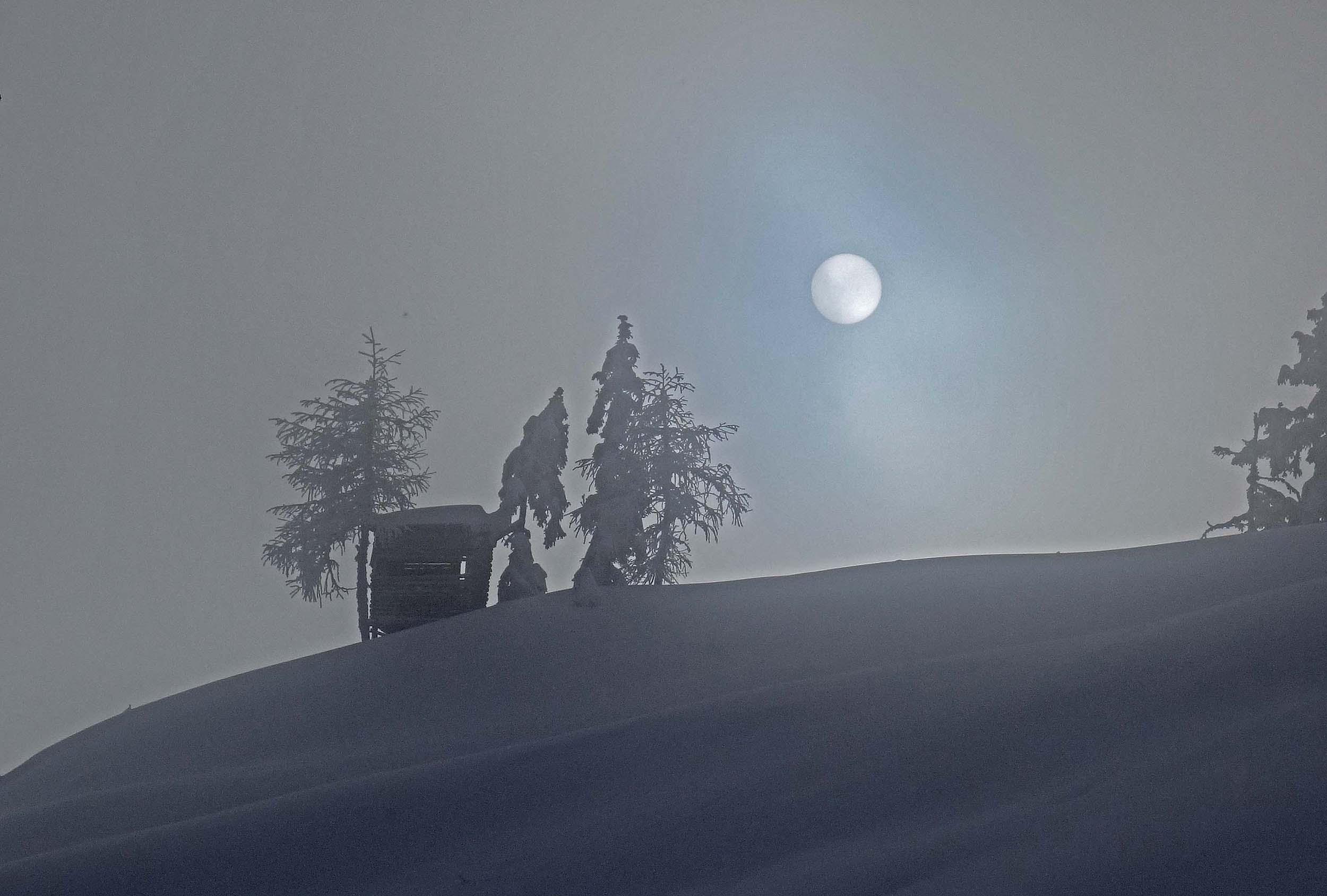 Unbeschreiblich schöne Winterlandschaft am Wege zum Kollmannsegg erlebt. Vom Birgkarhaus durch den Wald--eine tatellose Aufstiegsspur vorhanden--zum Dachegg und weiter zum Kollmannsegg. Wer bis jetzt noch nicht in weihnachtliche Stimmung kam, spätesten ab hier und heute kann man sich nicht mehr dieser Gefühle entziehen; im Tal die grünen Wiesen, hier tiefster Winter, das macht Eindruck. Am Birgkarsattel der übliche Wind, anfangs Nebel, die Sonne kündigt sich an.