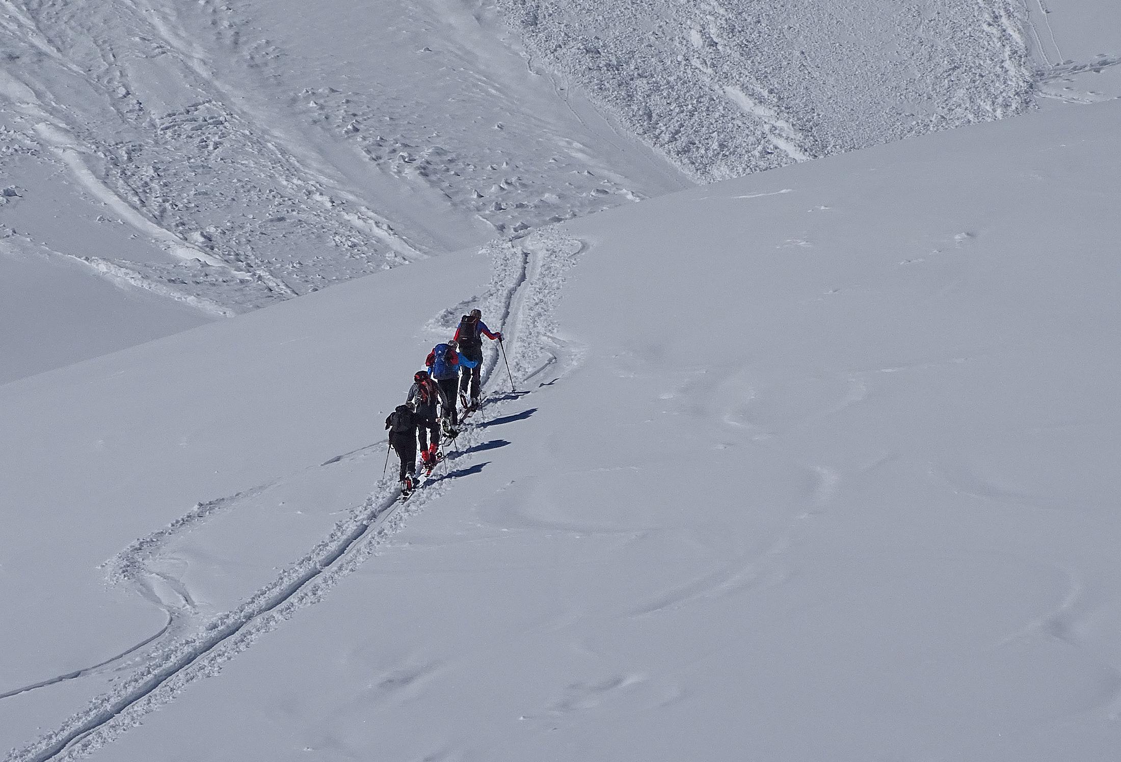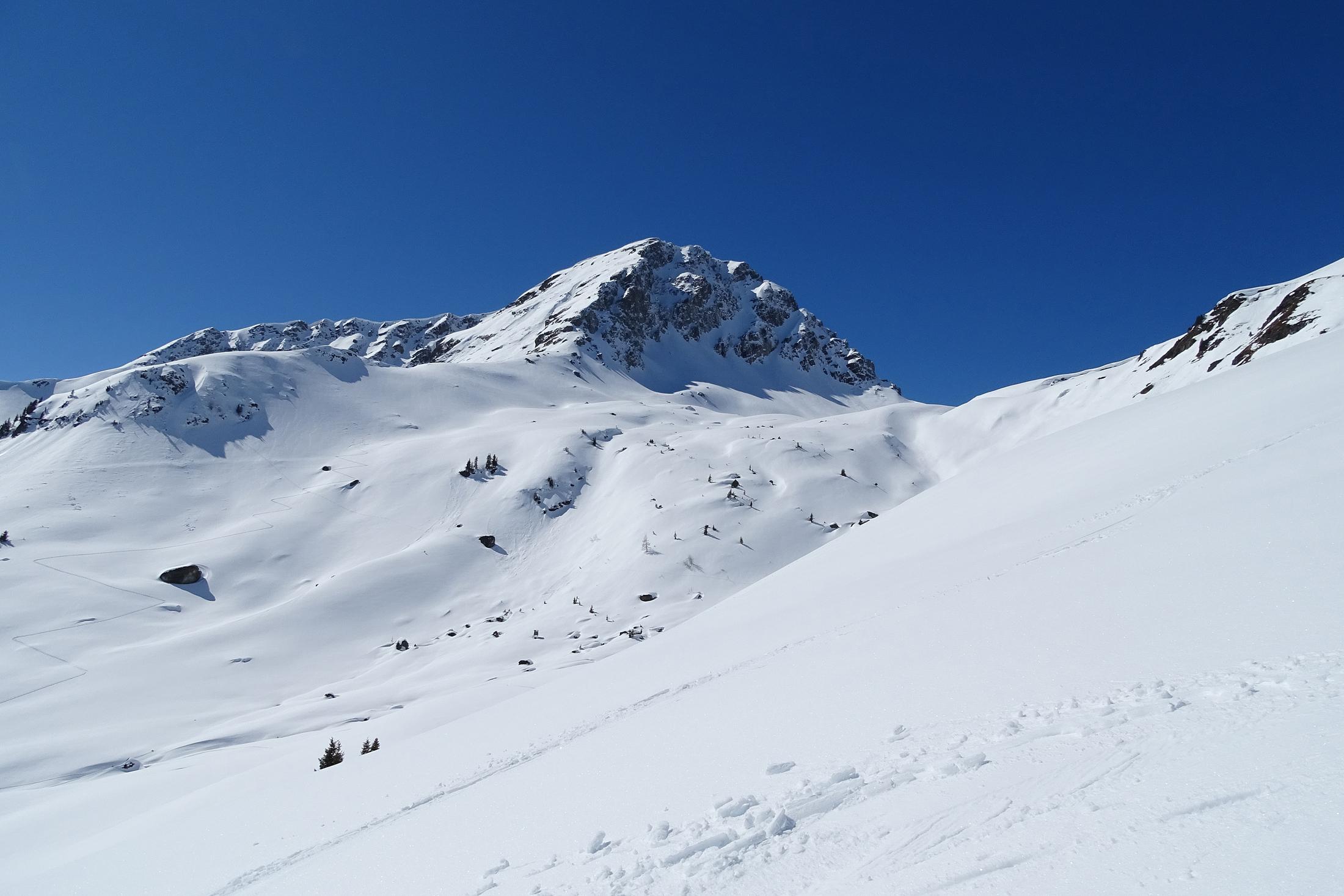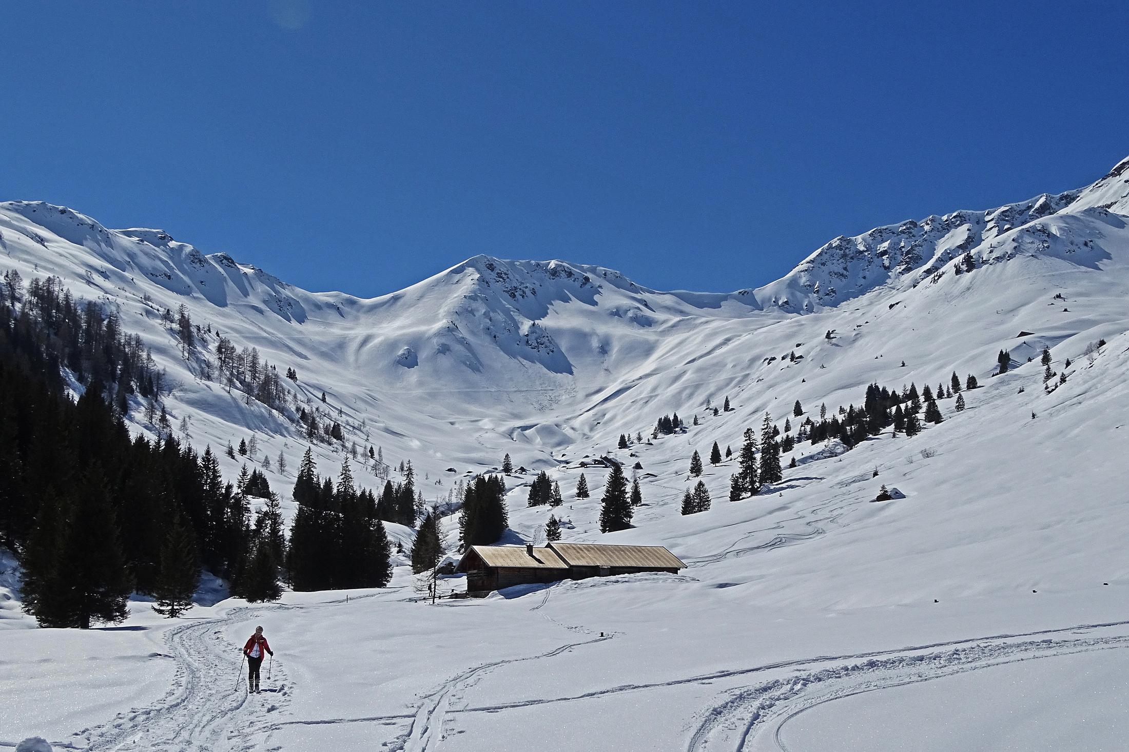 Vom Glemmtal über Saalhofalm zum Schusterkogel. Heute die besten Verhältnisse, sowohl Schneelage wie auch Wetter; auf kompakter Schneedecke zarte Pulverschneeauflage die später dann genussvolles Abfahren verschafft. Die weiten Hänge erlauben jeden seine eigene Spur, es reiht sich Hang nach Hang, also Platz für viele.
