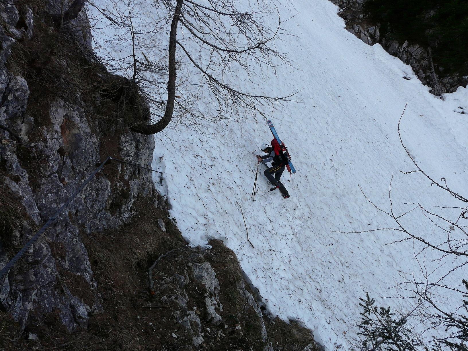 Abmarsch 06.10h von der Baumschlagerreith (Talschluß Hinterstoder) im Kreise vieler Tourengeher - schätze an die 100 Leute - zur Poppenalm und bis zur Abzweigung zum Sigistal. Die Schneegrenze haben wir kurz vorher nach etwa 1 1/2 Stunden Skitragen und ziemlichem Schwitzen erreicht. Wir biegen nun links ab Richtung Salzsteigjoch. Die Seile sind teilweise noch unter dem Schnee und es sind steile Rinnen zu queren -