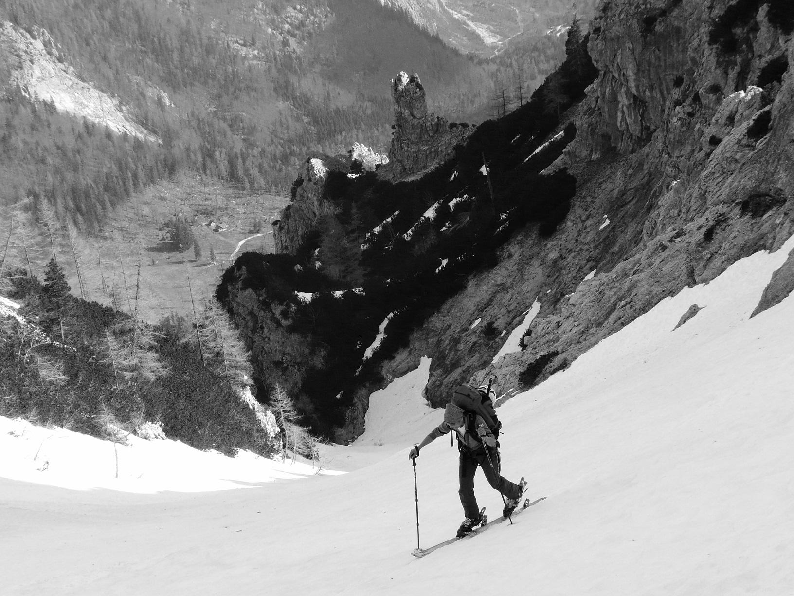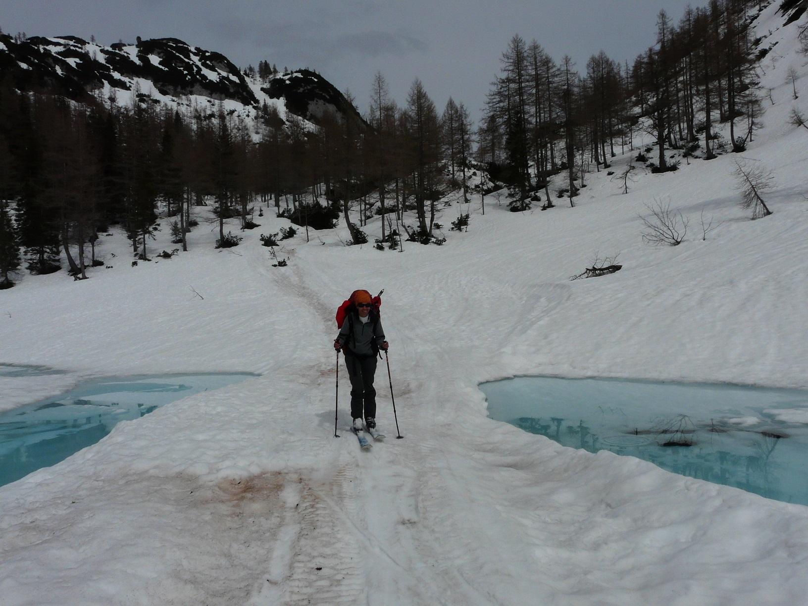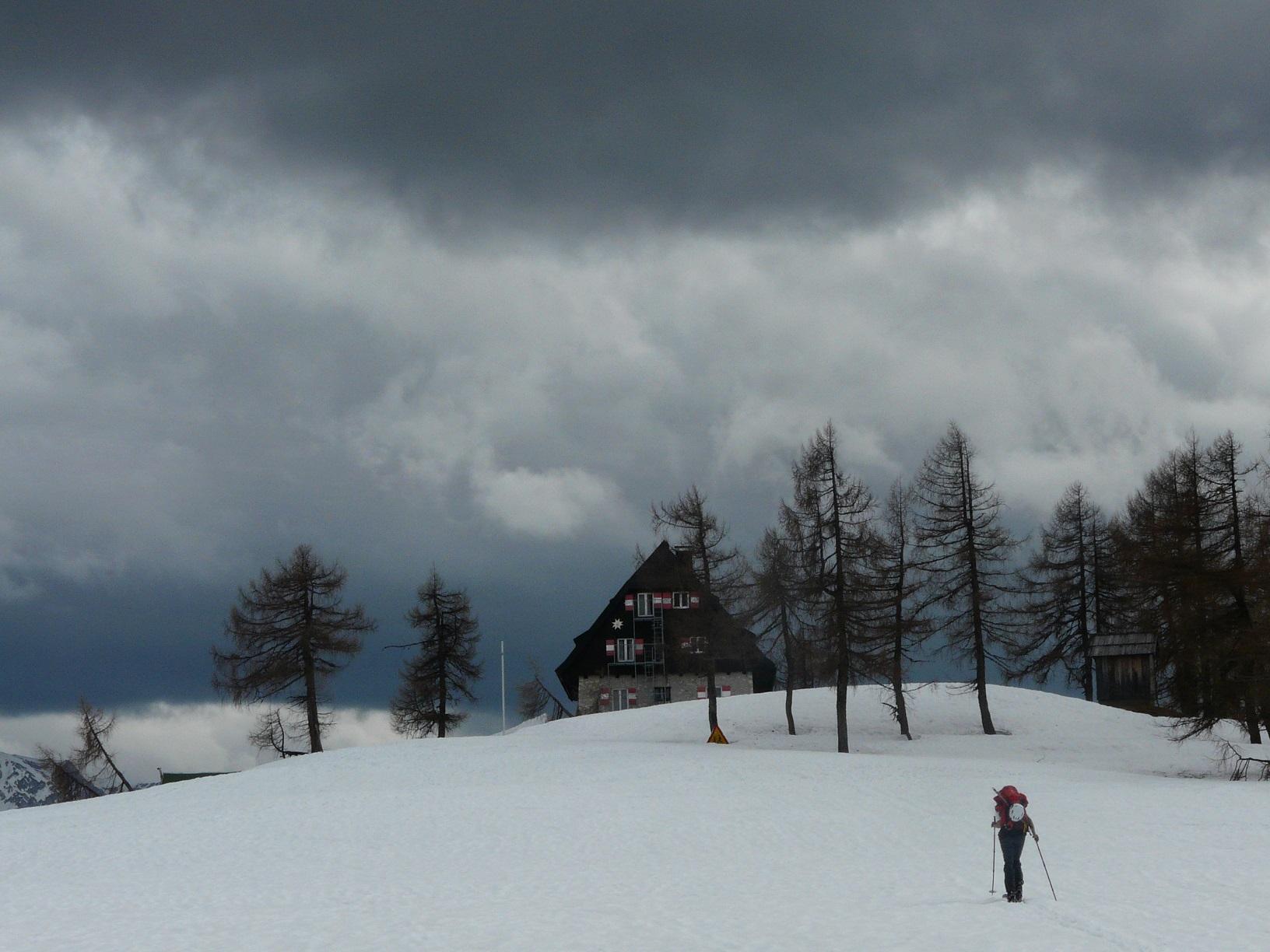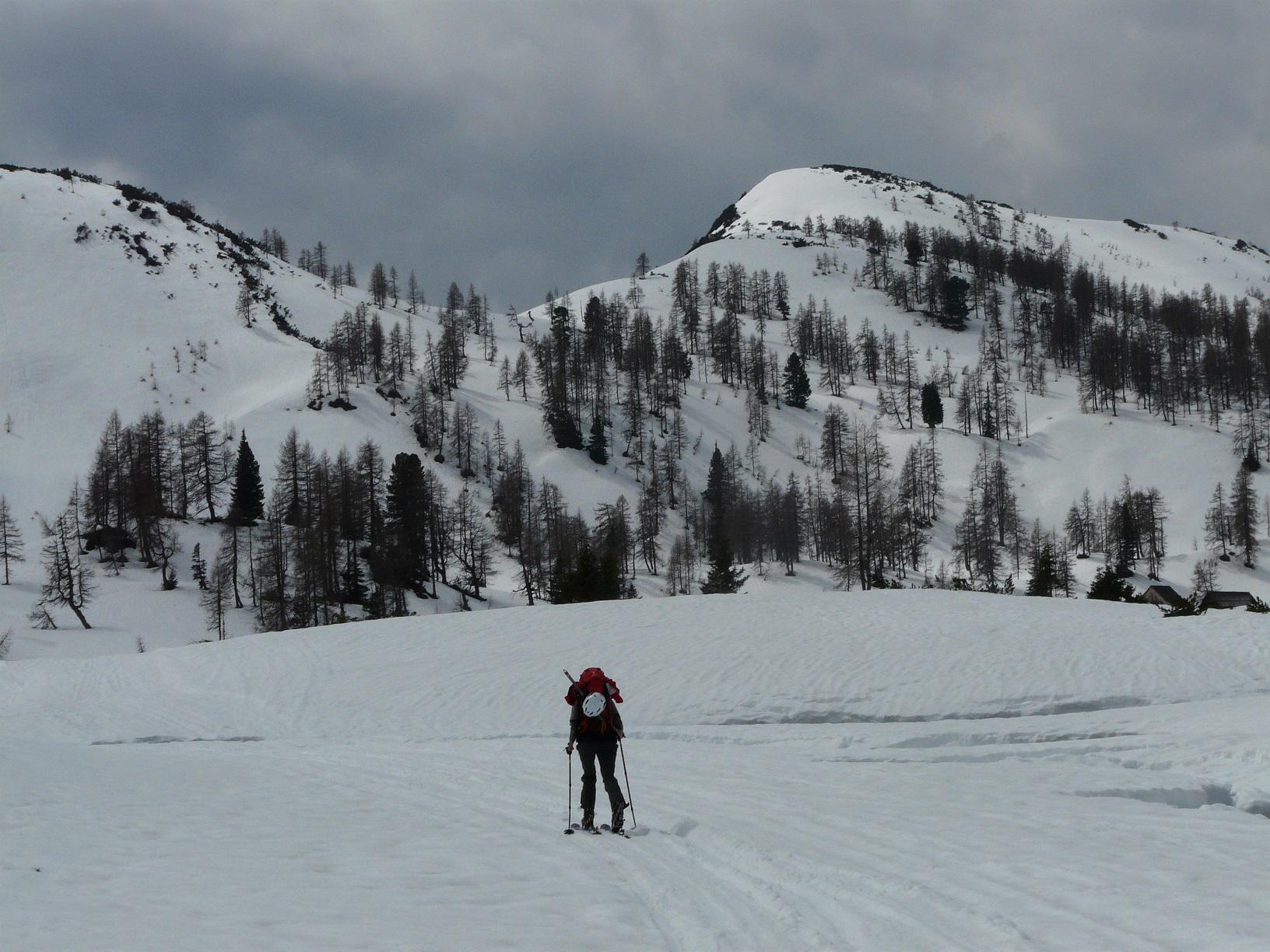 Stufenschlagen - geht heute ohne Steigeisen. Ein Pickel kann hier gute Hilfe leisten - oder ohne, dann steigt der Adrenalinspiegel sprunghaft an. Zuletzt recht steil mit den Ski hinauf aufs Joch. Weiter die SW-Hänge queren zum Gamsstein, Wetter und der nicht mehr ganz optimale Gipfelhang vom Almkogel lassen uns mit dem Gamsstein(1996m) zufrieden sein, der Südhang ist ohnehin schöner. Abfahrt ins Weitenfeld und Wassergraben in Richtung Interhüttenalm. Skiwanderung durchs Klamml über Kamphütten bis kurz vor die Leistalm. Aufstieg zum Roßkogel (1.893m). Abfahrt über die grandiose Nordabfahrt zum Schwarz See. Weiter über Steirersee, Steirerseealmhütten zum Linzer Tauplitzhaus.