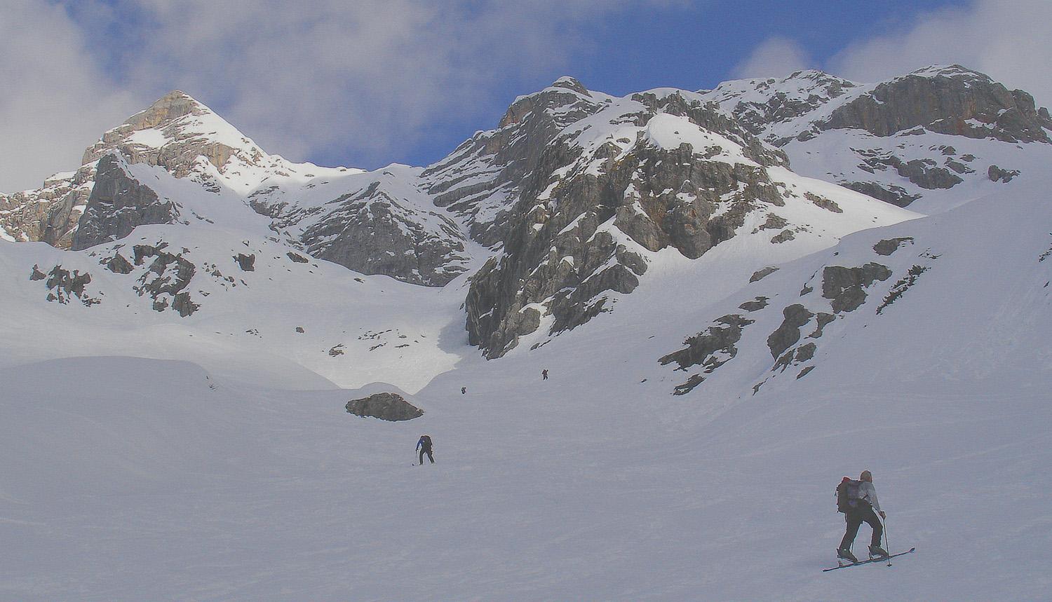 Laut Wetterbericht heute der letzte Sonnentag, die Buchauerscharte schon lange im Kopf, Wolfgang Tafatsch macht in der Seite Appetit auf diese Tour und so bin ich mit Freund Gernot am Wege. Früh unterwegs, die Sonne lässt auf sich warten, es bleibt während des gesamten Aufstieges hart, tiefe Abfahrtsspuren von "Spätberufenen" machen es auch nicht leichter, zu faul um die Harscheisen aus dem Rucksack zu nehmen, mit Armkraft wird ausgeglichen.