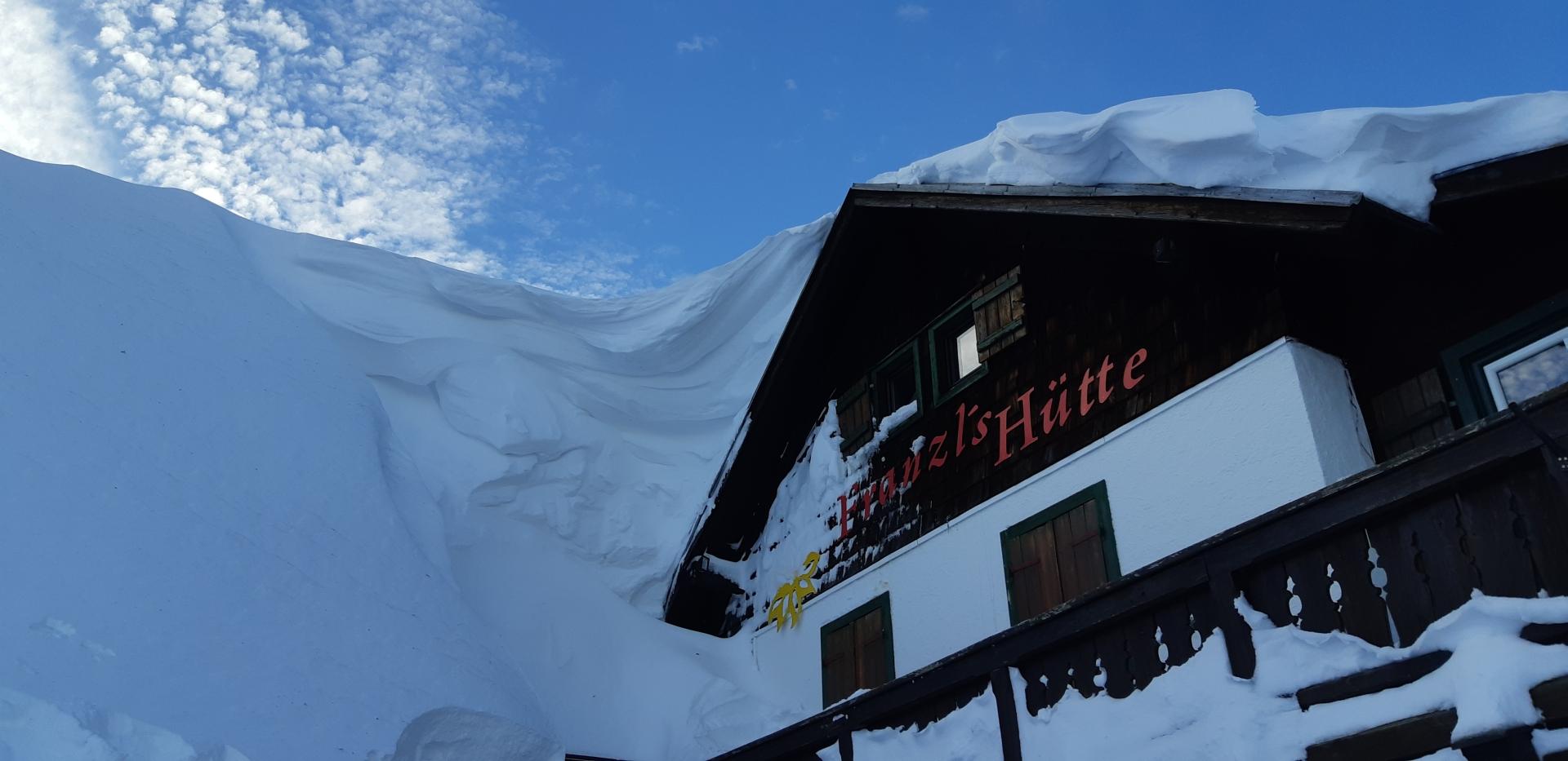 Dachlawine - da hängt noch was oben, die Sonnenterrasse wird wohl in nächster Zeit nicht eröffnet.