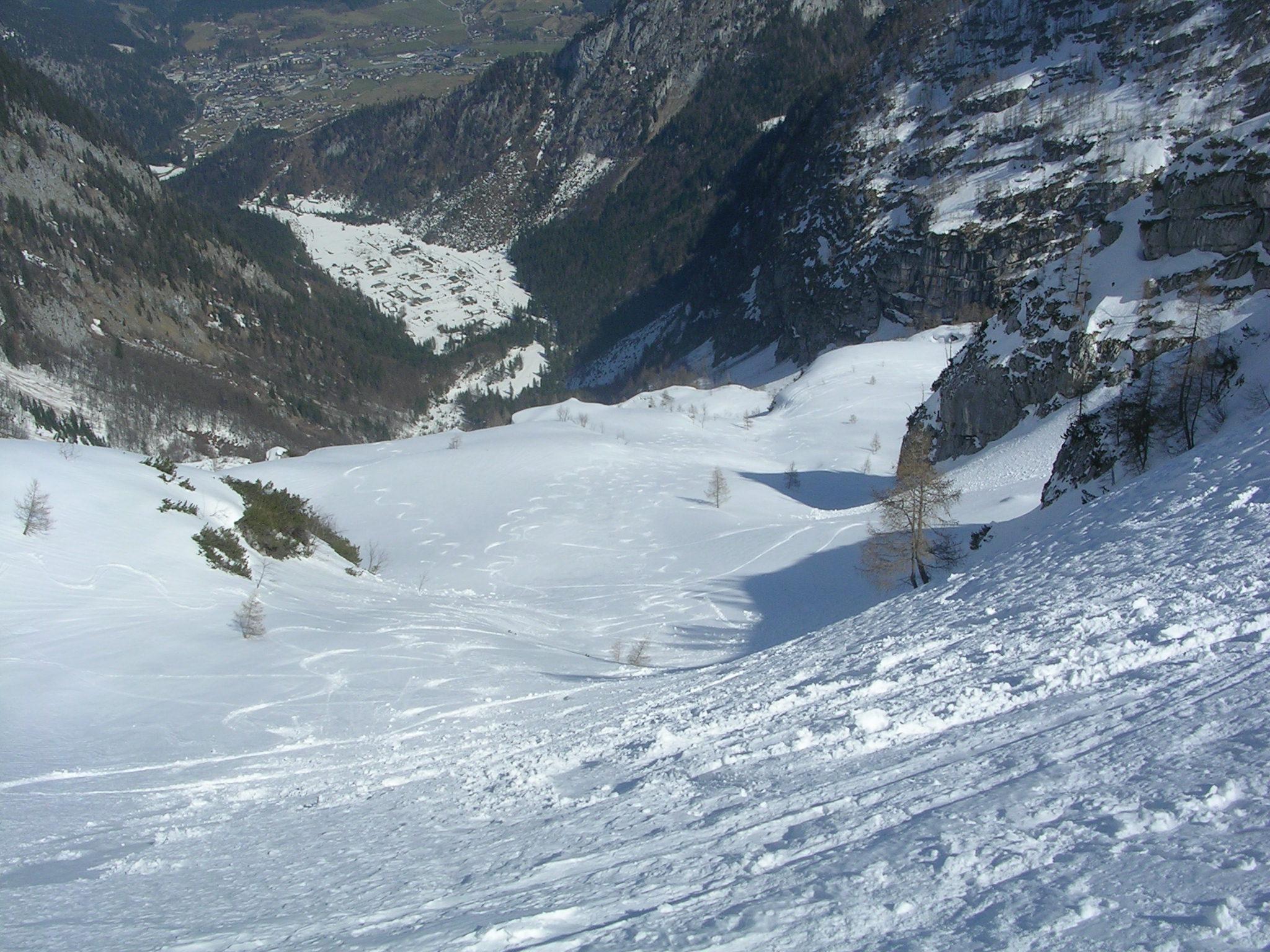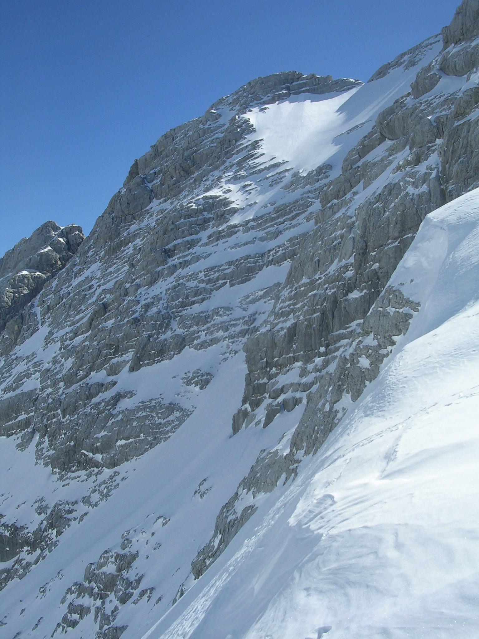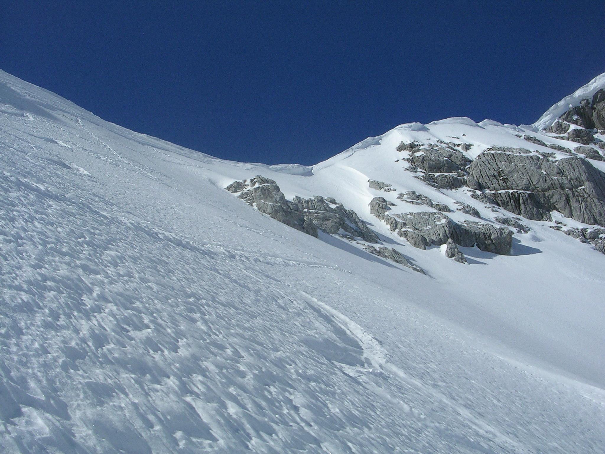 Die ersten 200 Hm waren brutal hart, mit Harscheisen grenzwertig, wäre nicht blöd gewesen, die Steigeisen anzulegen. Im unteren Teil des Kares in der Sonne war es dafür schon am frühen Vormittag durchgeweicht.