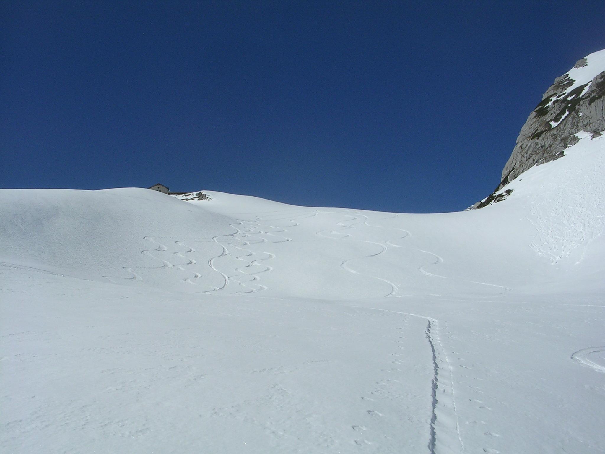 Die Pulverabfahrt vom Joch war dann das Highlight, aber auch unterhalb der Hütte gab es noch Pulverschnee. Danach etwas Firn, zu tiefer Firn und teilweise auch Bruchharsch.