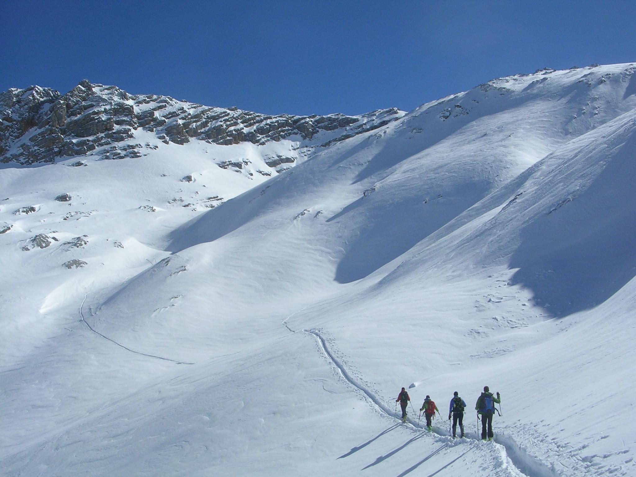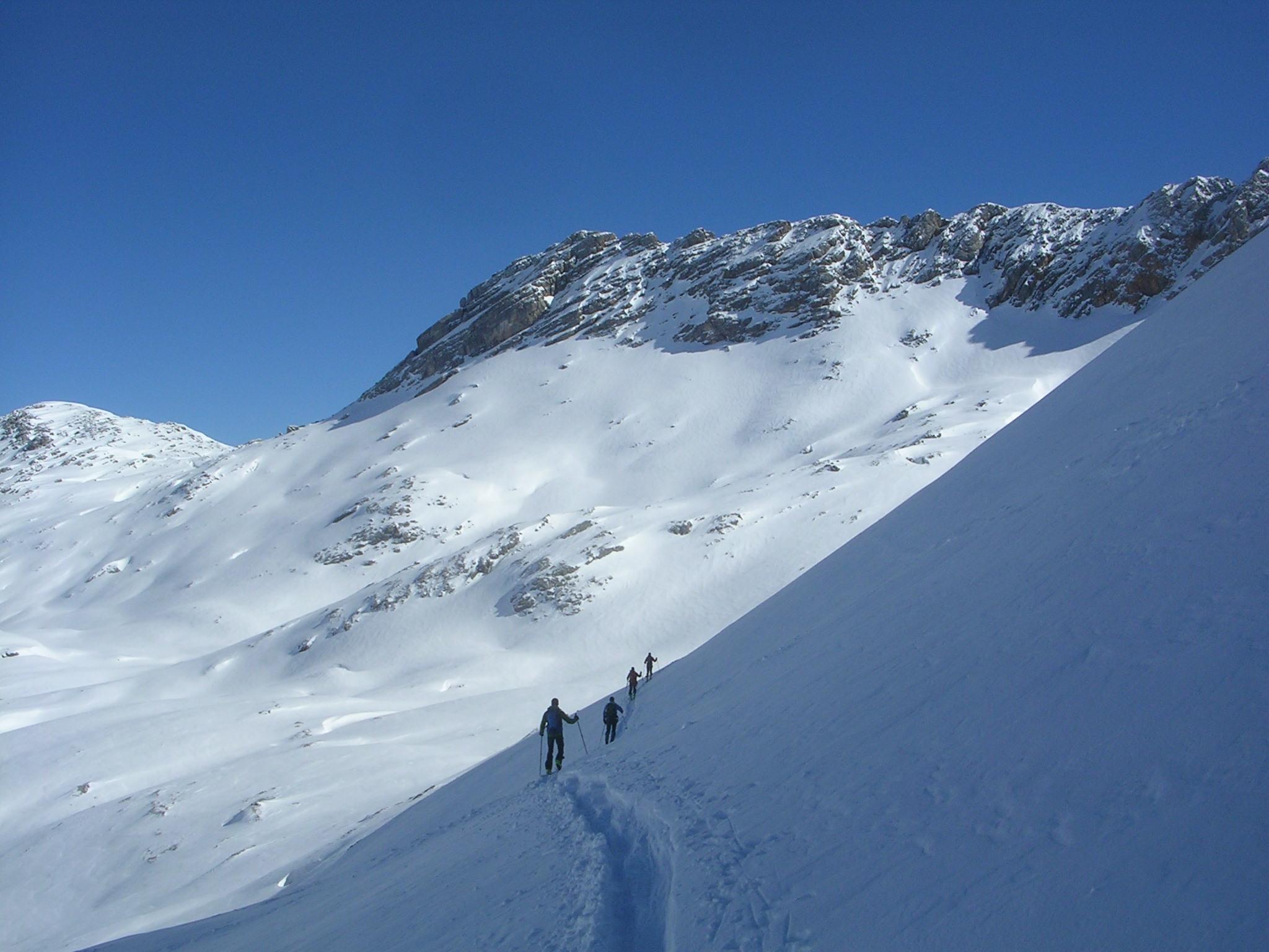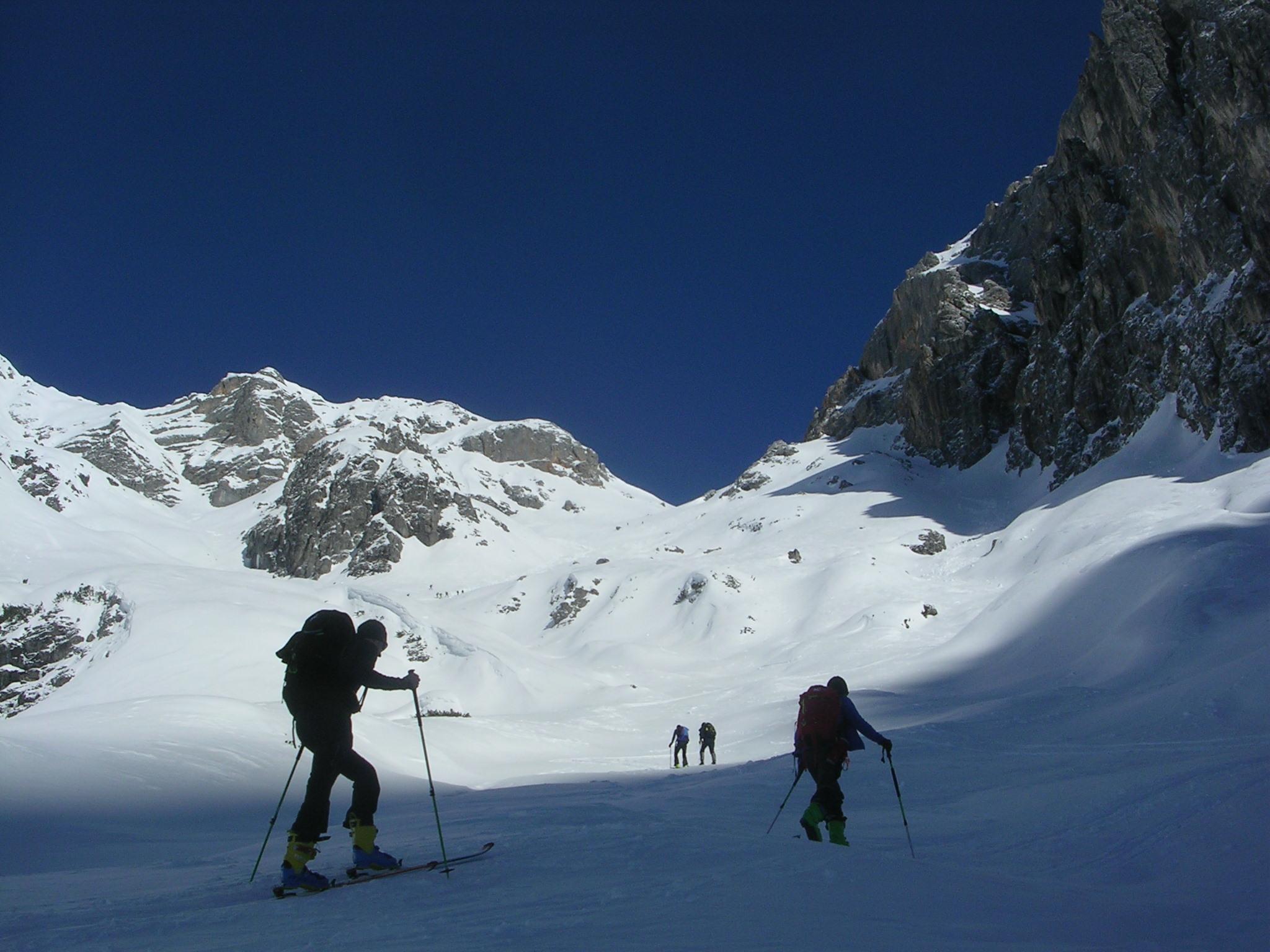 Schnee: Im oberen Teil windbehandelter Pulver, ab der Scharte zuerst eine Art Firn, aber weiter unten immer tieferer Baaz.