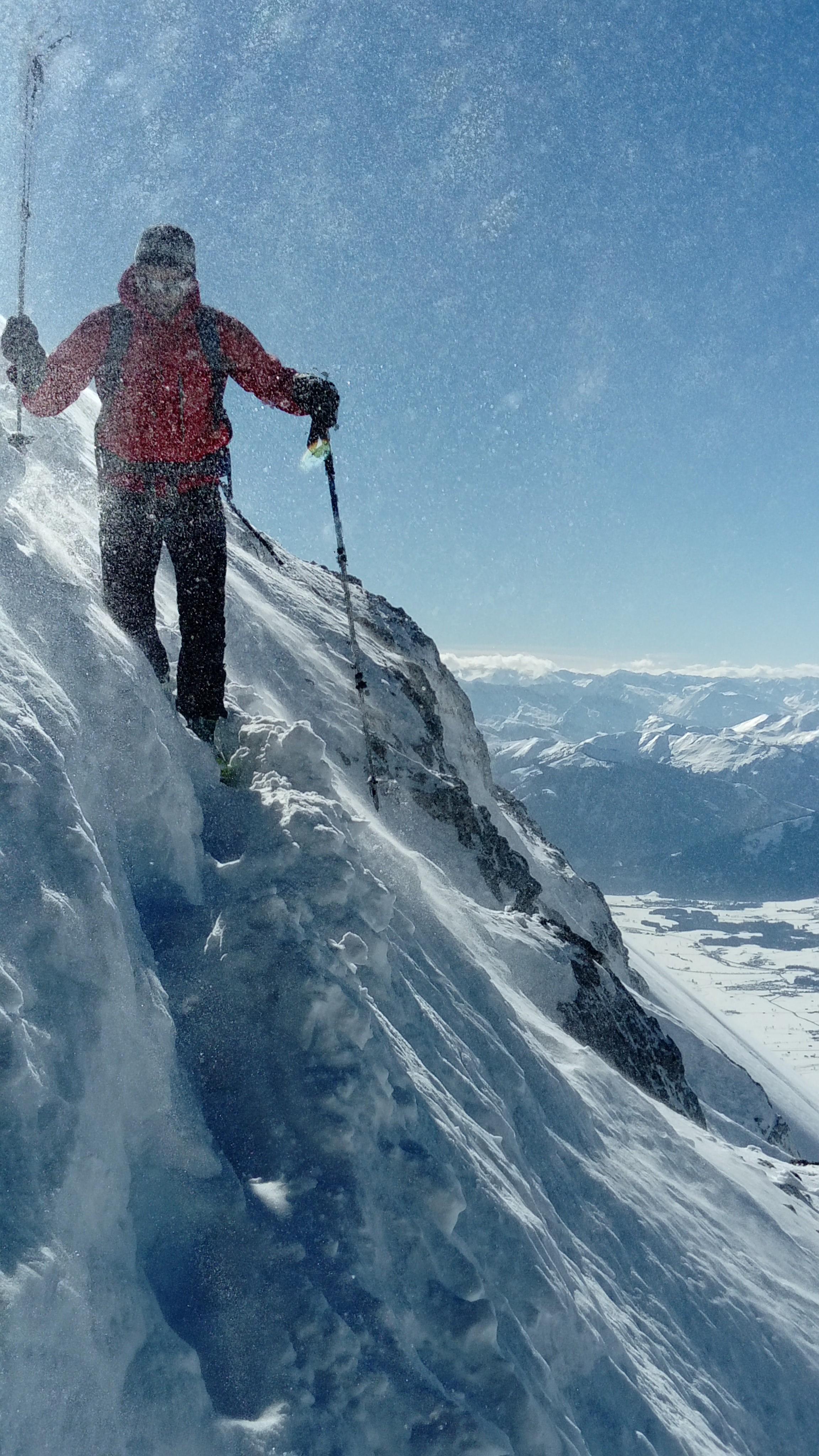 Im Mittelteil unterhalb der Buchauerscharte wurde es heute bei Windstille ziemlich warm. Ab der Scharte bis zum Selbhorn war es windig und kalt. Oben hat sich auch der Pulverschnee gut gehalten.