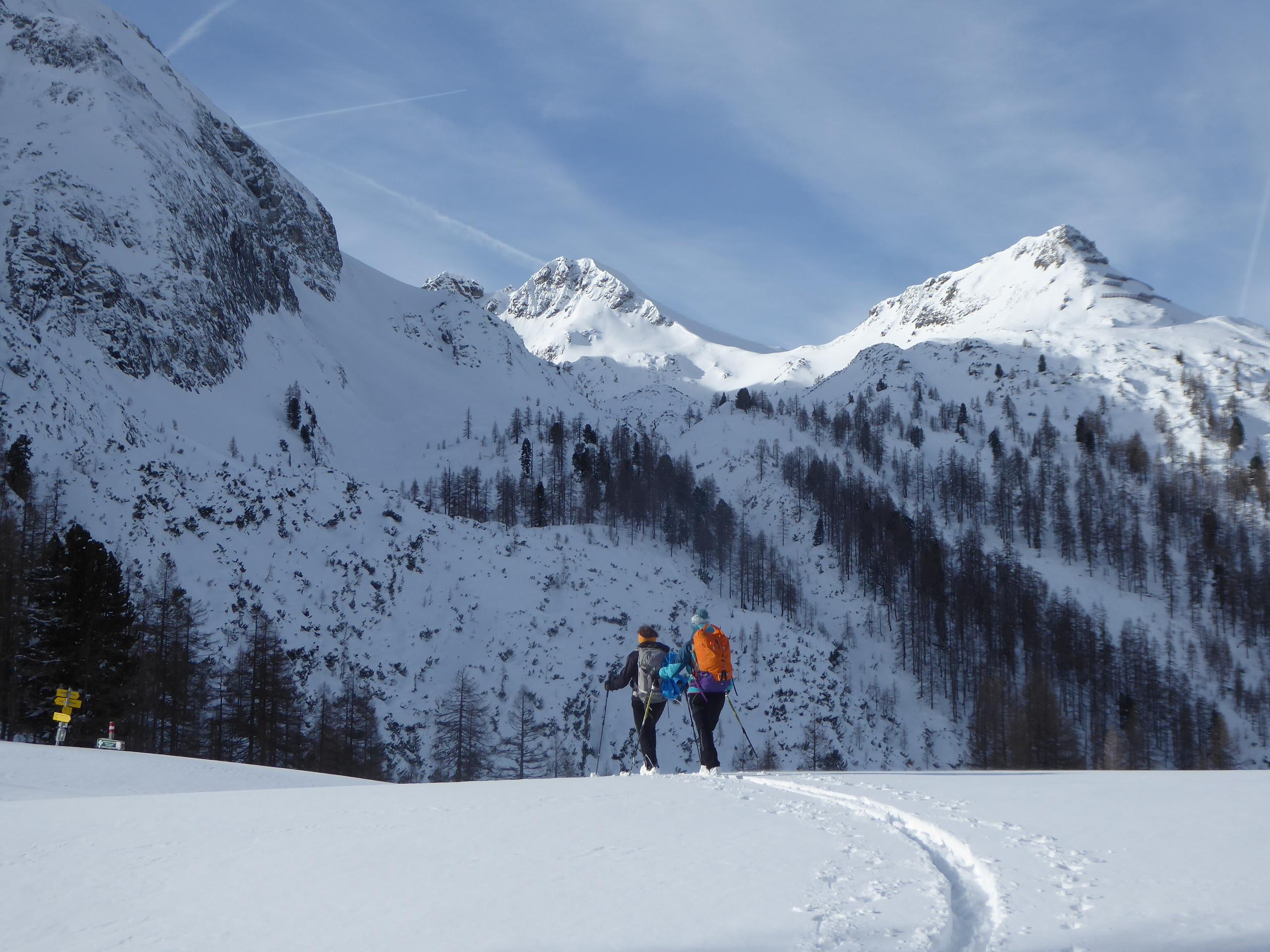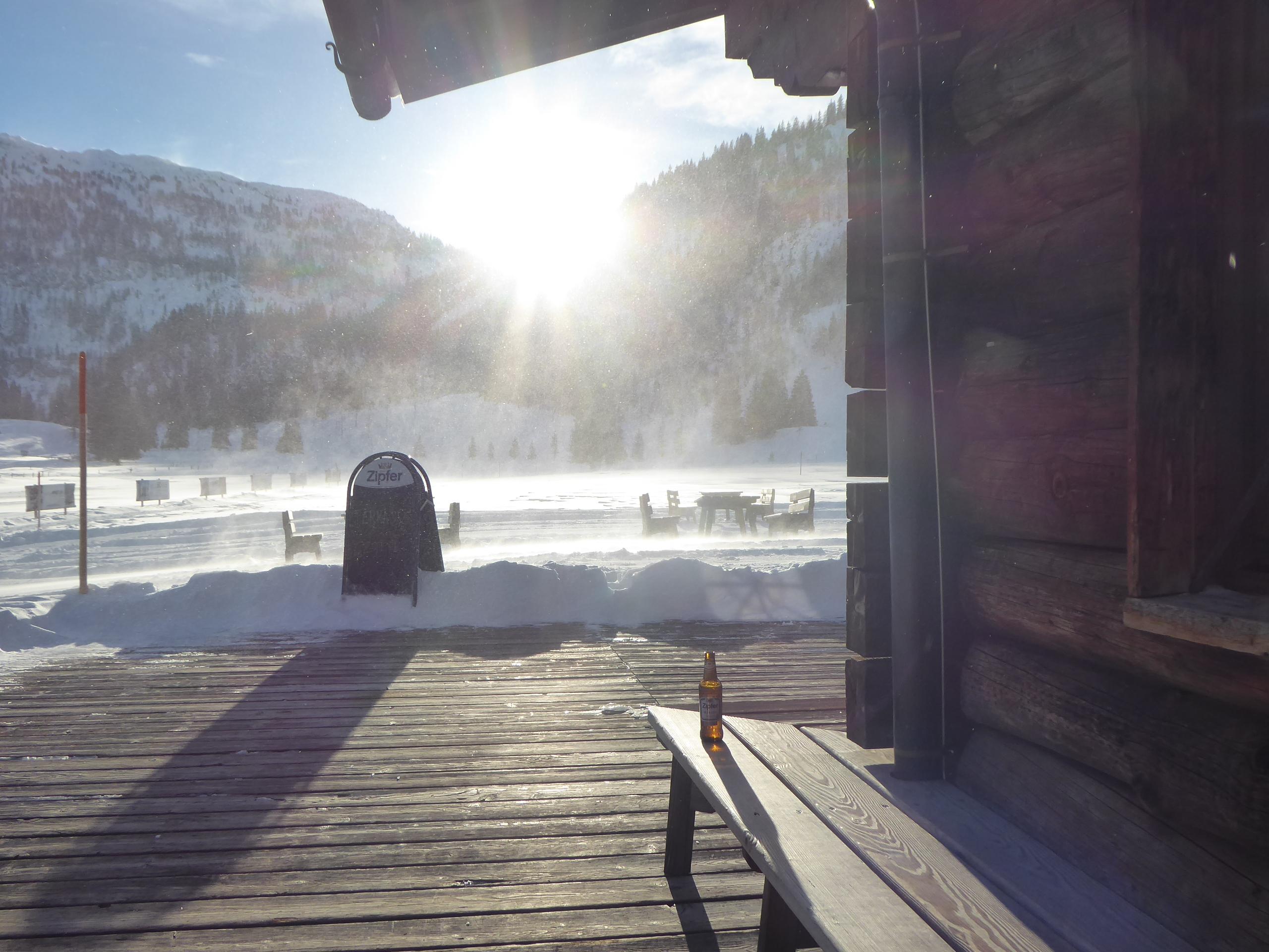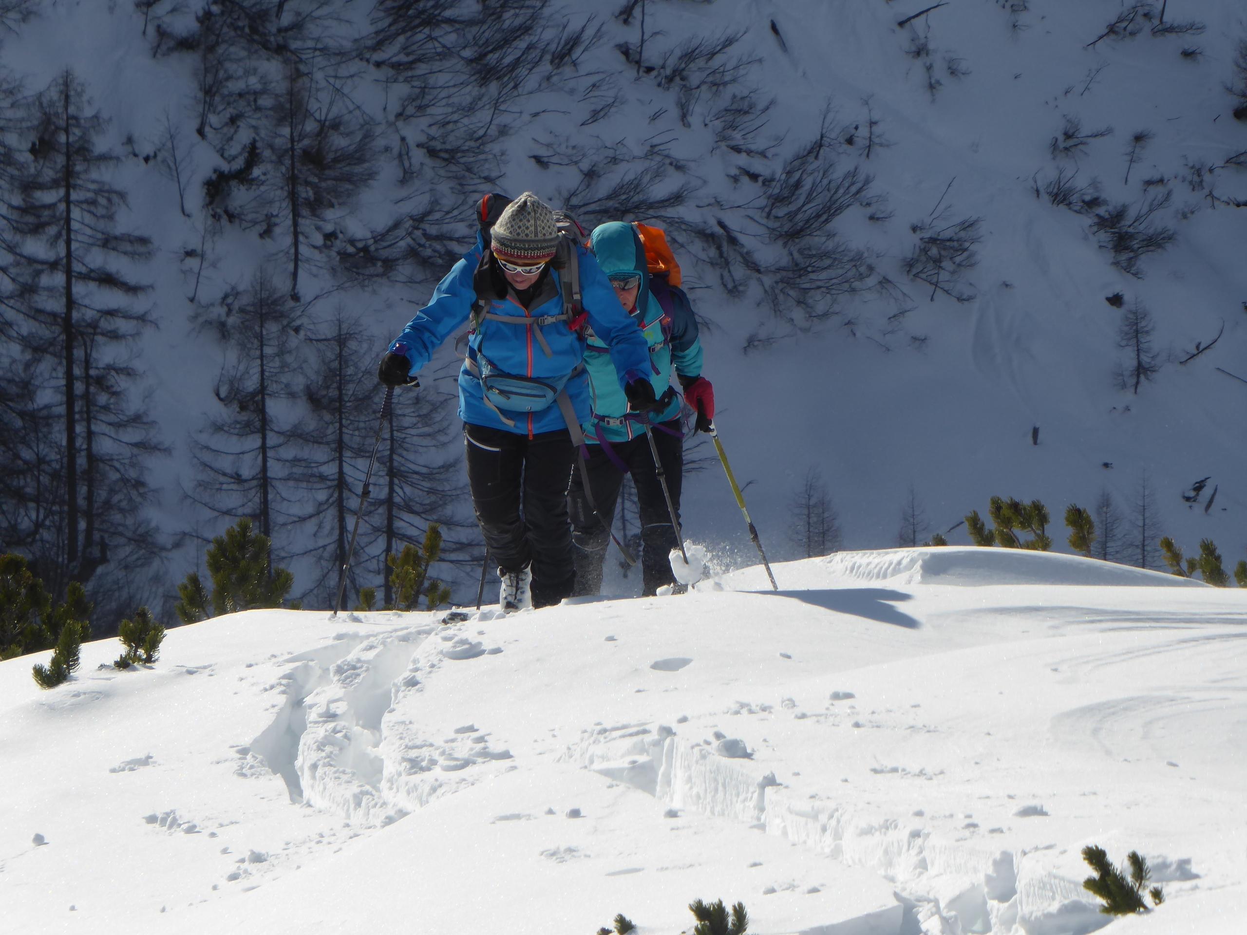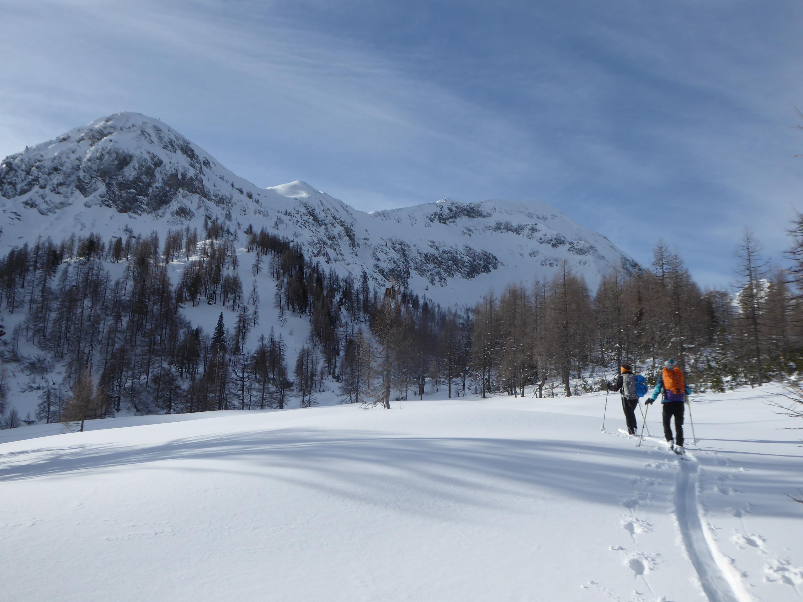 Schnee: Immer noch schön pulvrig in verschiedenen Verdichtungszuständen, wumm gemacht hat's auch nur noch zwei Mal und das im Flachen, ganz unten bei den Sonnenhängen zur Gnadenalm hatte der Schnee schon a bissl a Haut.