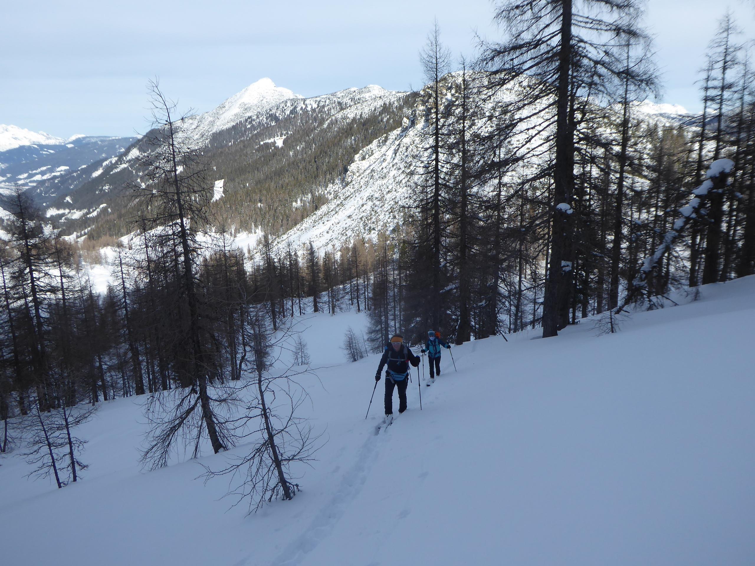 Defensives Rumstreunen über der Gnadenalm. Ein bisschen zum Gasselrain, ein Stück Richtung Bärenstaffel bis es zu steil wird, dann runter Richtung Oberzauchkaralm, Pause, Lawinenhunde-Ausbildungsübung zugeschaut, interessant, Wiederaufstieg zum Leckriedel und zurück zur Gnadenalm (Imbisse und Bierchen to go coronabestimmungskonform konsumiert). Schön war's. Abfahrtstechnisch natürlich nicht die große Orgie, aber zumindest waren wir den ganzen Tag allein, durften sogar das meiste einspuren, einfach Rumstreunen ist so schön kontemplativ...