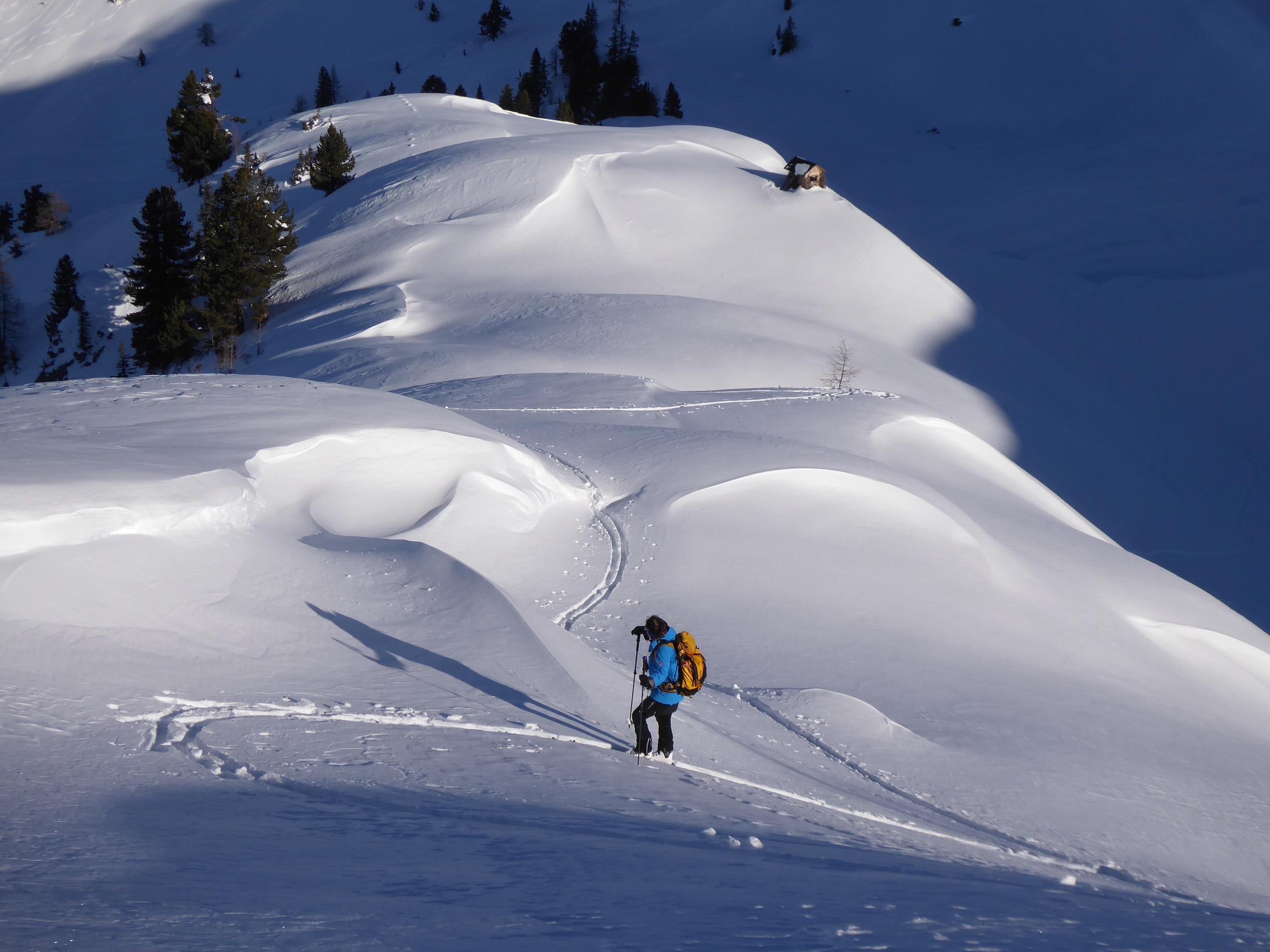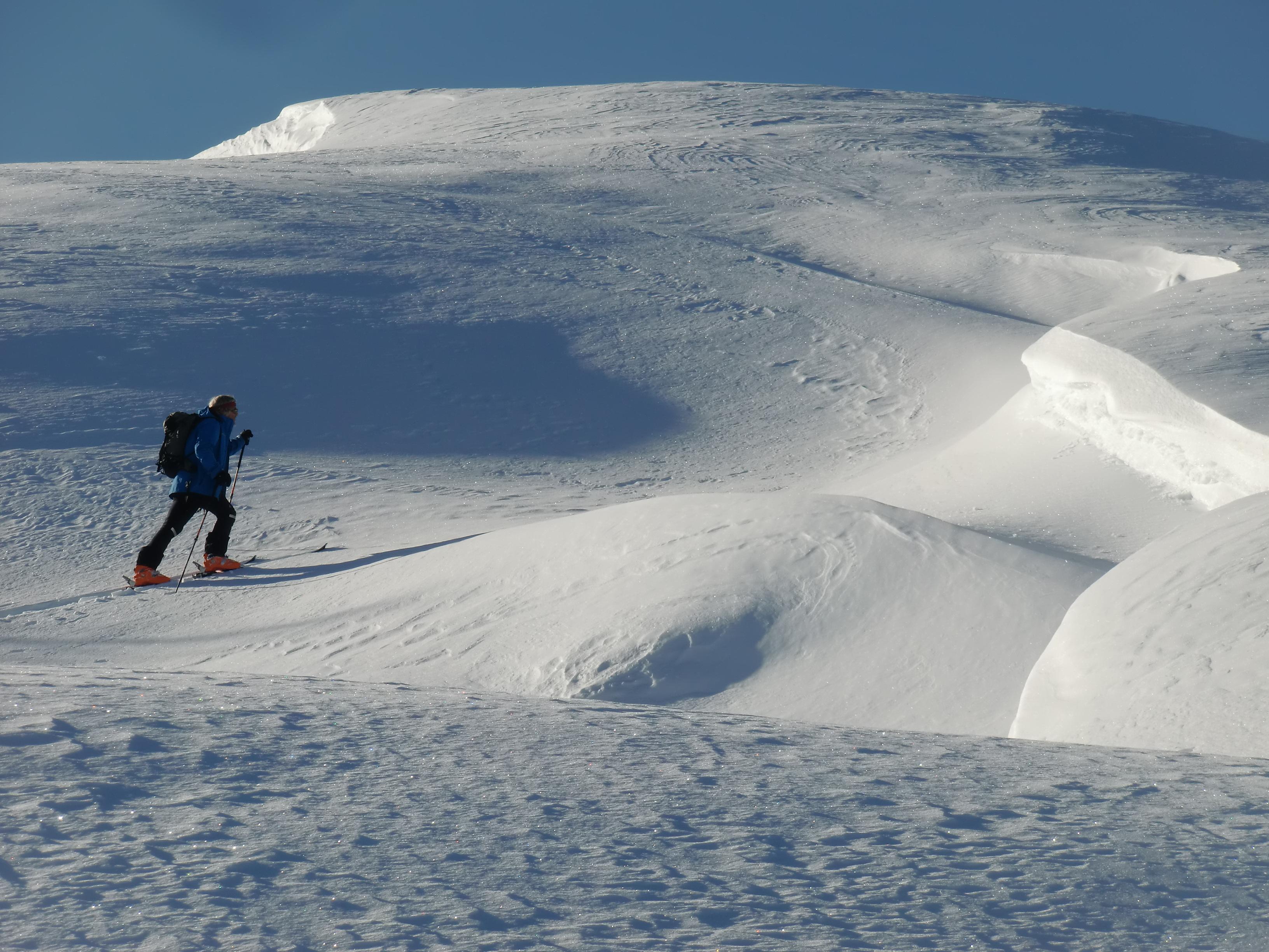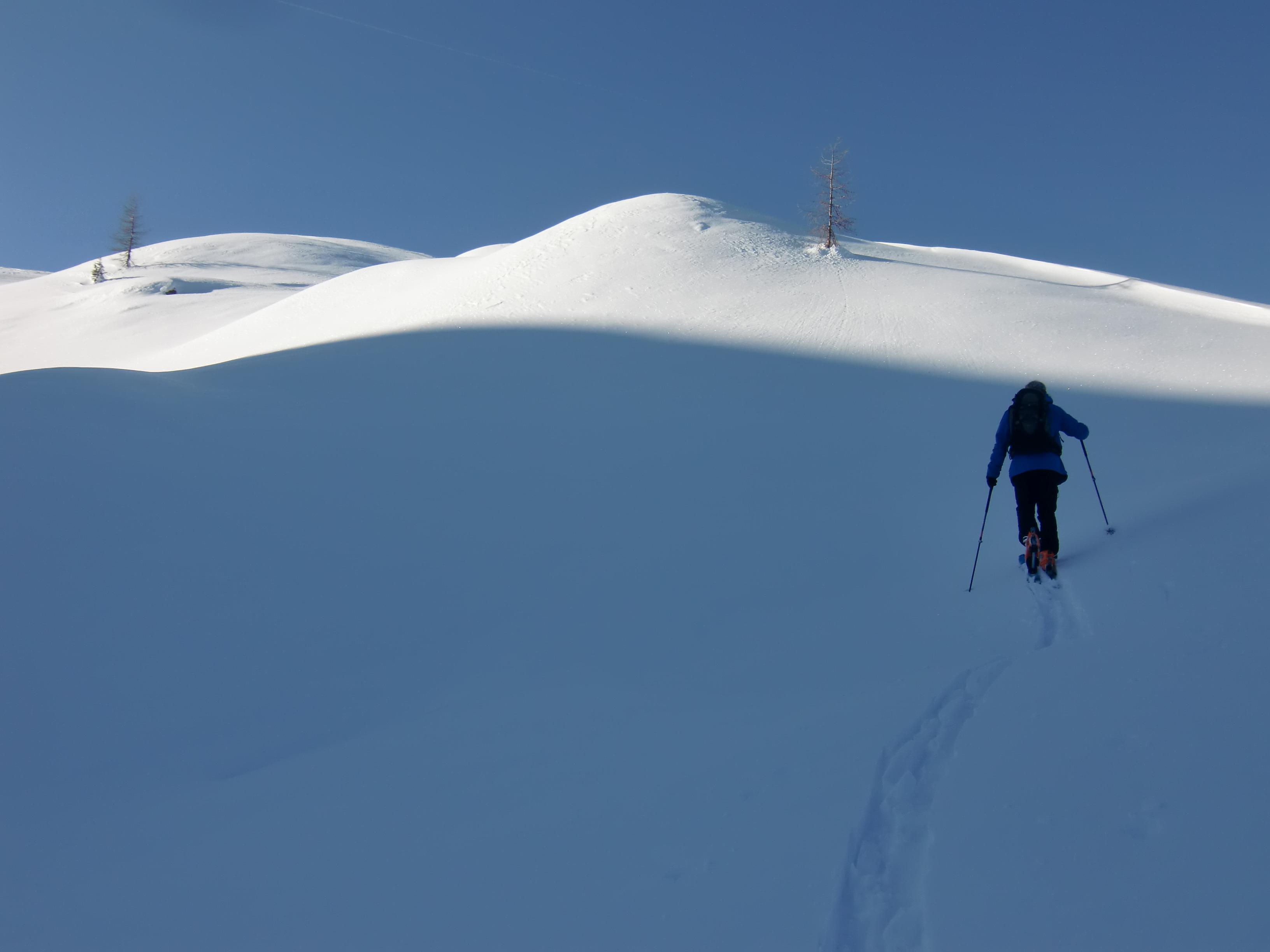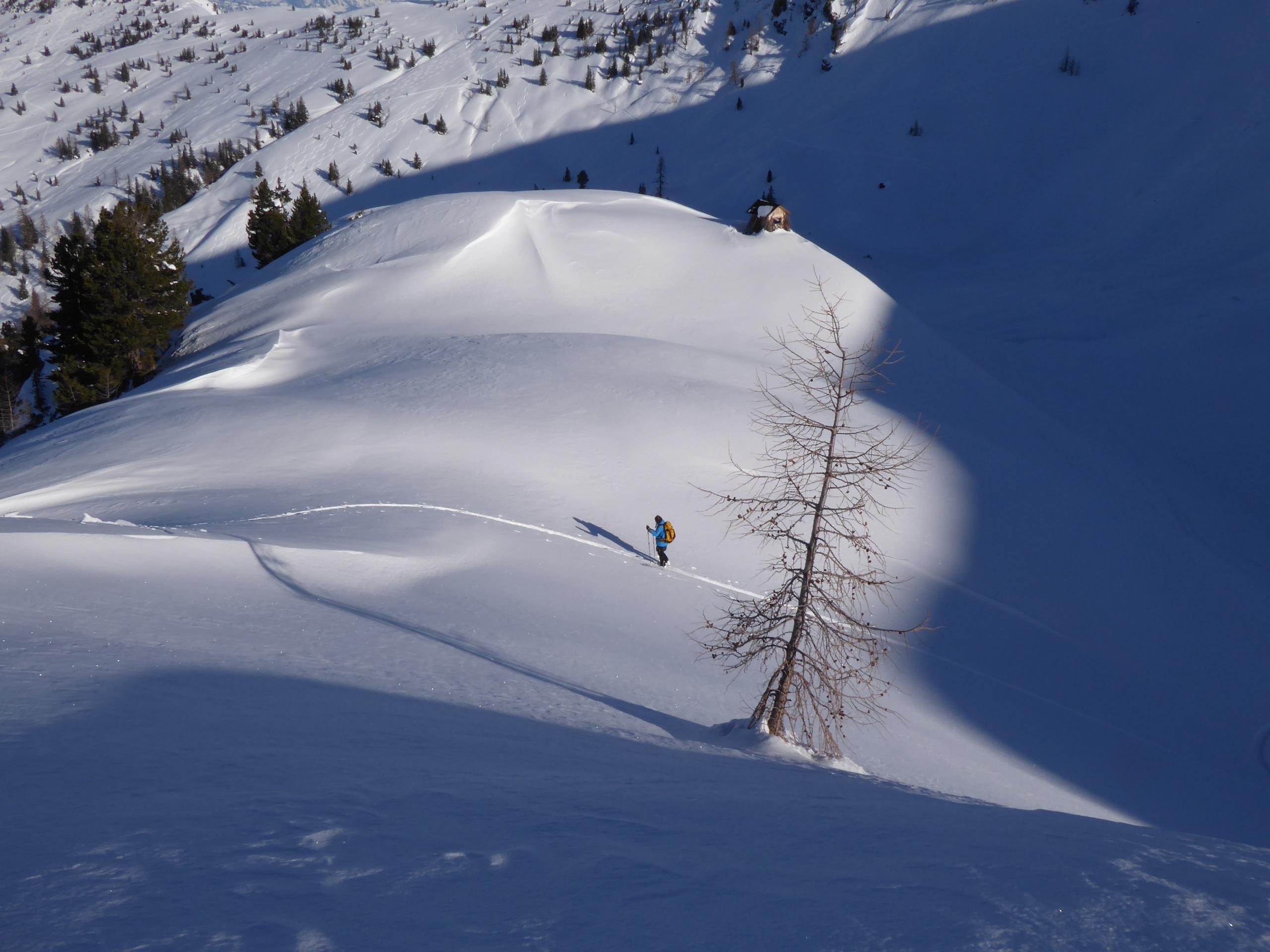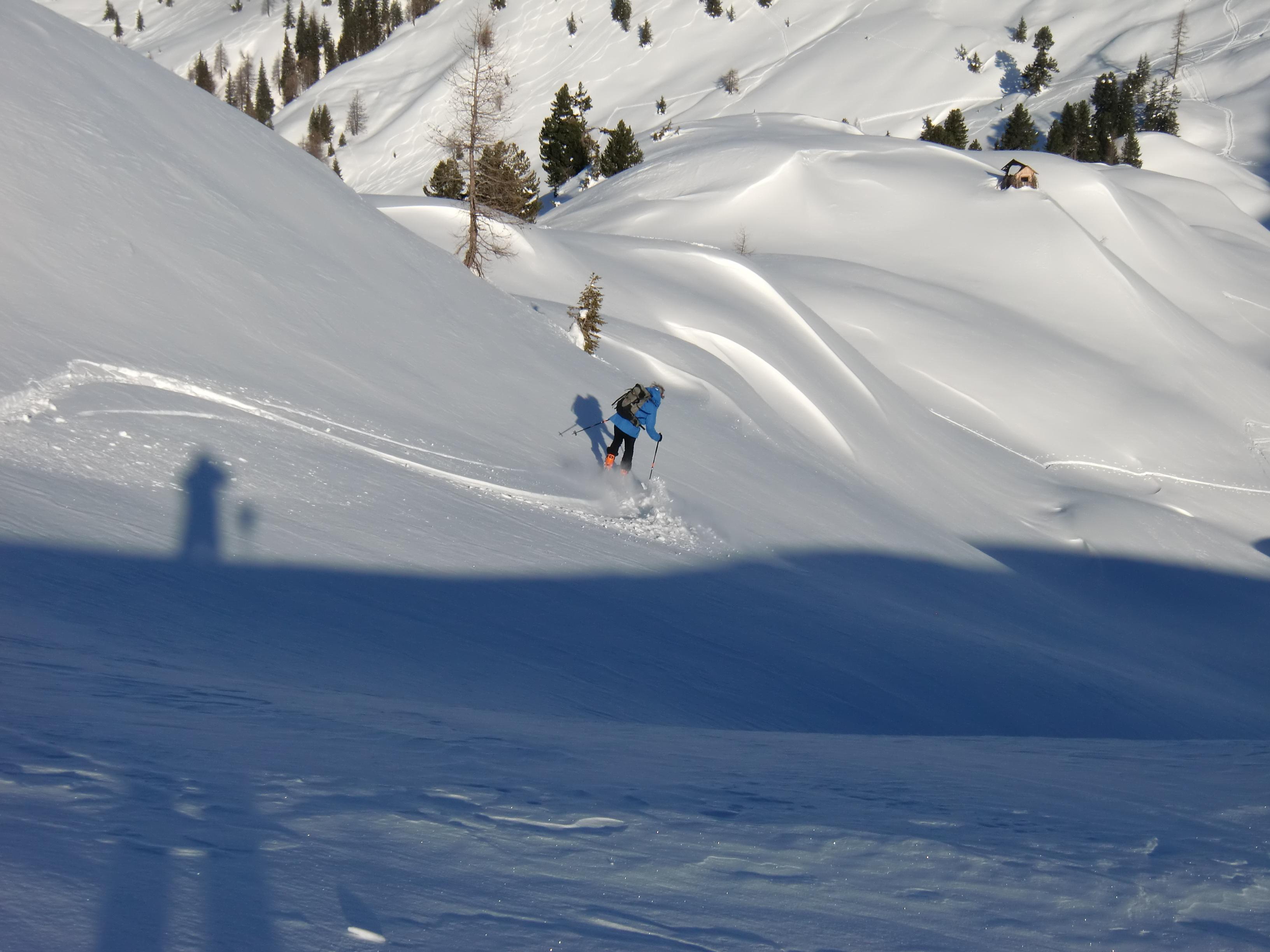 Schnee: Am (sehr schattigen) Gründegg-Anstieg noch bester, unverfälschter Pulver. Direkte Gipfelflanke allerdings sehr stark windbehandelt, die vorhandenen (älteren) Spuren haben nicht sehr einladend ausgesehen. Schnee am Penkkopf (kriegt etwas mehr Sonne) schon leicht angewärmt, aber immer noch homogen und ohne Deckel. Überall noch sehr schön zu fahren.