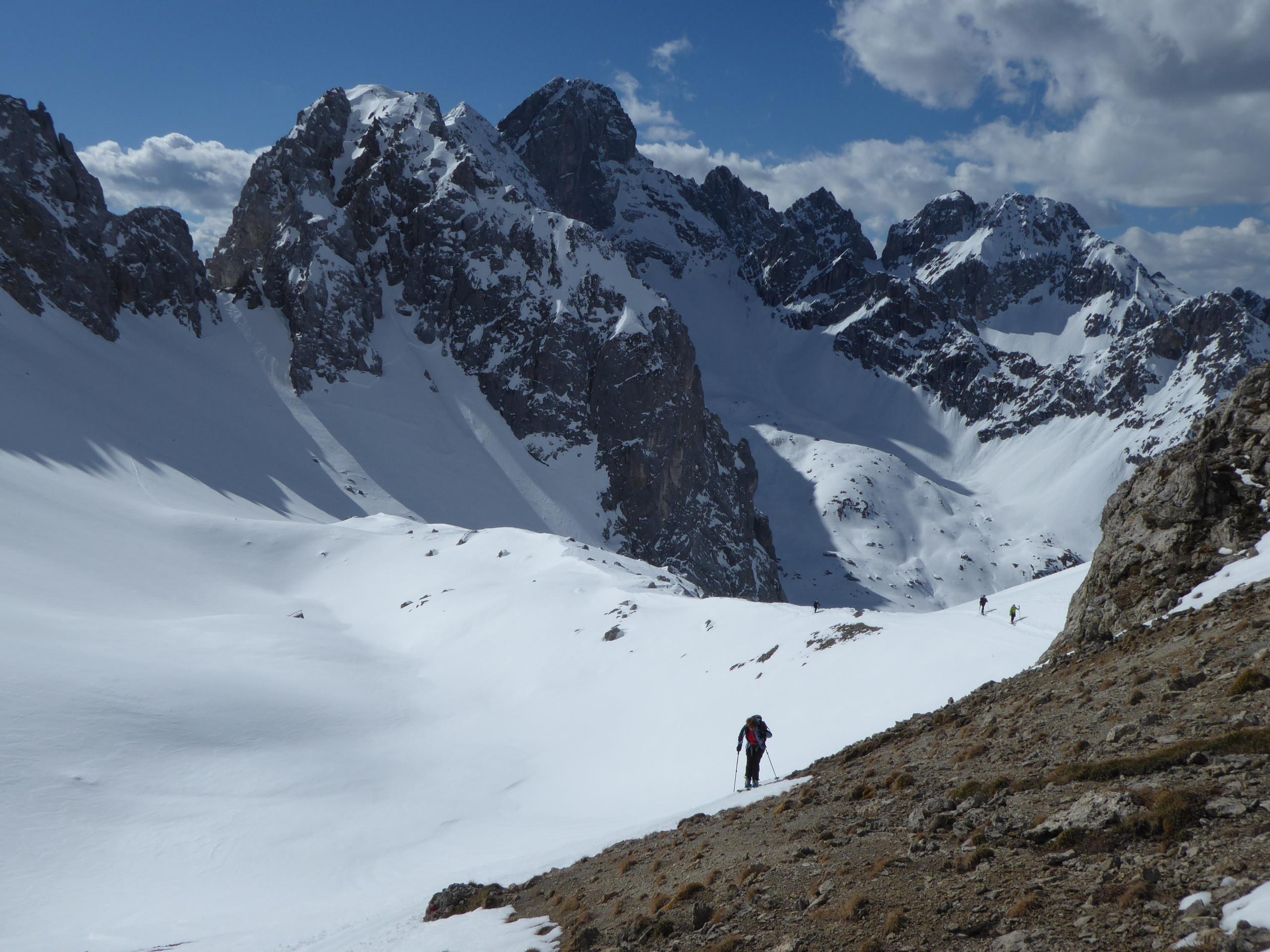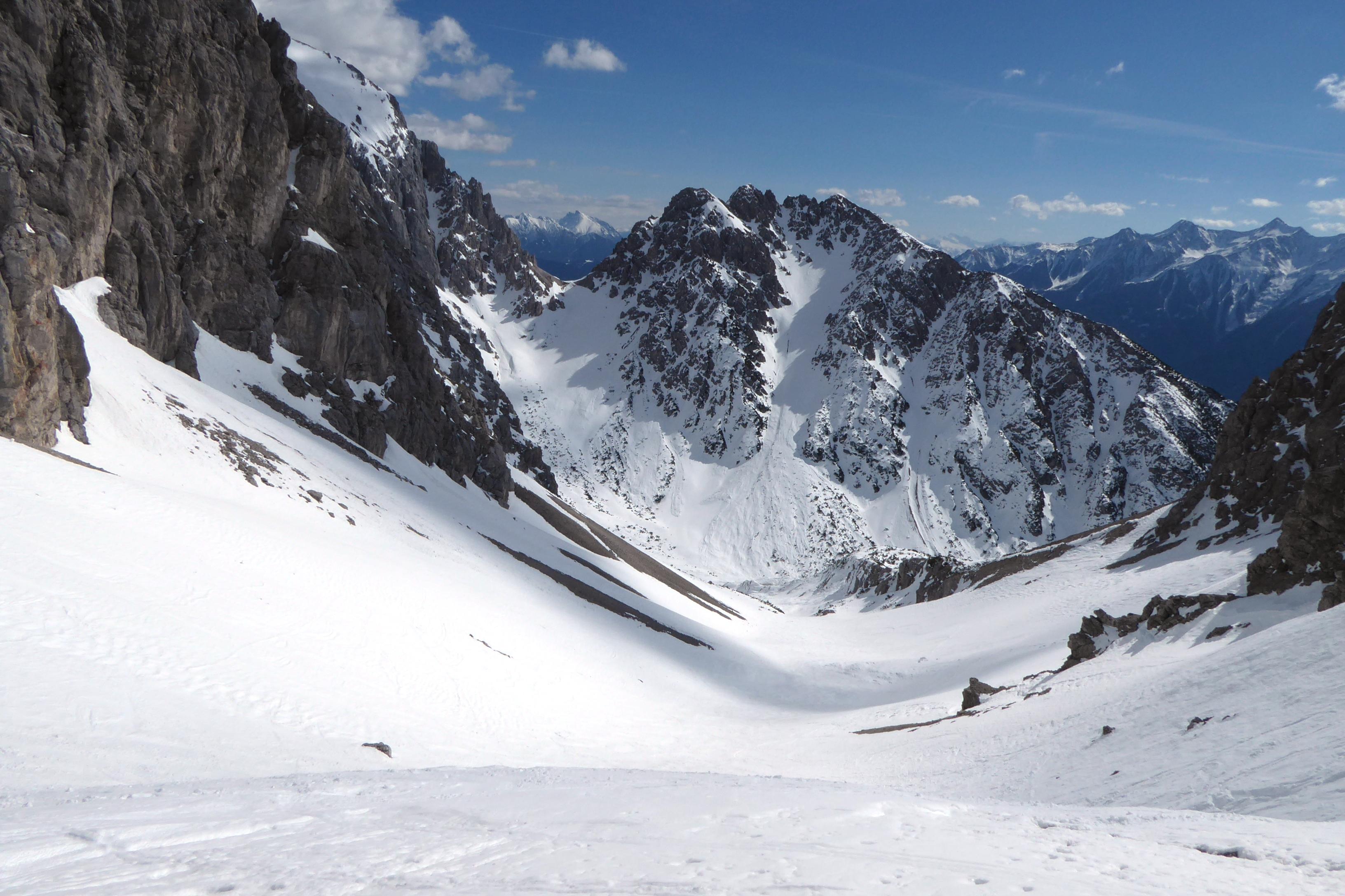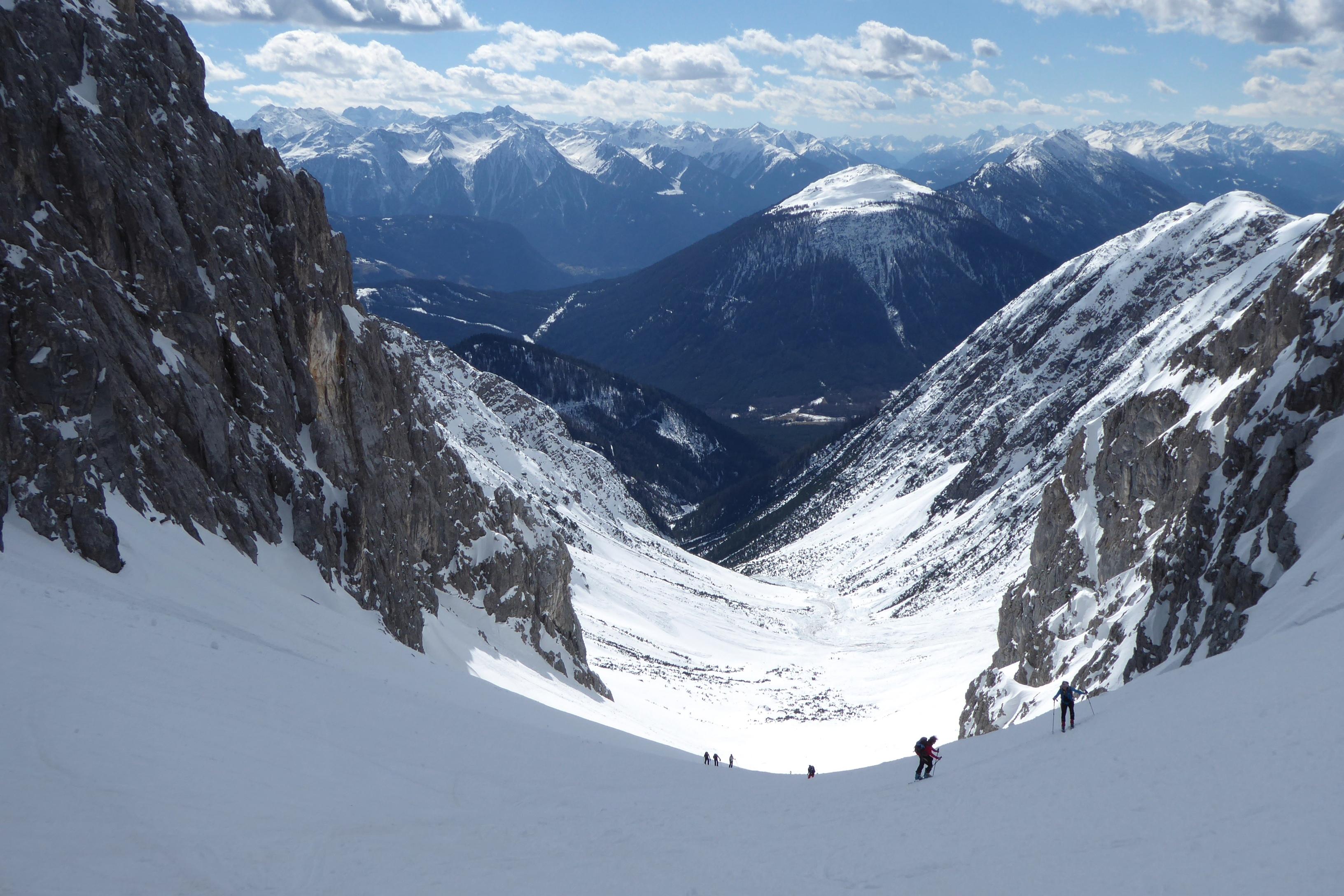 Landschaftlich großartige Durchquerung der Mieminger durch 4 große Kare, 3 Aufstiege, 3 Abfahrten mit insgesamt 1600 Abfahrts-Hm (bei nur 800 Aufstiegsmetern). AP Marienberglift/Biberwier/Außerfern (Tourengeherkarte € 14.-). Andrang: Rege, außer uns etwa 20. Von der Liftstation 1.Aufstieg zum Hölltörl. 1.Abfahrt nach Osten in die Höllreise, 2.Aufstieg durch diese in die Grünsteinscharte, 2.Abfahrt und Wiederaufstieg ins östl.Tajatörl, 3.Abfahrt durchs Brendlkar zum Liftgebiet Ehrwalder Alm (2.Auto oder zurück mit Skibus).