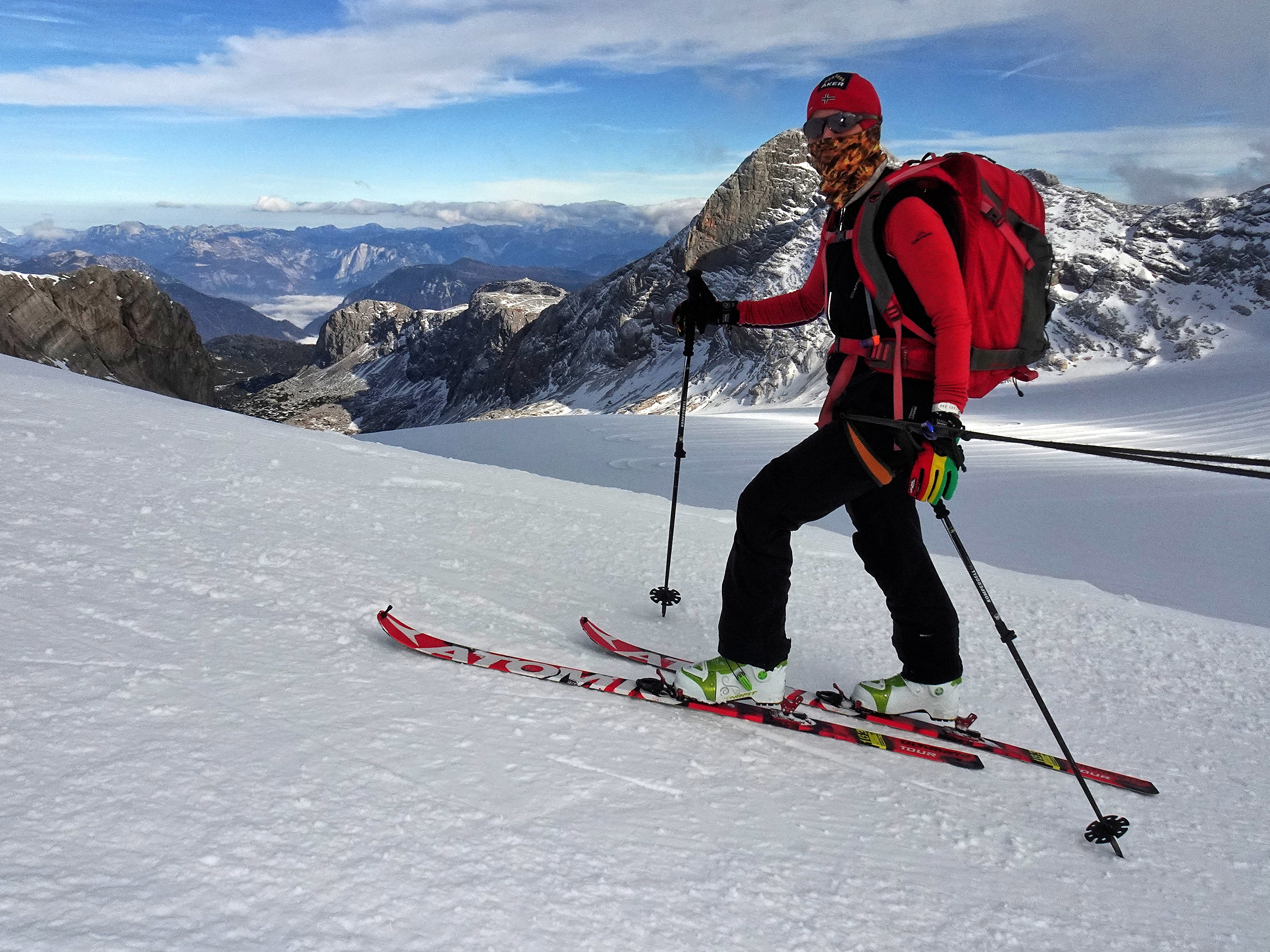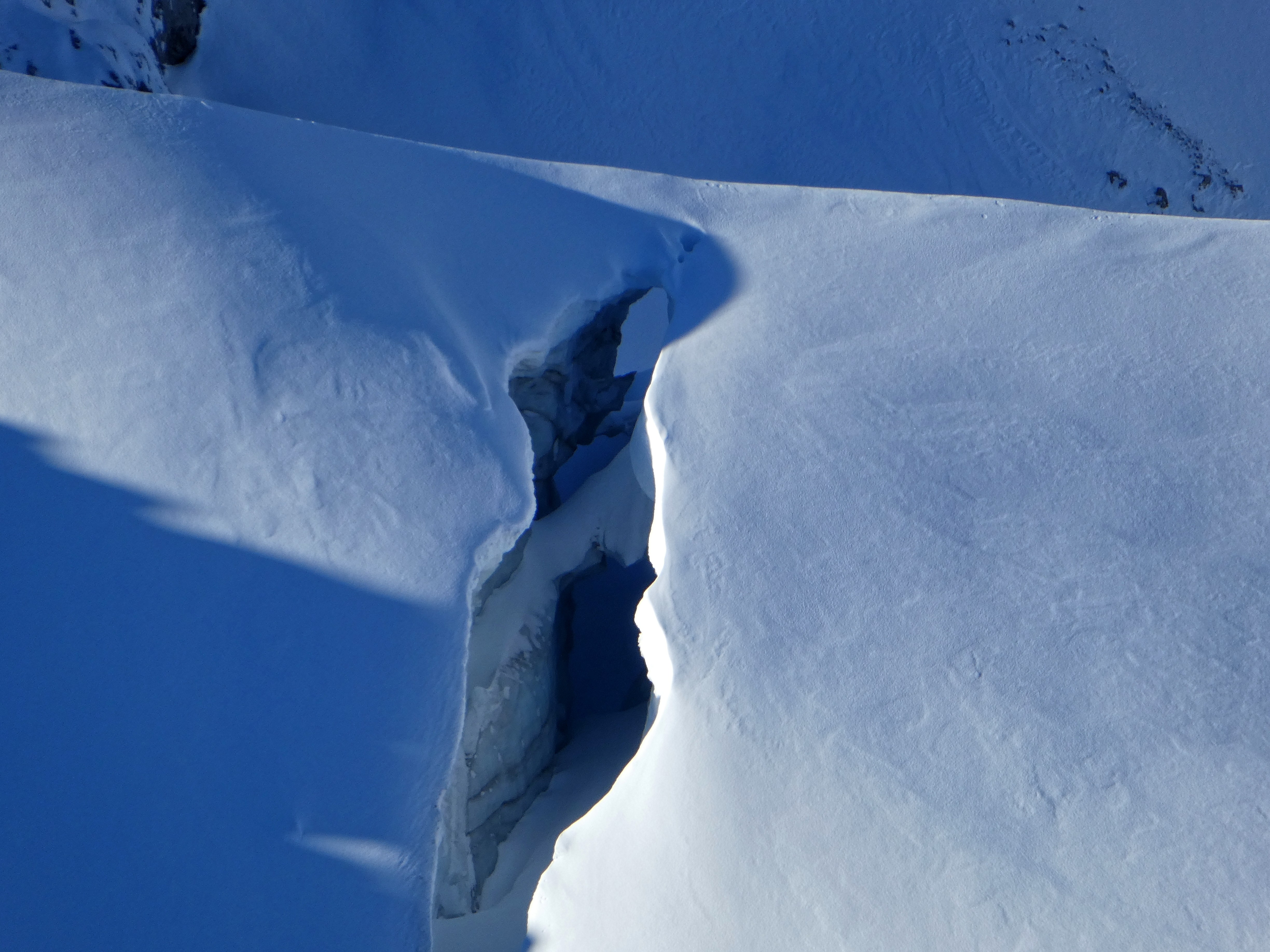 kurze Eingehtour. ab Mittag weniger Wind und Auflösung der Südstauwolken. Bedingungen ohne Harscheisen im Steilbereich des Gletschers sportlich. Spur von rutschigem Triebschnee überzogen. Noch teilweise offene Spalten. -3C. Randkluftanstieg mit Steigeisen problemlos.