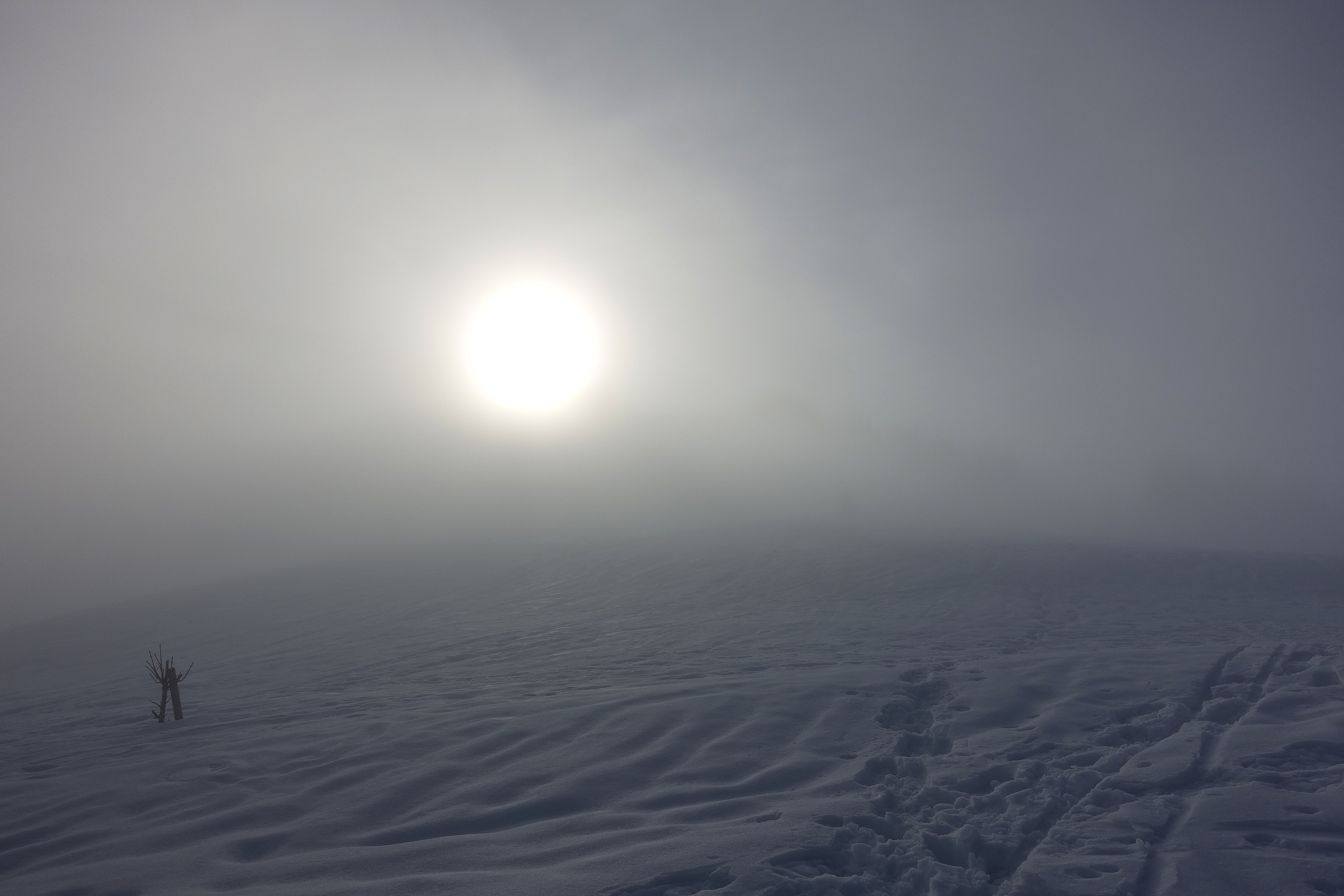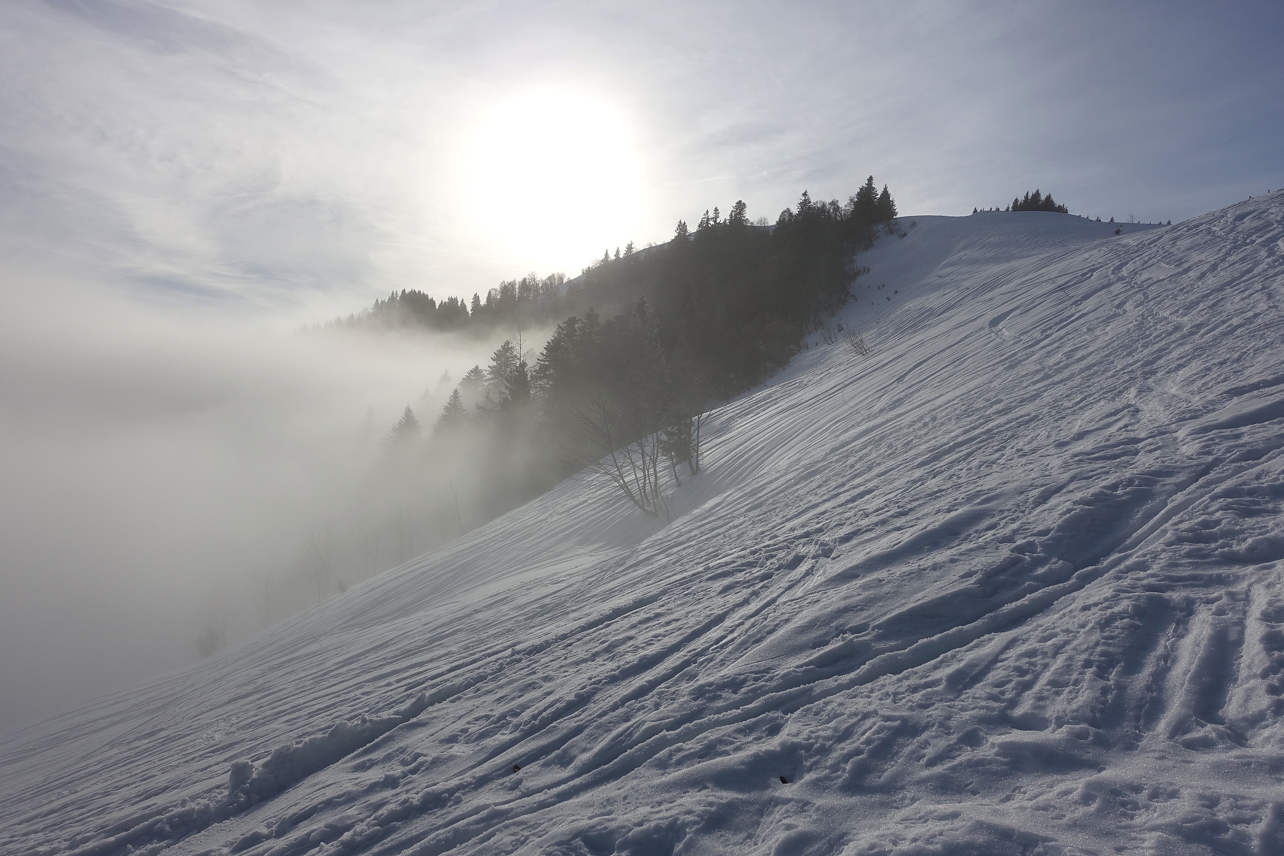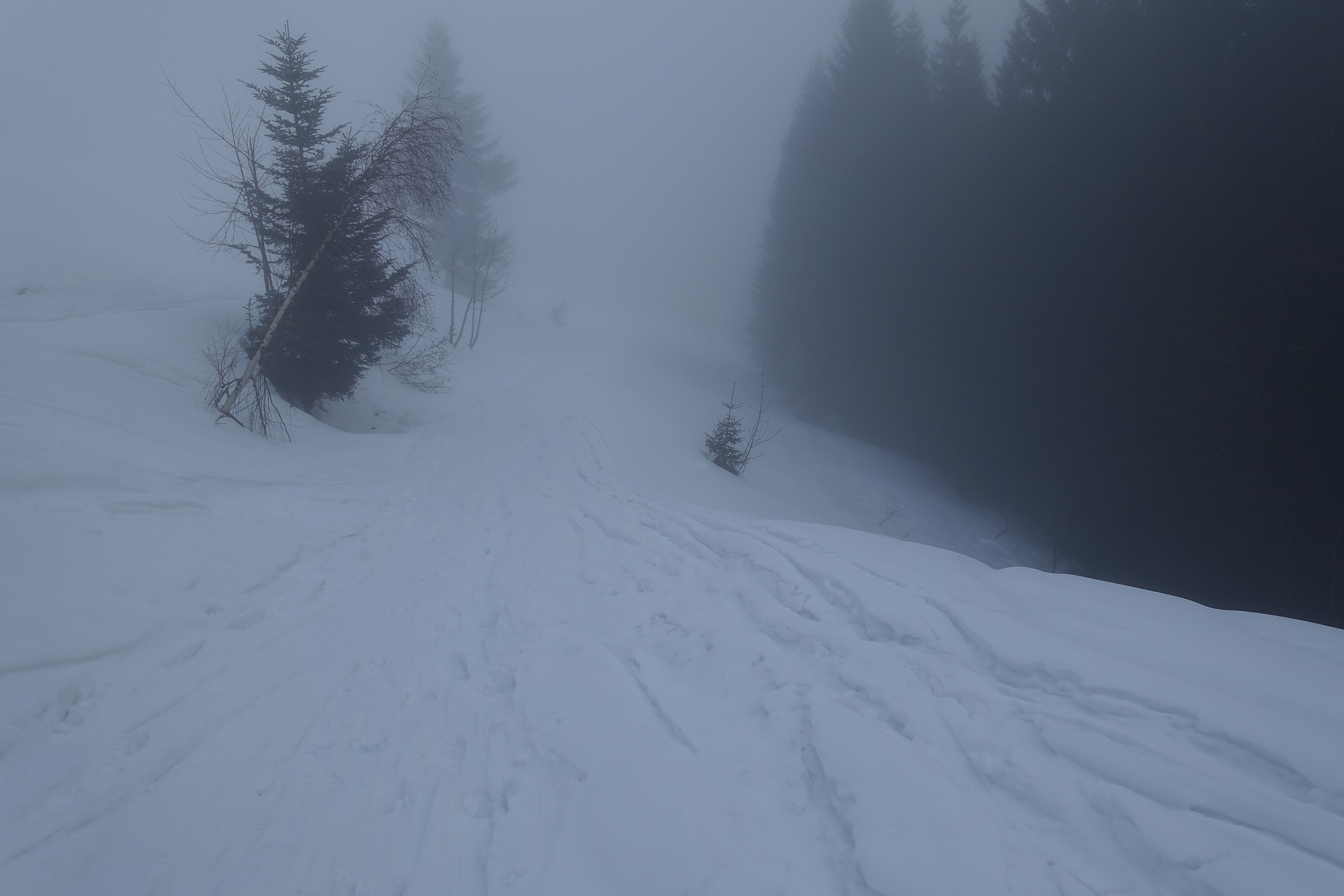 Aufstieg und Abfahrt über den Skitourenlehrpfad. Der Nebel war heute etwas hartnäckig, erst ab den Hochwiesalmen konnte man die Sonne erahnen, am Gipfel aber viel Sonnenschein und mild mit guter Fernsicht. Der erste Hang runter zu den Almen war ziemlich hart und ruppig - zudem viele alte fest gefrorene Spuren. Ab den Almen feuchter Schnee, nicht allzu tief (durch Nebel keine Sonneneinstrahlung) - mit etwas Kraft gingen sich einige schöne Schwünge aus. Der Mautstraße ab der Hatzenalm bis zur Abzweigung Grögneralm (vermutlich bis zum Schranken runter) leider tief geräumt - es schaut einiges an Splitt heraus. Die Bedingungen waren gar nicht so schlecht - hat beim Aufstieg schlimmer ausgesehen.