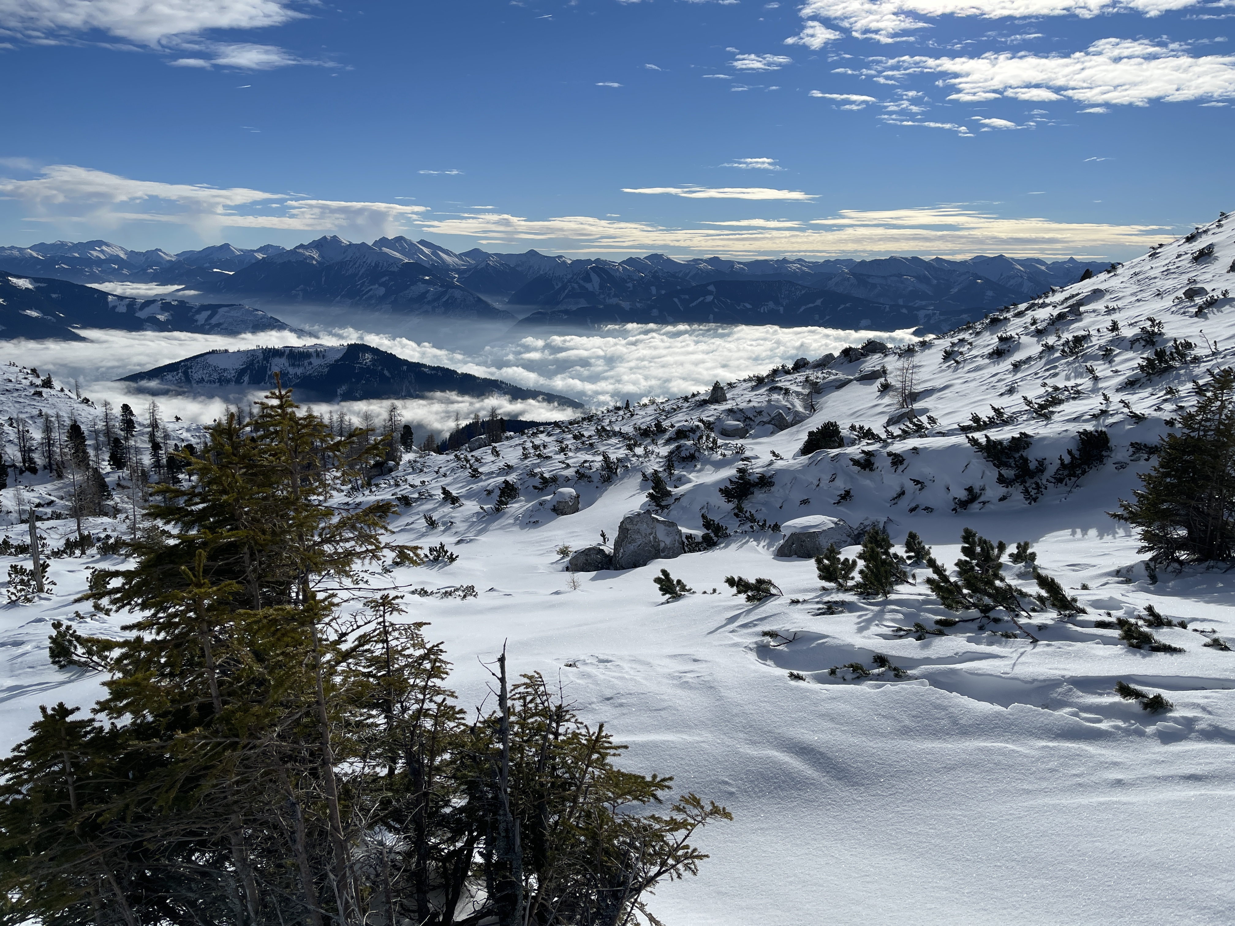 ab PP Kalkofen an der Pyhrnpassstrasse zur Hintersteineralm, weiter über die Forststrasse und Aiplhütte zum Gipfel. Auch heute war es schaftseitig durchgehend sehr knusprig, oben sogar feiner Pulver. Die Waldpassagen schon ziemlich ausgefahren und deshalb gut machbar