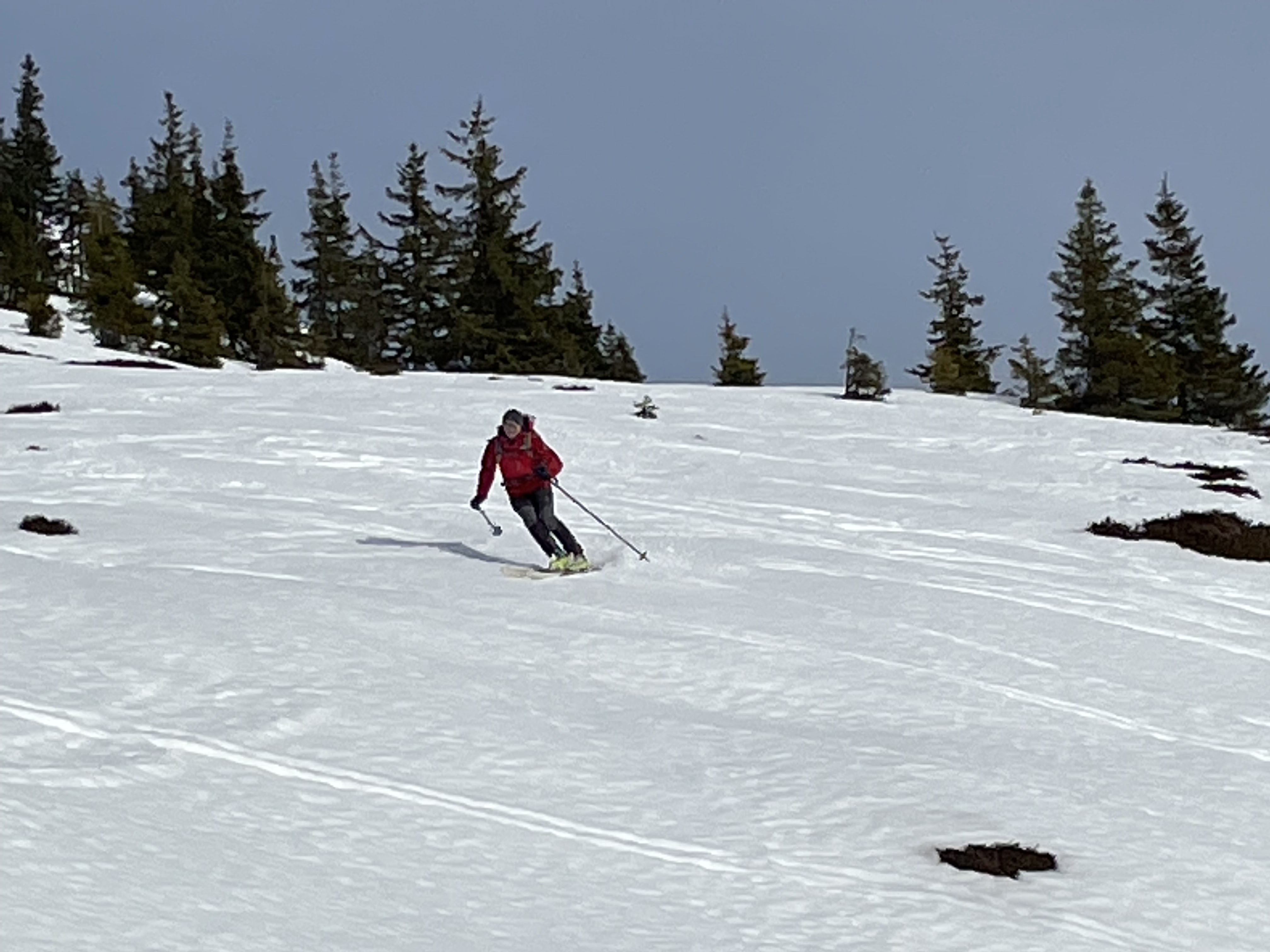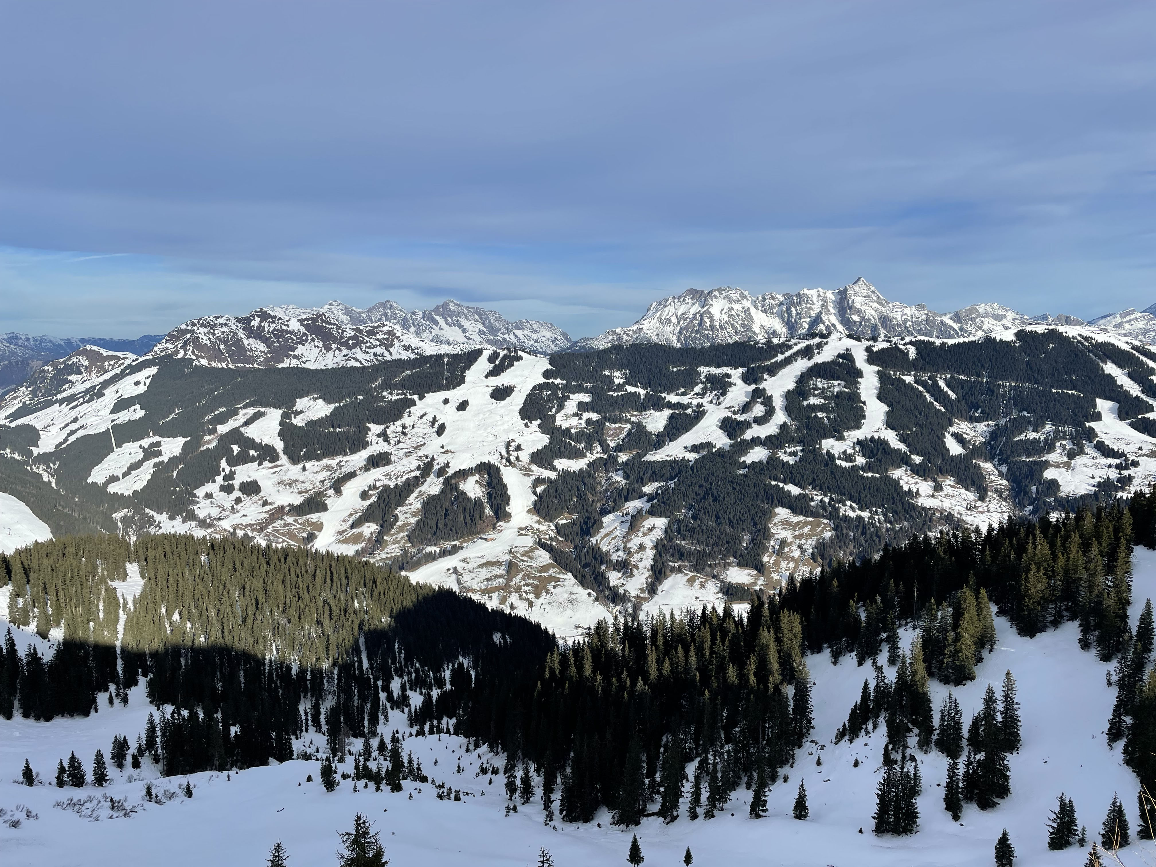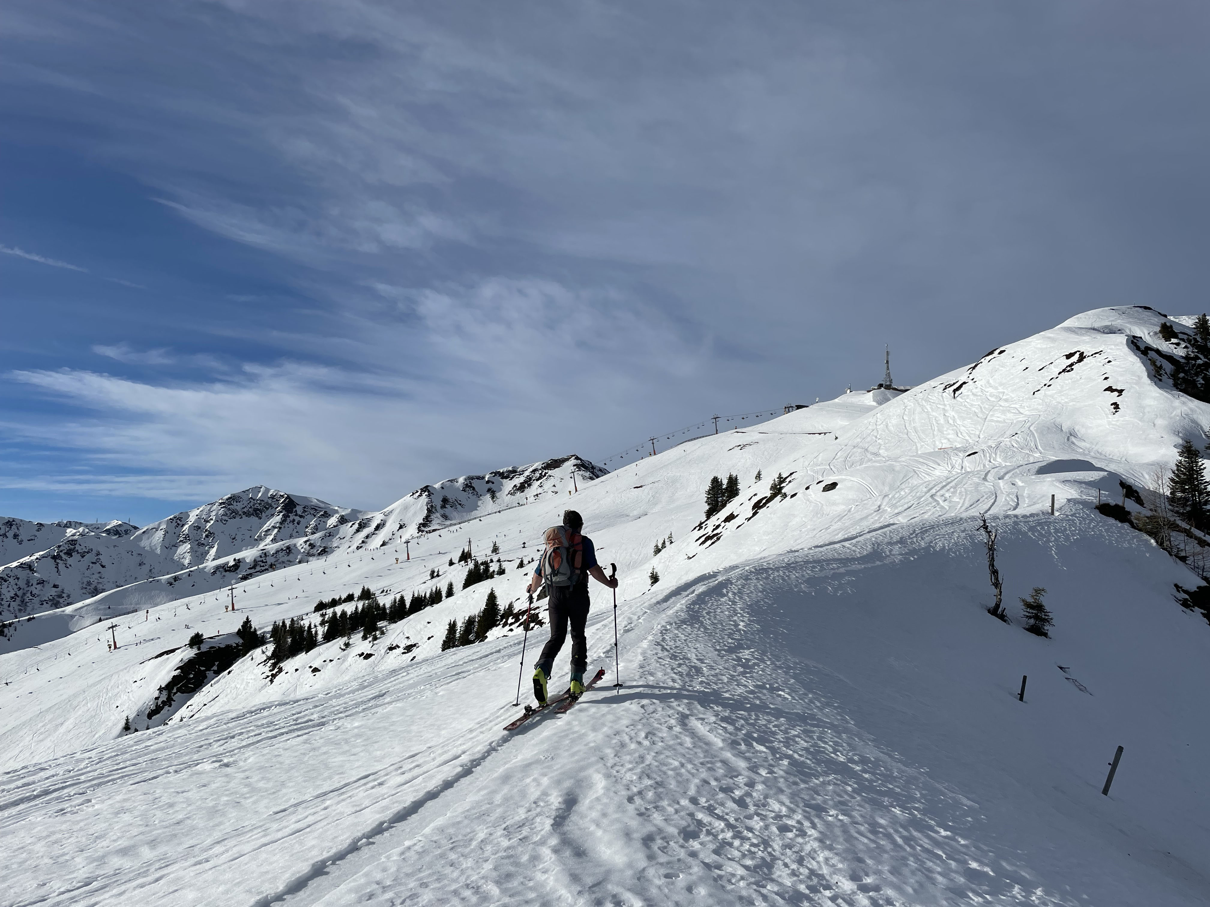 Heute von Jausern im Glemmtal über die Piste auf den Schattberg-Ostgipfel (2018). Sonnseitig abseits der Piste eine Mixtur aus Firn, teils einbrechend, teils Sulz, je nach Sonnenstand und Steilheit. Die Südhänge im Glemmtal sind schon deutlich ausgeapert. Es wird Zeit, dass Schneenachschub kommt.