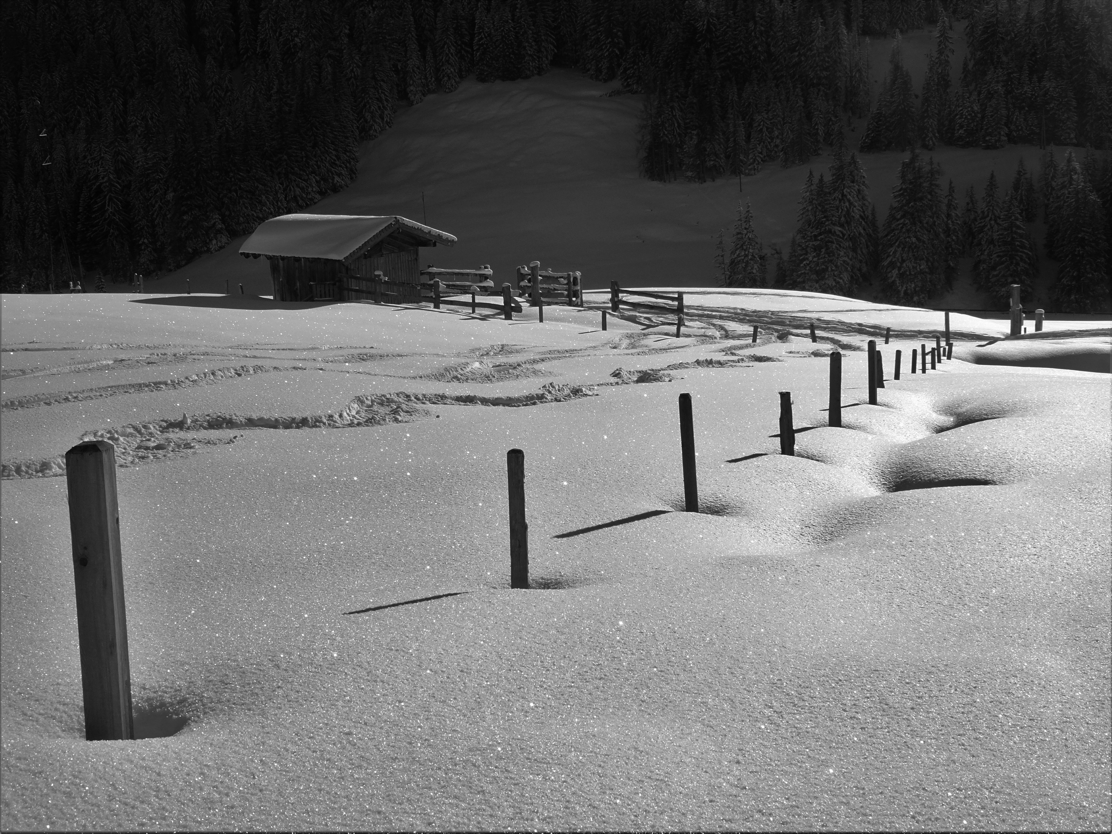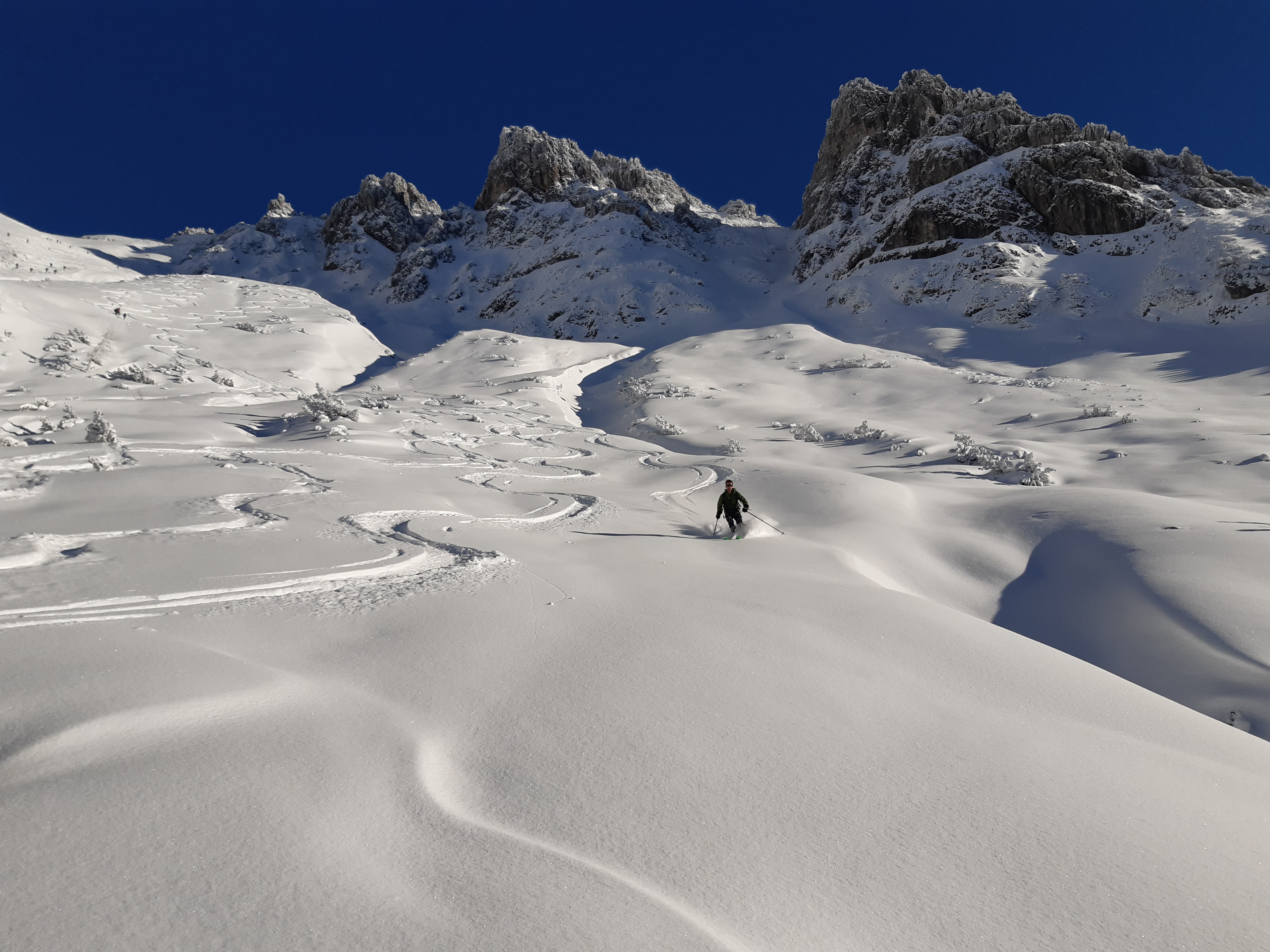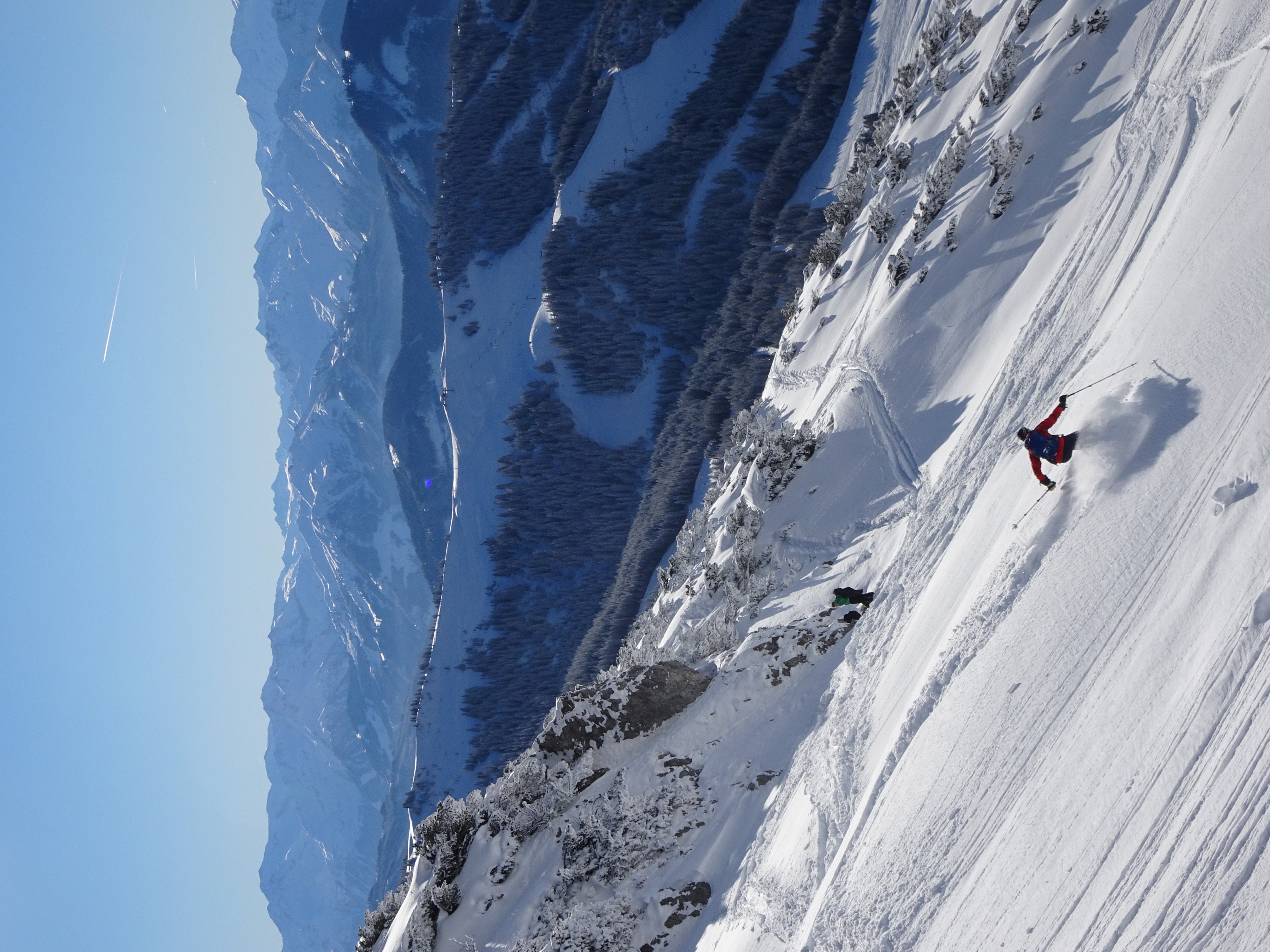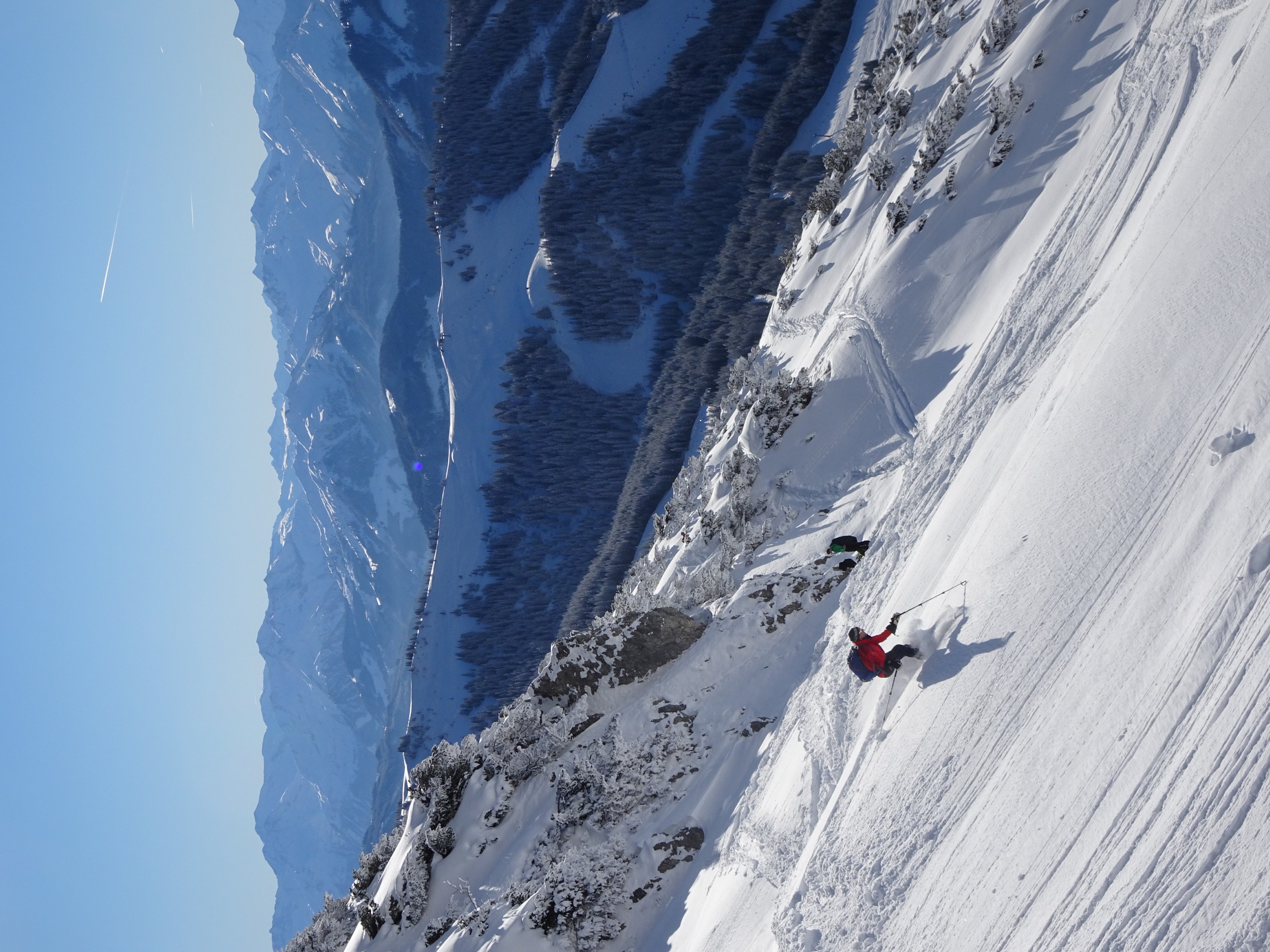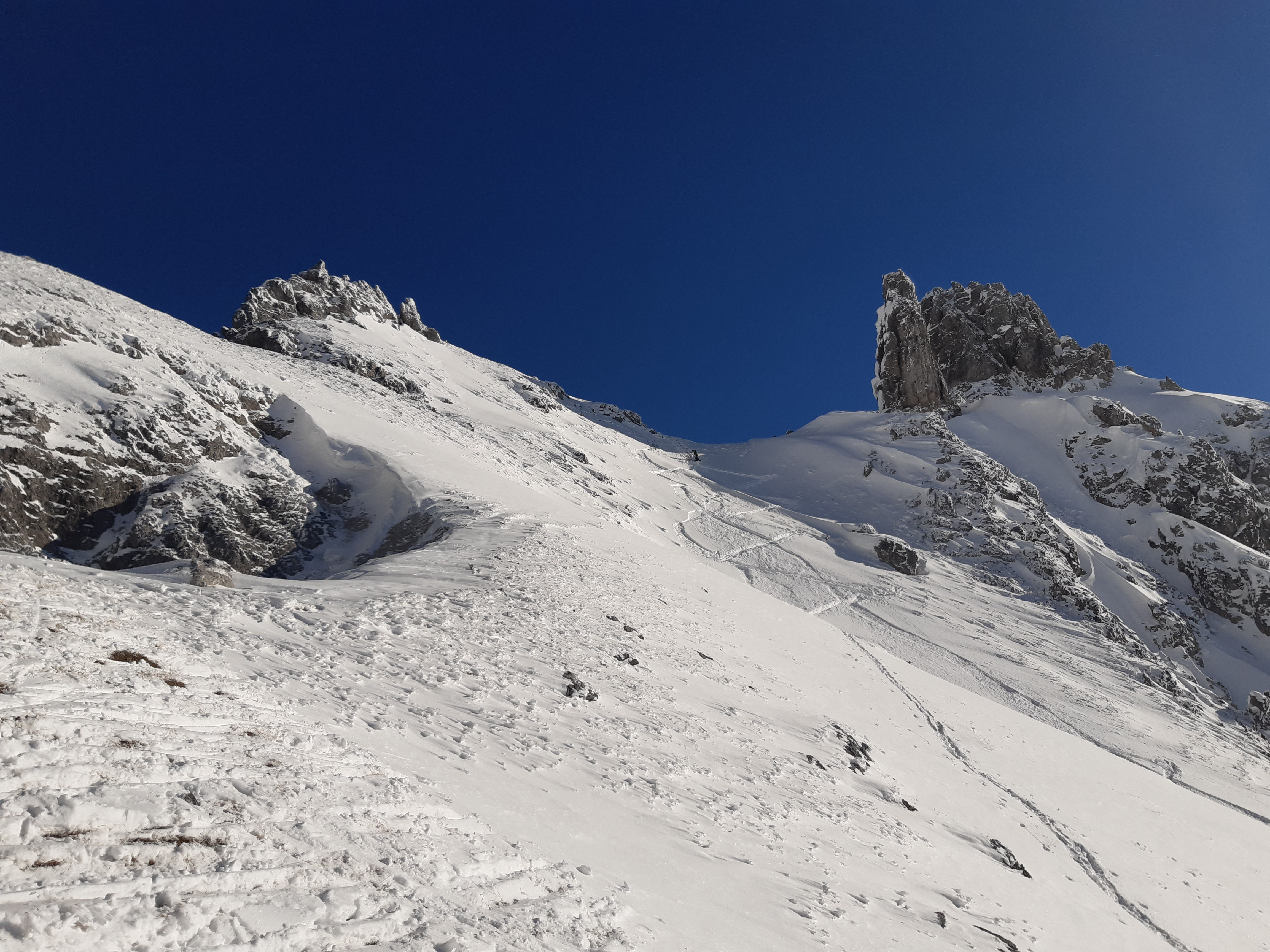 Wir waren nach einer Stunde im Stau spät dran aber noch früh genug für eine erste perfekte Pulverabfahrt über unberührte Hänge. Beim zweiten Mal wurde es dann schon eng. An der Scharte war's unterm dünnen Pulver steinig. Insgesamt sehr wenig Schnee, aber gestern hat's gepasst.