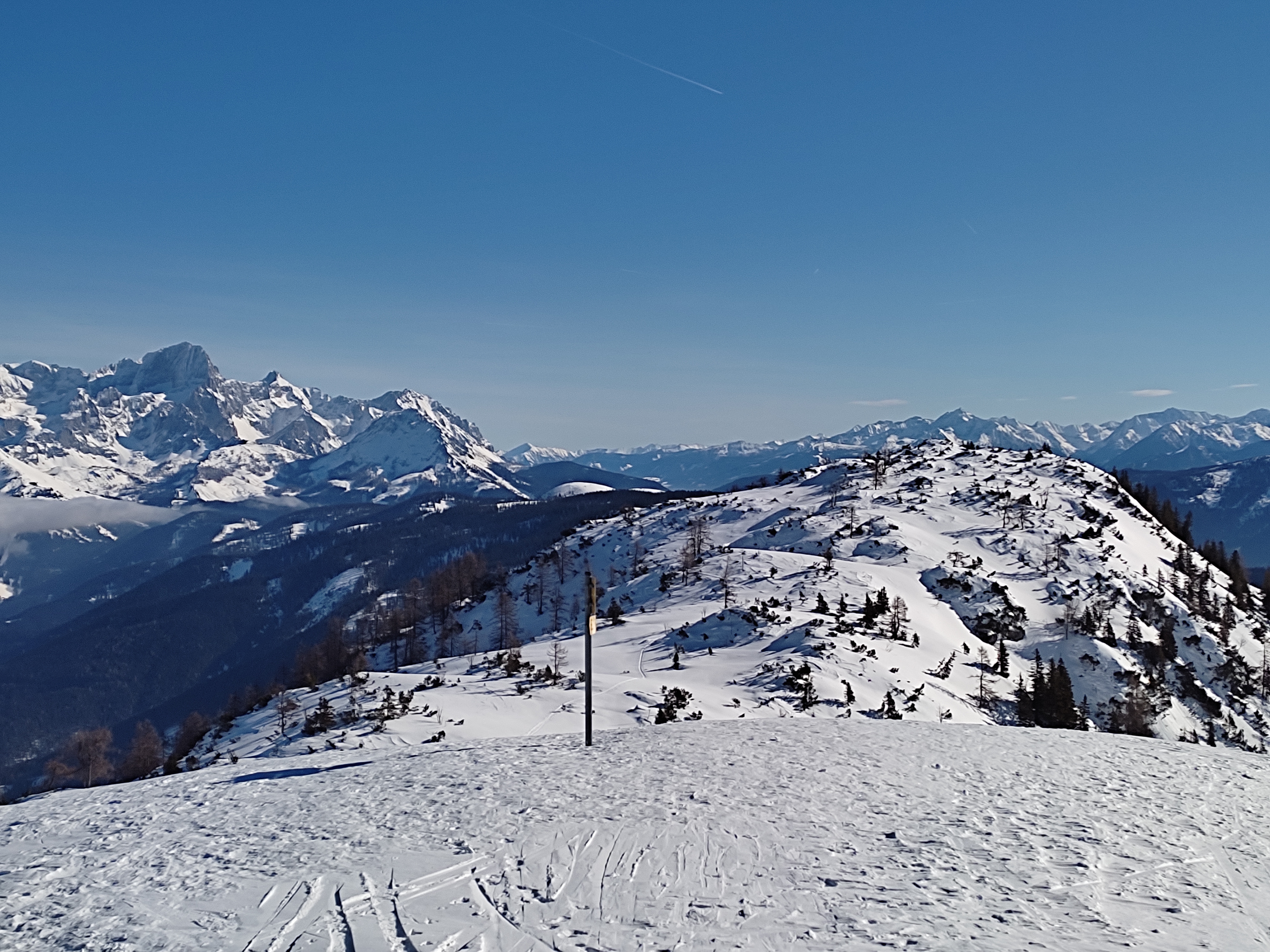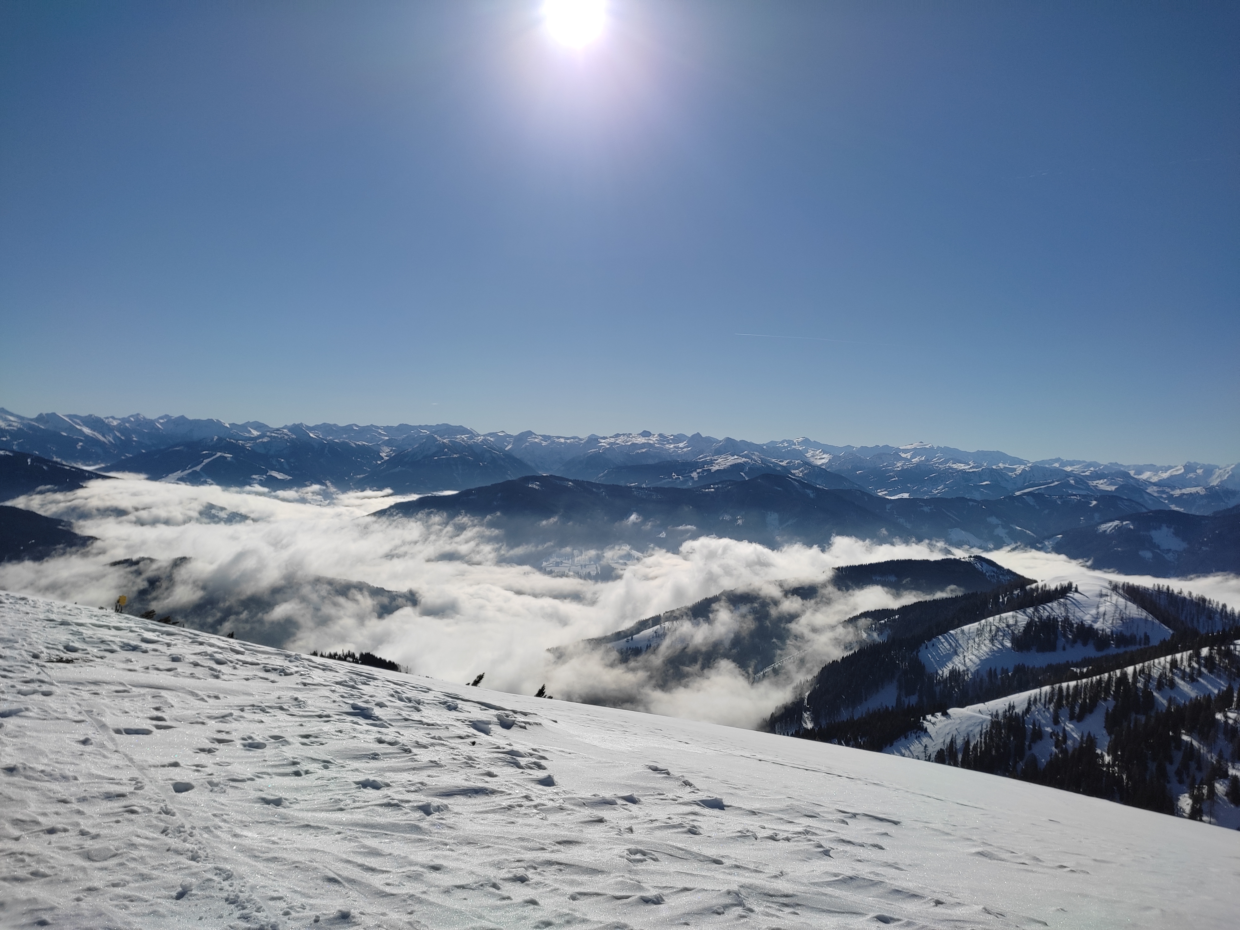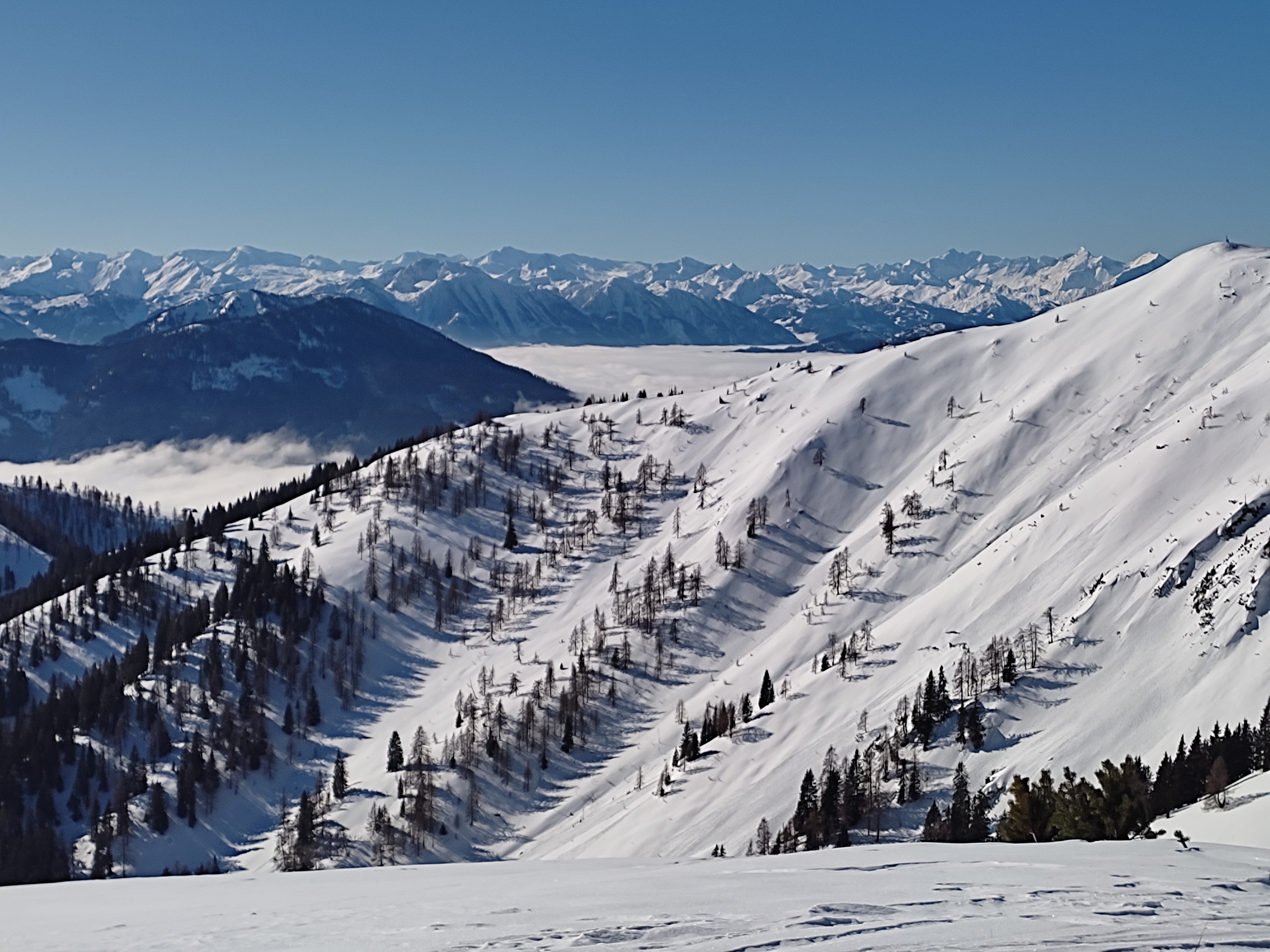 Nach einem unsympathischen Start bei dickem Nebel waren wir schon nach 150 HM in der schönsten Sonne. Trotz gestriger Wärmebehandlung und Wind der letzten Tage war der Schnee großteils noch recht fluffig. Beim Aufstieg waren einige Entladungen im Tennengebirge zu hören, gesehen haben wir sie nicht. Am Gipfel der wunderbare Rundblick, dann eine traumhafte Abfahrt im wenig verspurten Gelände durch die Rinne rechts neben dem Aufstieg. Weil es so traumhaft war, gleich nochmal rauf, diesmal links hinüber zur Ostermaisspitze und runter durch den lichten Wald. Auch hier wieder gesetzter Pulver vom Feinsten. Für Freitag extrem wenig Leute - fast wie ein Geheimtipp ;-)