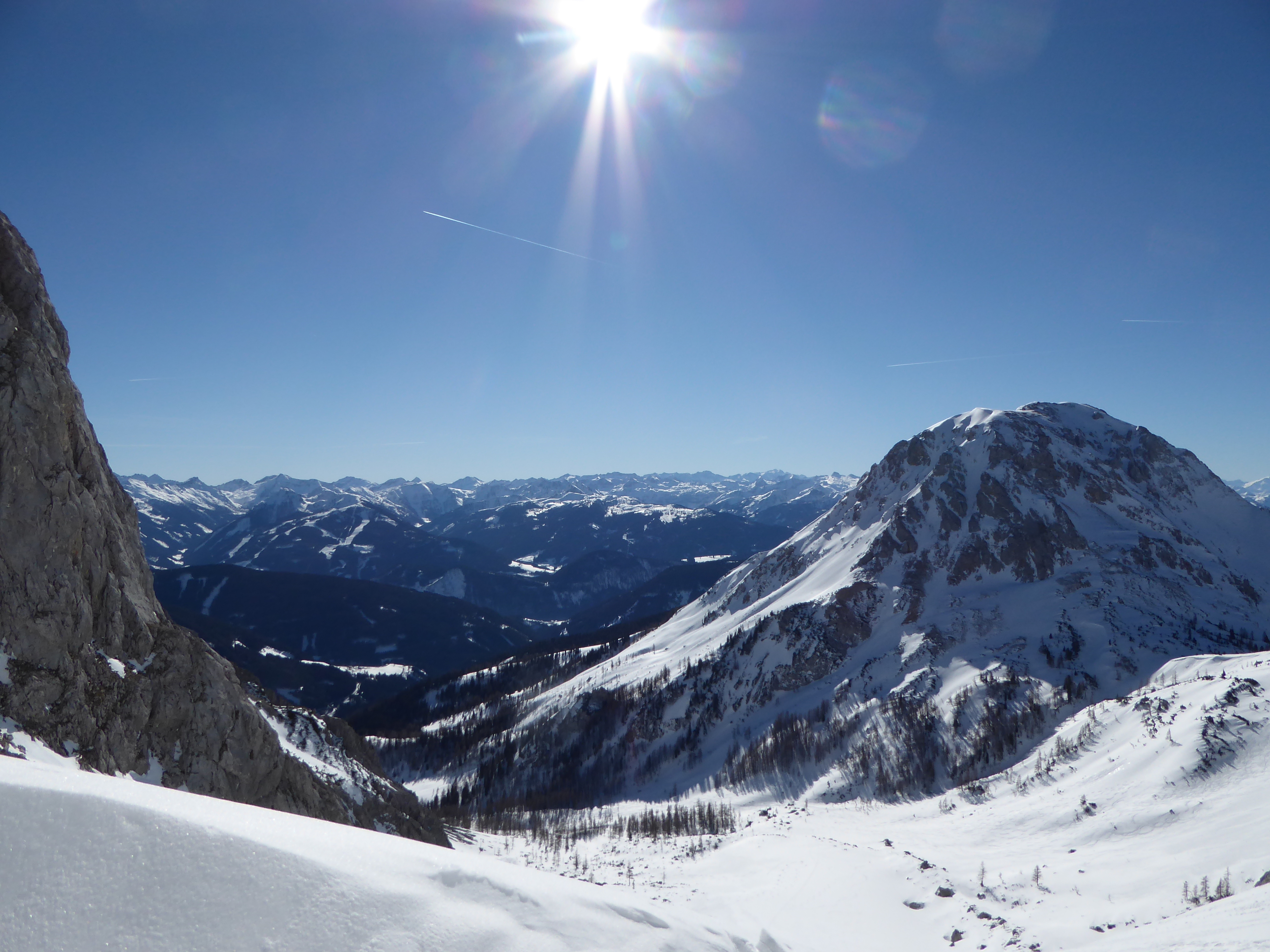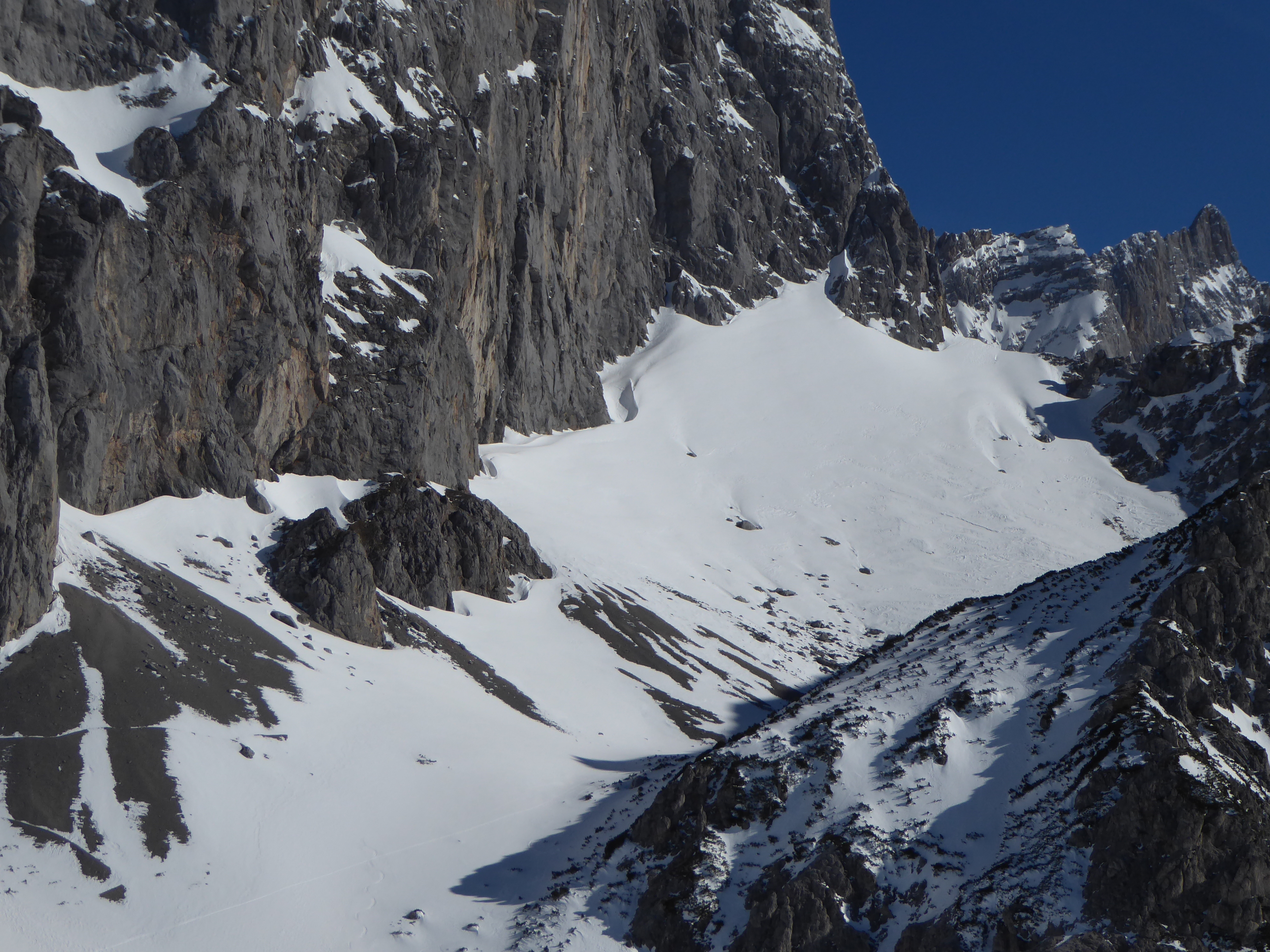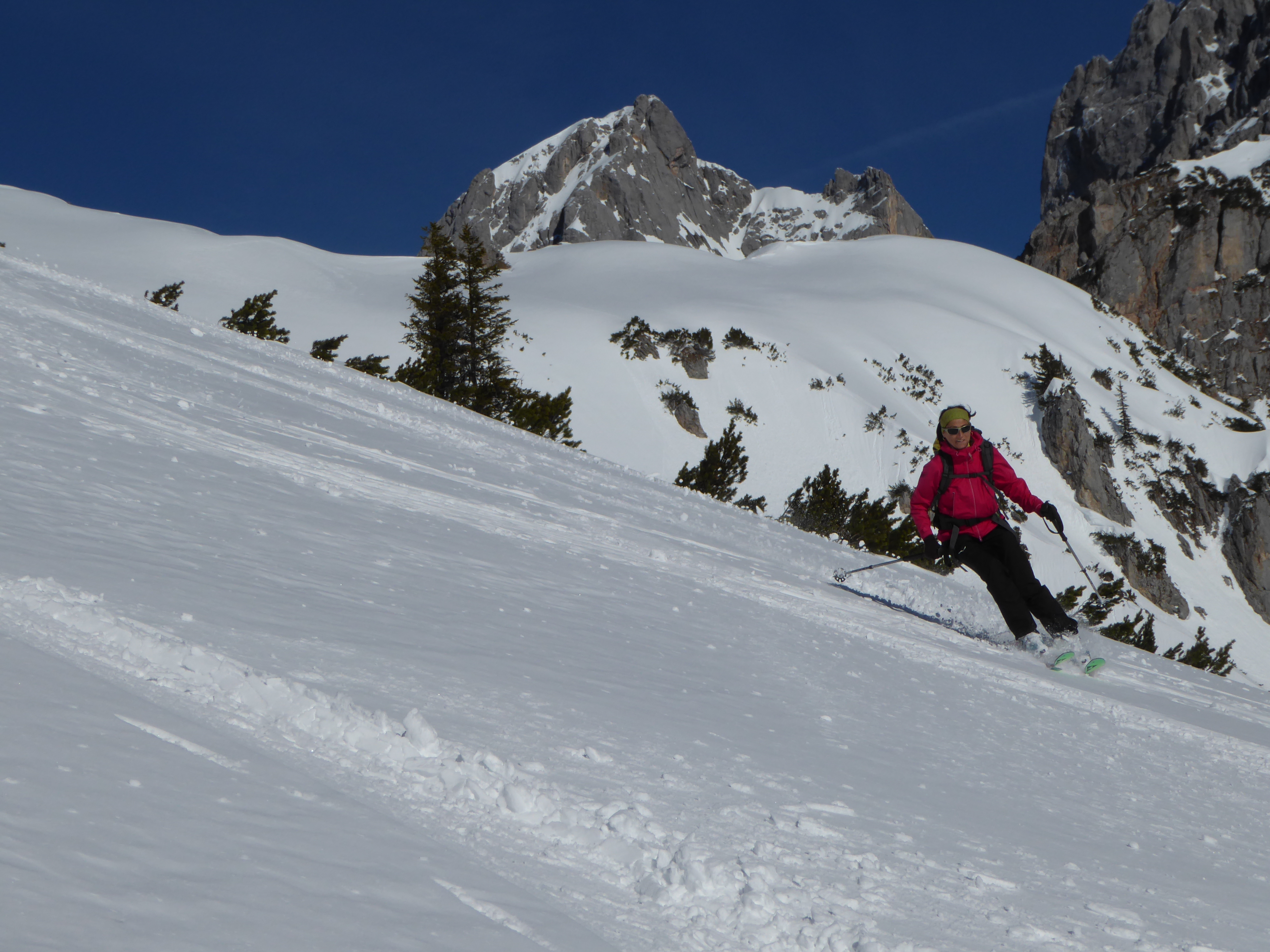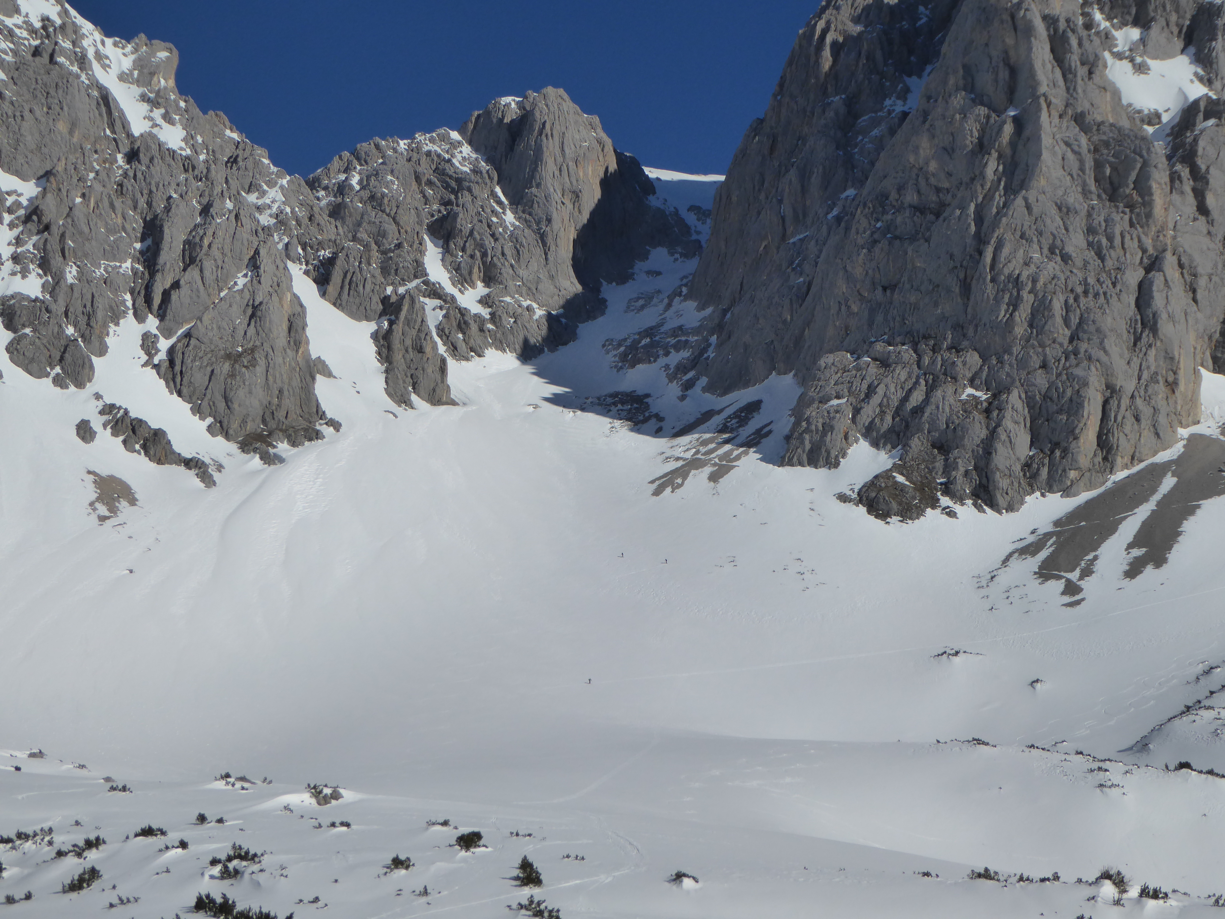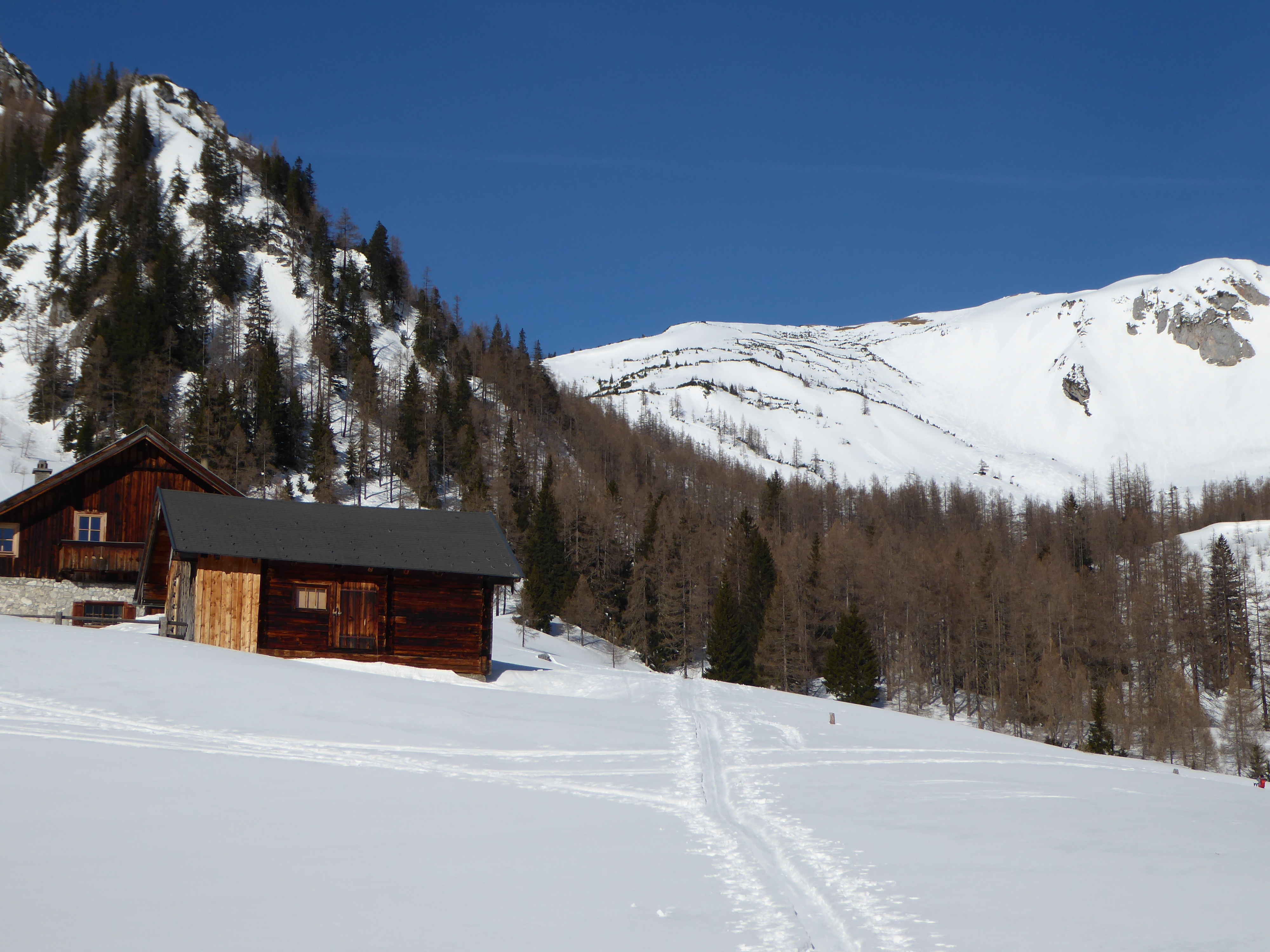 Für einen Donnerstag war der Parkplatz überraschend voll. Haben um 9:30 gerade noch den letzten Platz ergattert. Im Tal über einen Meter Schnee. Rustikale Spur zur Bachlalm - der Schidoo hat hier ganze Arbeit geleistet. Das verspricht eine holprige Abfahrt, aber bei der Schneelage geht auch querfeldein. Schnee ist gut gesessen, im Schatten pulvrig, in der Sonne kompakt und tlw. schon aufgefirnt. Im Kessel treffen wir auf 4 andere, die das Tor anpeilen. Im Windlegerkar sind 3 beim Aufsteigen. Wo sind die anderen geblieben? Egal, wir entscheiden uns zuerst für die Schulzenschneid. Dort waren schone einige Spuren, aber noch genug Platz zum Ziselieren. Bis zum Kamm, sehr warm und weitgehend windstill. Beim Gipfelkreuz abgeblasen und sehr windig. Nach kurzem Blick auf Tor und Windlegerkar entscheiden wir uns als Draufgabe für zweites. Bei der Abfahrt schmierts richtig gut. Nach kurzer Rast Wiederanstieg zum Windlegerkar. Hier trotz starkem Wind beste Bedingungen. Die Kombination aus Wind und Sonne hat hier eine glatte, verfestigte und aufgefirnte Oberfläche gemacht. Aufstieg bis zum Jausenstein, wo sich im Lee noch ein gemütlicher Rastplatz findet. Auch hier die Abfahrt herrlich!! So schön haben wir das Windlegerkar noch nie erlebt. Bis zur Forststraße dann ein Wechsel aus Firn und Pulver. Solche Tage hätte man gerne mehr...
