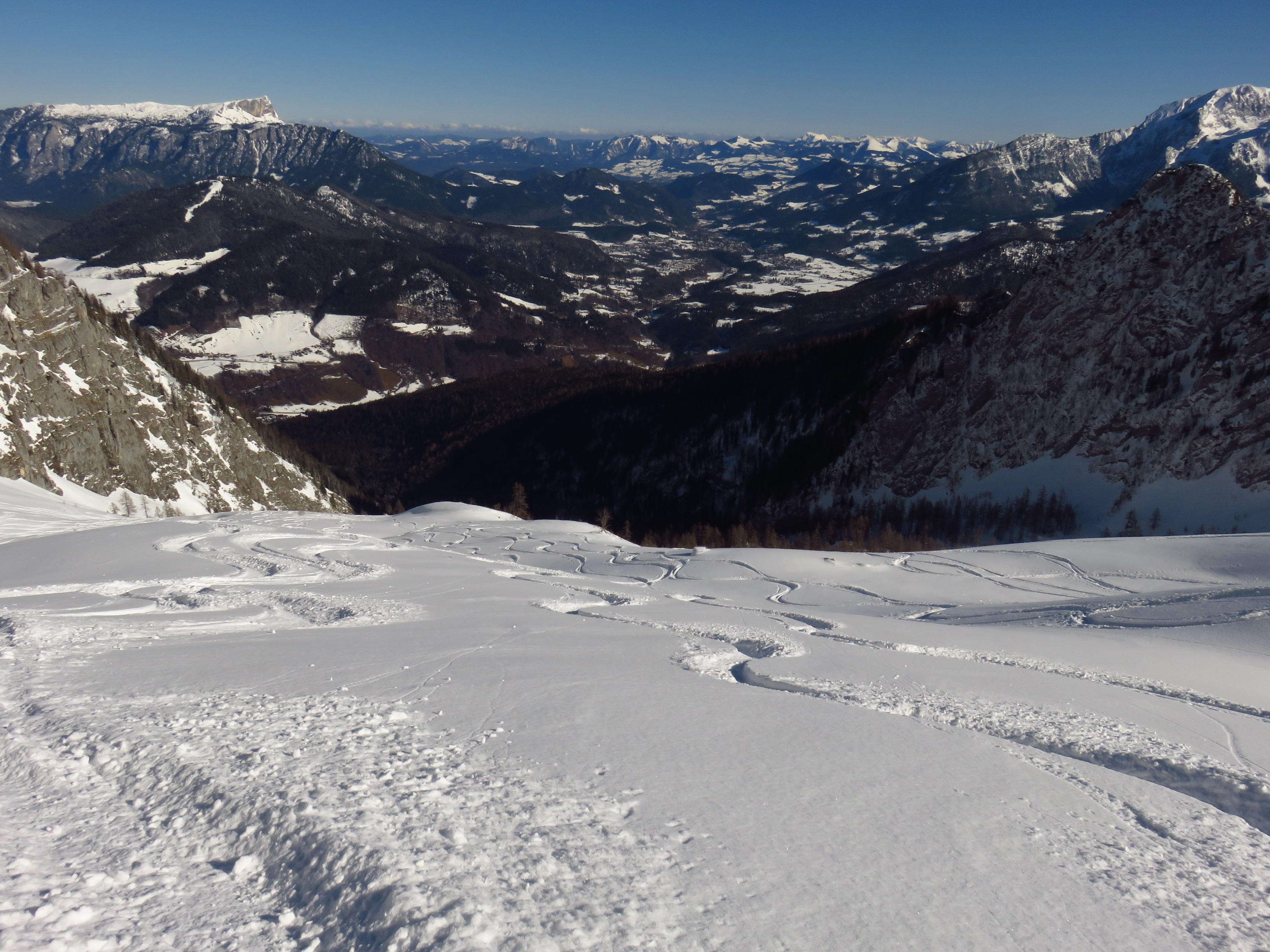 Parkplatz an der Pfeifenmacherbrücke um 8 Uhr schon gut belegt. Forststraße zur Eckaualm die ersten 100 Streckenmeter etwas eisig der Rest hart aber für Aufstieg und Abfahrt gut geh und fahrbar. Schnee: Eckaualm 5-10cm Pulverschnee auf harten Altschnee am Gipfel ca. 15cm Pulver ohne Windeinfluß schön gleichmäßig verteilt. Auch die Waldstufe gut geh und fahrbar. Es waren heute ca. 50-100 Tourengeher unterwegs es wird am Sonntag nicht mehr viel Platz für die eigene Spur sein. Wetter: sonnig und kalt sehr gute Sicht