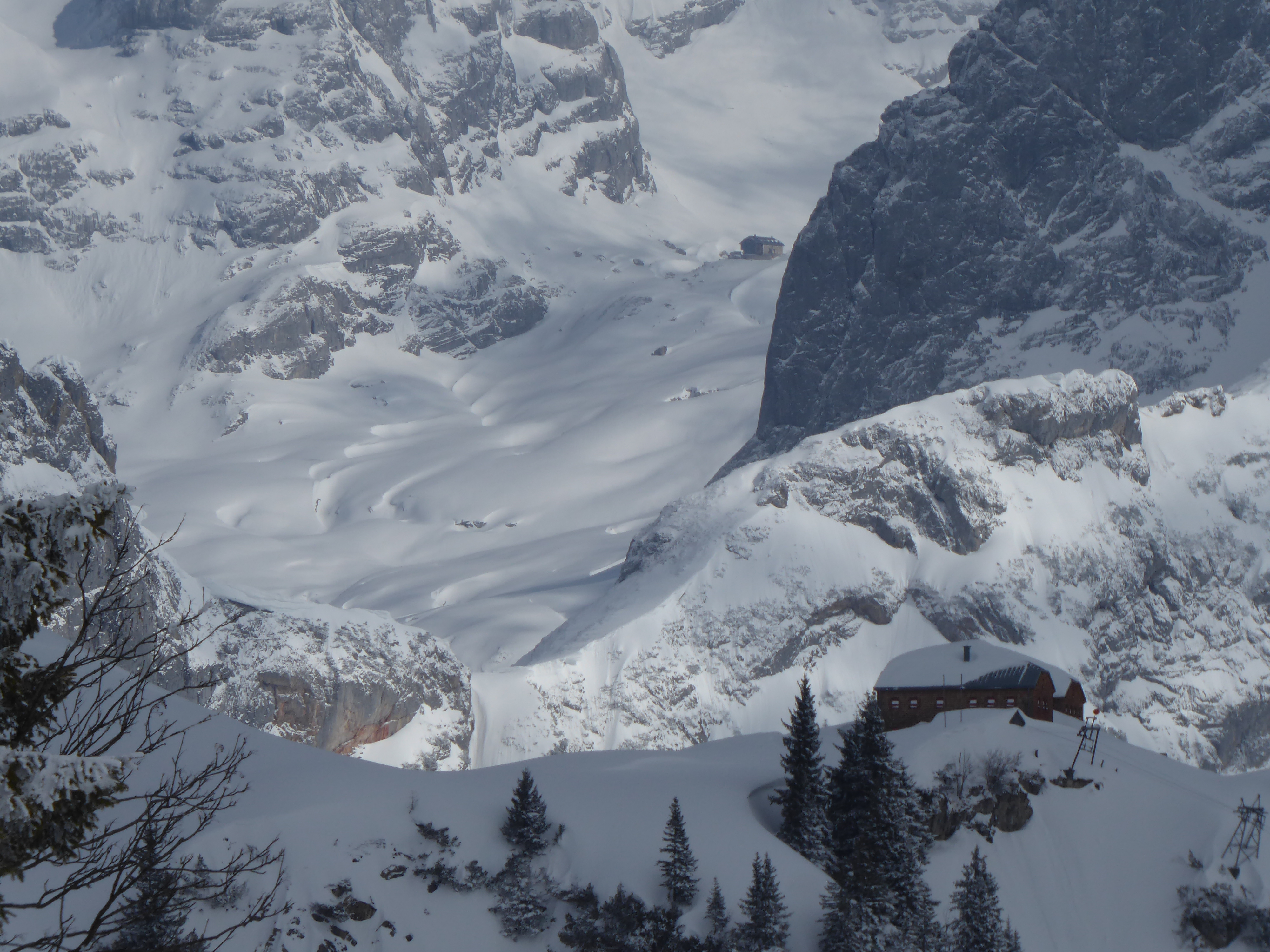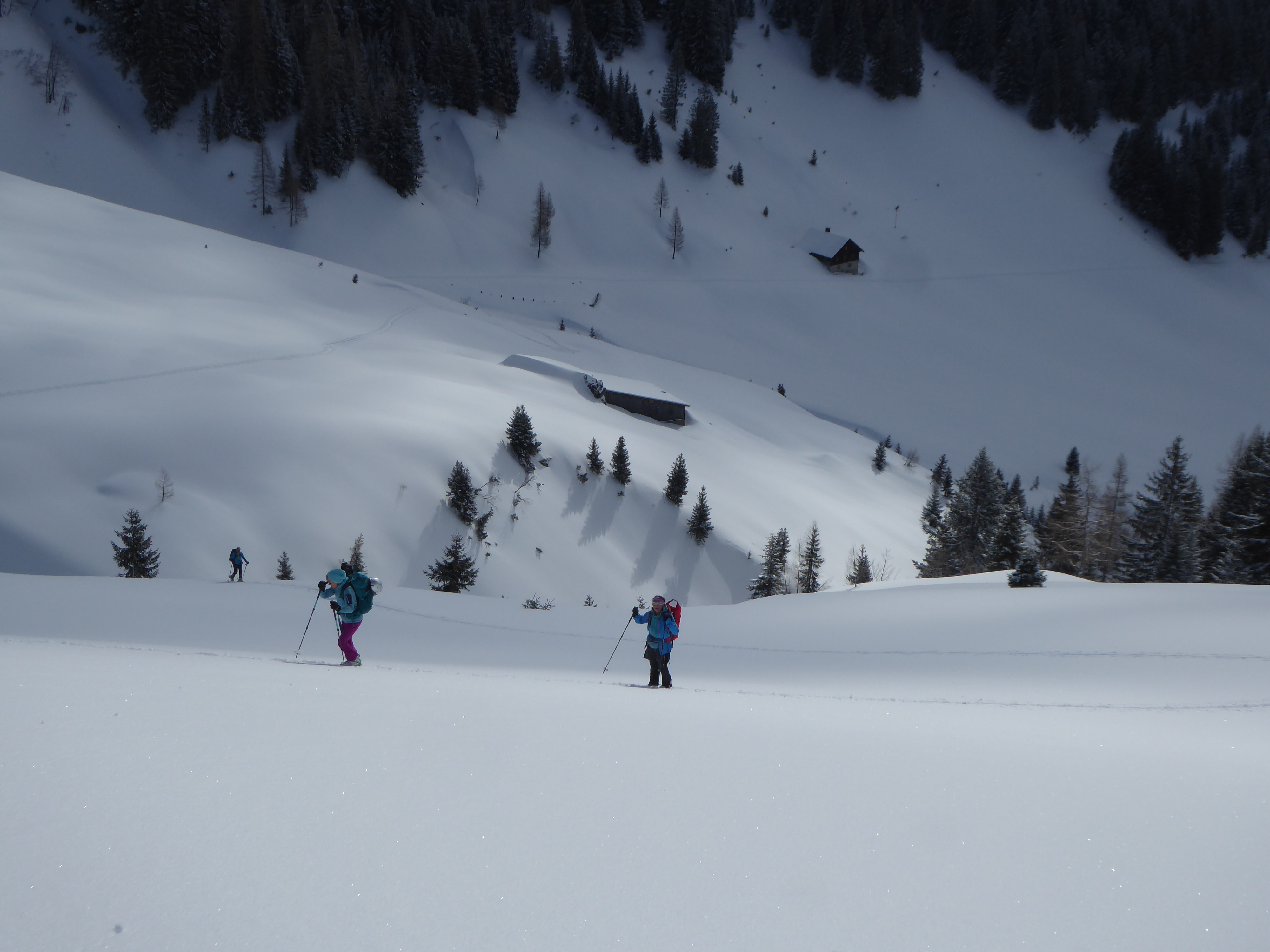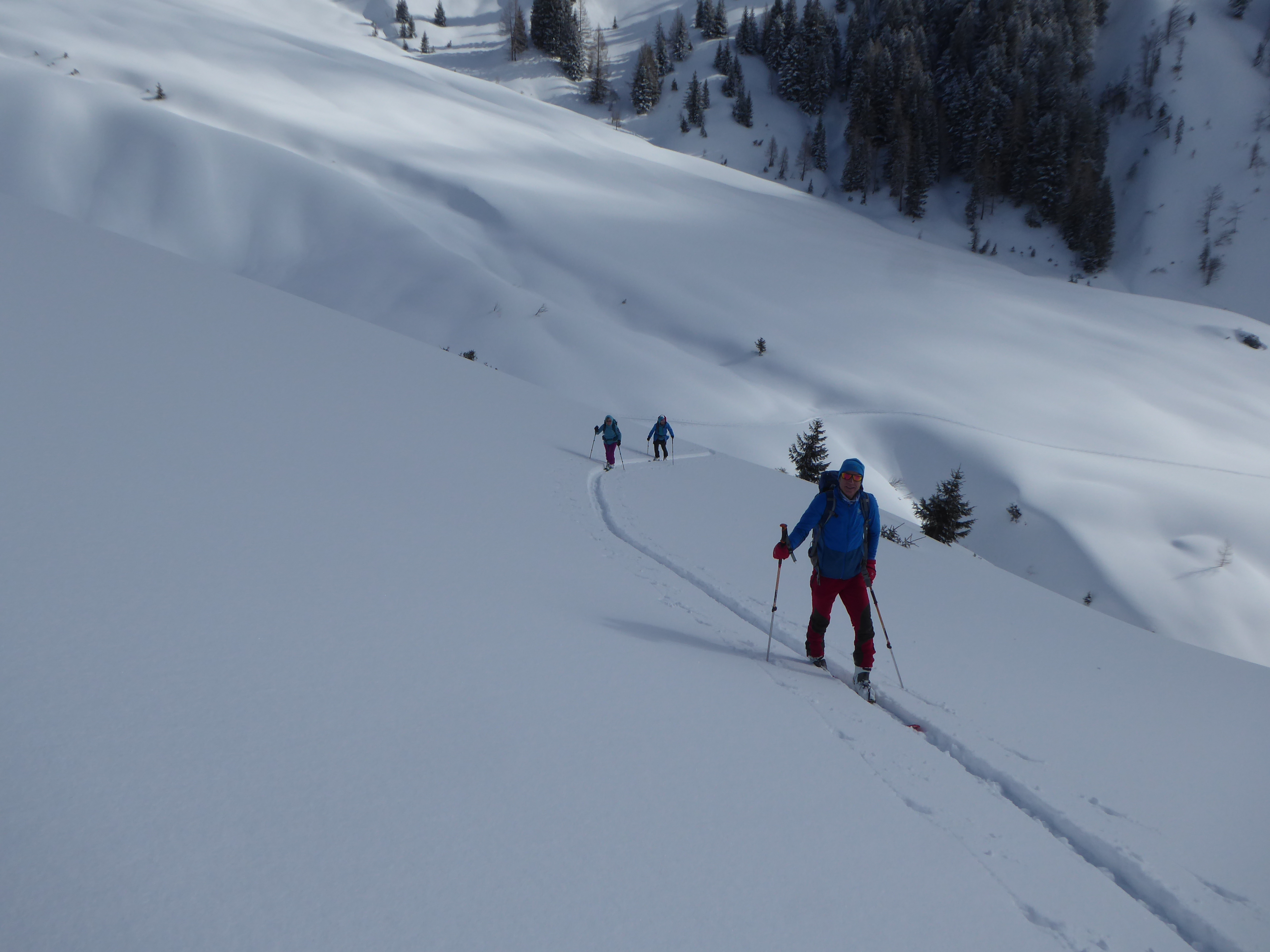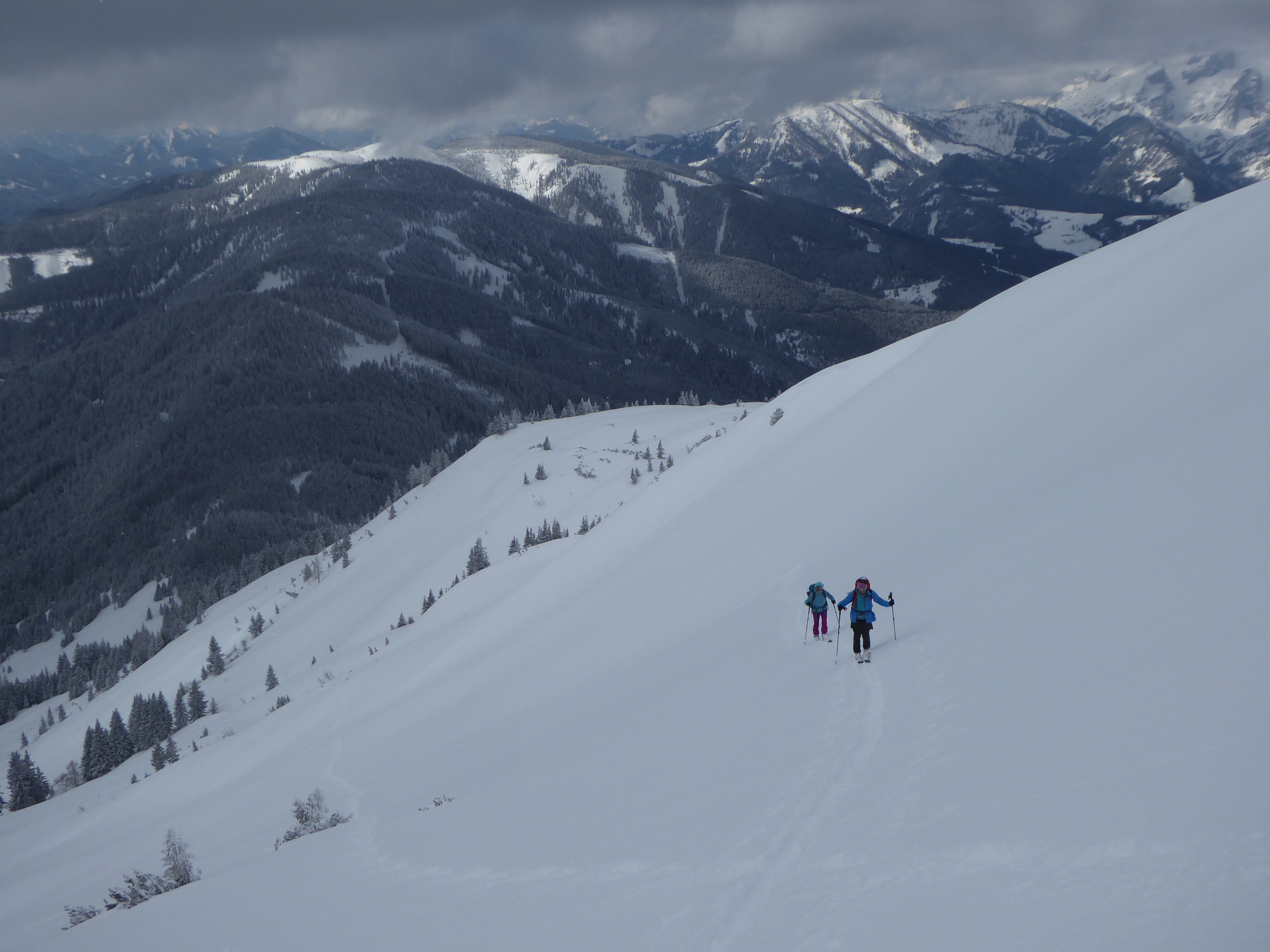 Nicht wie üblich die Neuberg-Route, sondern von Filzmoos über die Aualm. Unsere Spekulation für heute: 2 kalte Tage mit jeweils ein bisschen Neuschnee, zuletzt sehr windarm gefallen, dazu der Wetterbericht: Kalte Nacht, vormittag Hangnebel und Bewölkung, ab Mittag Sonne. D.h. der Pulver müsste auch südseitig bis zur Abfahrt halten und so wars dann auch: Großteils fluffiger Pulver 10-30cm auf kompakter, harter Unterlage, weitgehend ungebunden, nur nahe des SW-Kamms noch geringfügig gebunden. Großartig schön und gleichmäßig zu fahren. Andrang (auf unserer Aualm-Seite) übrigens Null (am Sonntag!!), bis auf ein Pärchen, das bei Halbzeit umgedreht hat. Felsen bei ca.1900m zum "Gipfel" erklärt. Von der Neubergseite herauf eine 6er-Gruppe. Tolles Skigelände, super wars! In der Kraft der Sonne begann der Schnee nachmittags bereits zu "schwitzen", wird morgen also nach einer weiteren kalten Nacht glaub ich schon weitgehend kaputt sein.