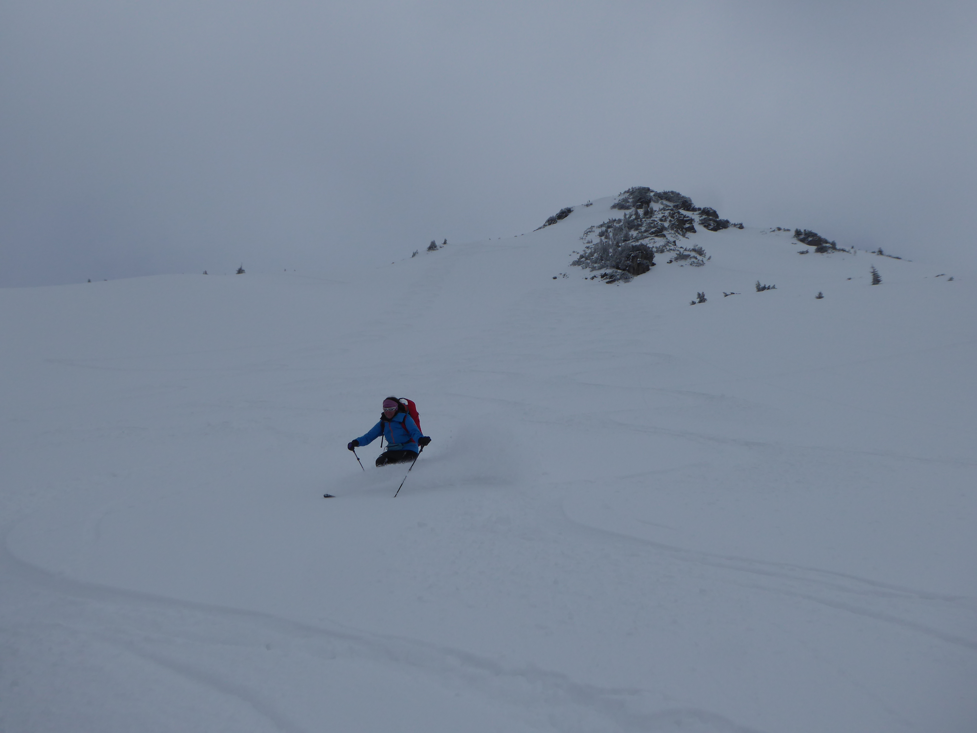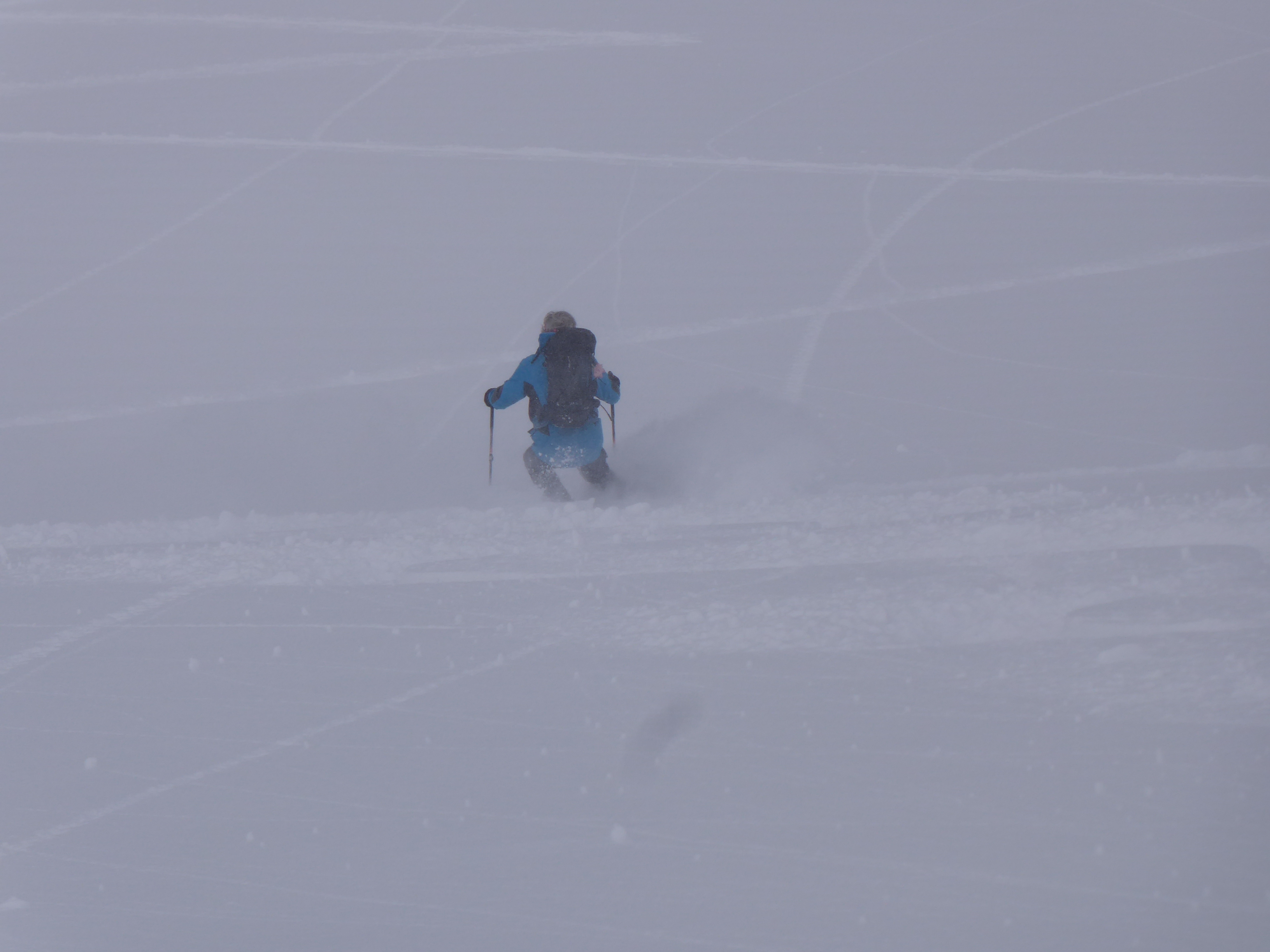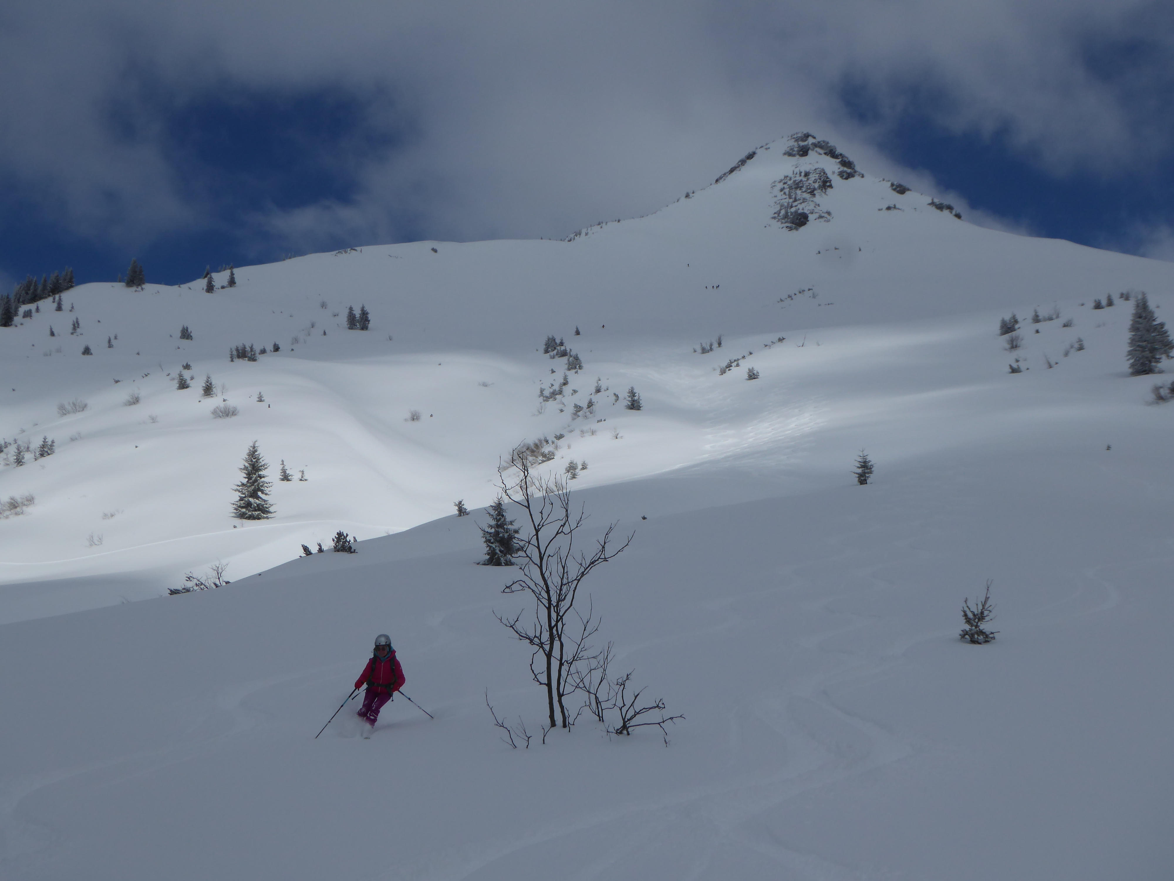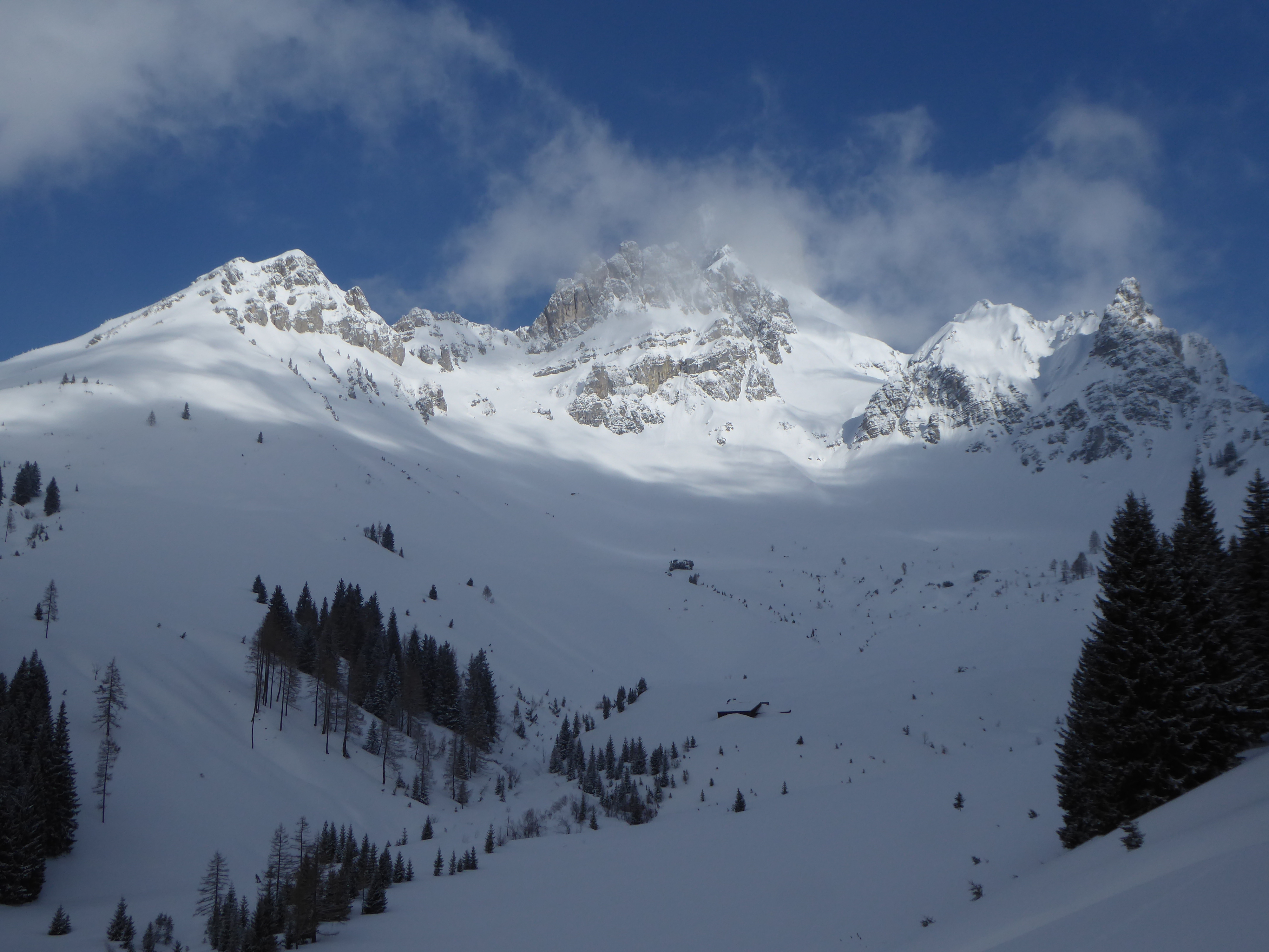 Nicht wie üblich die Neuberg-Route, sondern von Filzmoos über die Aualm. Unsere Spekulation für heute: 2 kalte Tage mit jeweils ein bisschen Neuschnee, zuletzt sehr windarm gefallen, dazu der Wetterbericht: Kalte Nacht, vormittag Hangnebel und Bewölkung, ab Mittag Sonne. D.h. der Pulver müsste auch südseitig bis zur Abfahrt halten und so wars dann auch: Großteils fluffiger Pulver 10-30cm auf kompakter, harter Unterlage, weitgehend ungebunden, nur nahe des SW-Kamms noch geringfügig gebunden. Großartig schön und gleichmäßig zu fahren. Andrang (auf unserer Aualm-Seite) übrigens Null (am Sonntag!!), bis auf ein Pärchen, das bei Halbzeit umgedreht hat. Felsen bei ca.1900m zum "Gipfel" erklärt. Von der Neubergseite herauf eine 6er-Gruppe. Tolles Skigelände, super wars! In der Kraft der Sonne begann der Schnee nachmittags bereits zu "schwitzen", wird morgen also nach einer weiteren kalten Nacht glaub ich schon weitgehend kaputt sein.