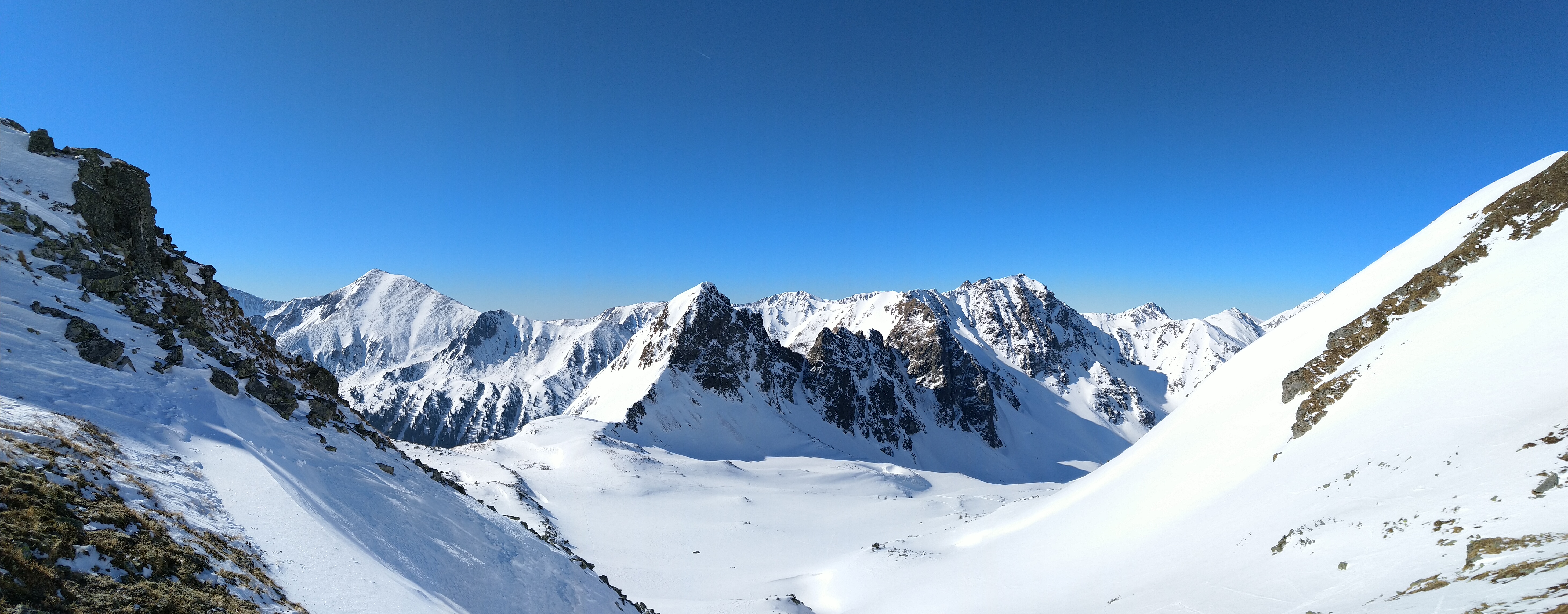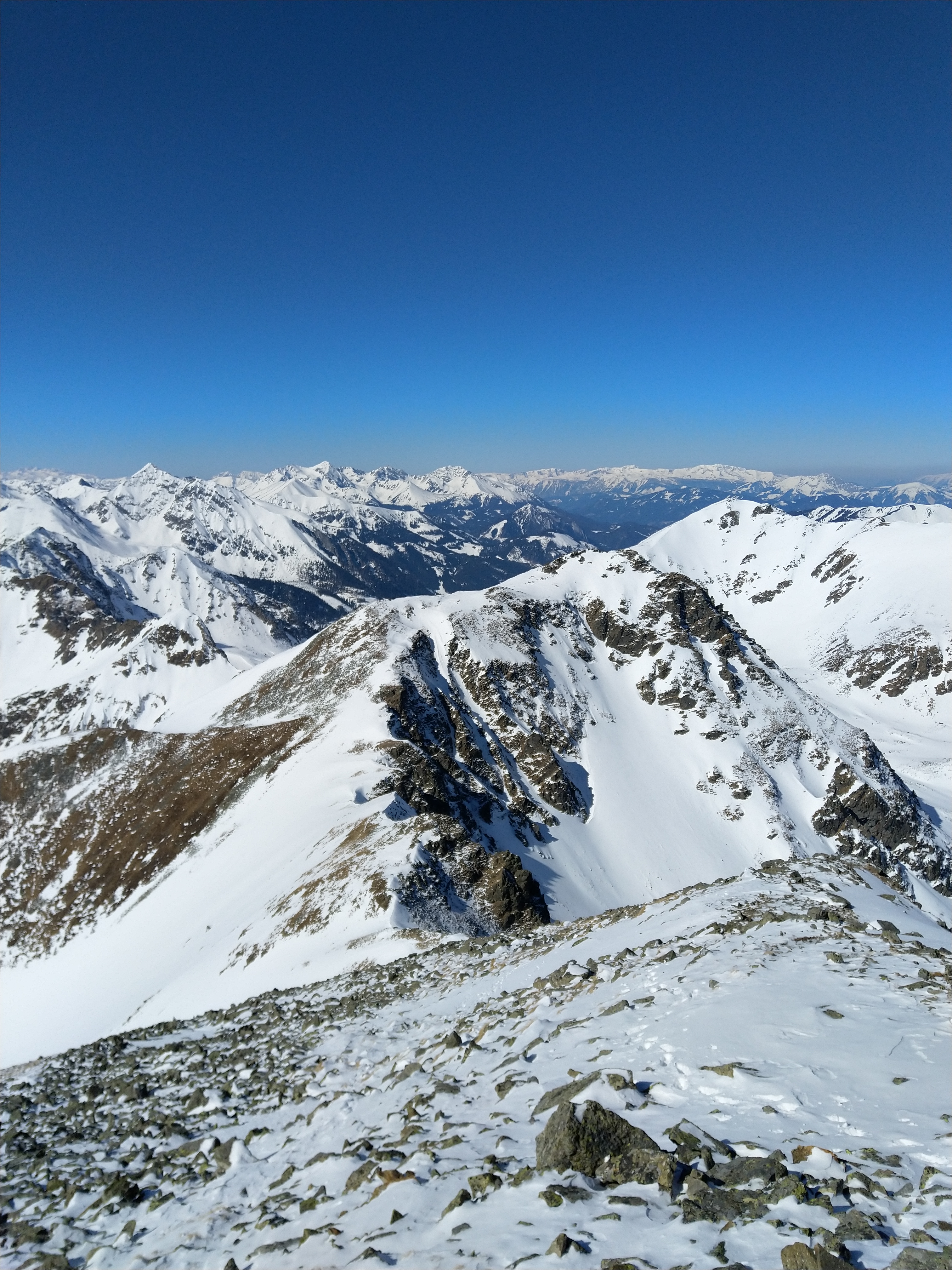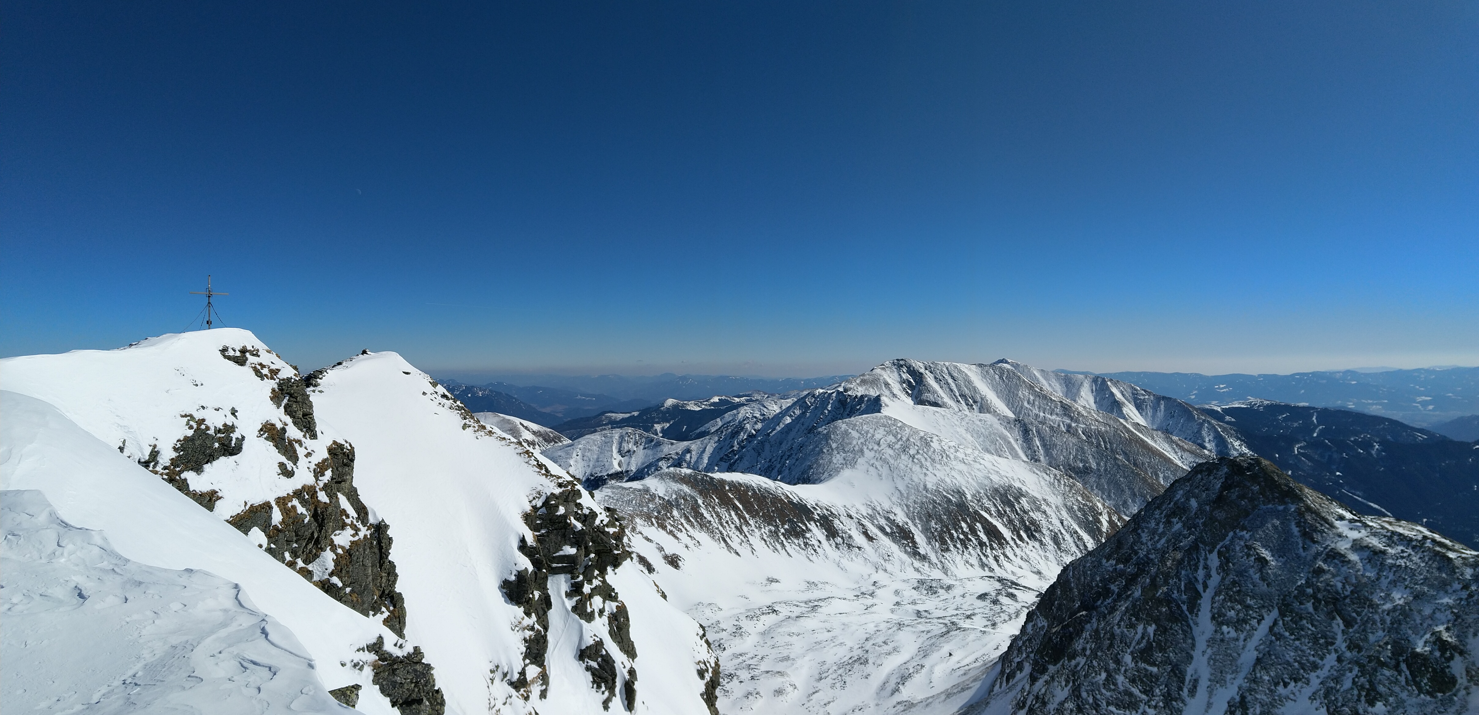 Ausgangspunkt bei der Bergerhube. Aufstieg, klassisch Richtung Kerschkern, bis zum Krügltörl und über den markierten Grat zum Schrimpfkogel dann übers Liesingtörl bis zum Geierhaupt. Bis zum Krügltörl ist eine geschlossene Schneedecke, ab hier heißt es dann Ski tragen. Der Aufstieg über den Grat (zumindest bis zum Schrimpfkogel) ist nicht ganz ohne. Tw vereiste Stellen, die Absturzgefahr in sich bergen. Ich habe oberhalb des Liesingtörls, auf ca 2200 m Skidepot gemacht, da hier ein guter Ausgangspunkt für die Abfahrt in den Donnerofen vorhanden ist. Abfahrt in den Donnerofen bis in die Schaunitz. Wiederanstieg bis zum Schaunitztörl und dann wieder klassisch bis zum Ausgangspunkt. Alles in allem eine sehr schöne einsame Tour in einer grandiosen Gegend. Das Wetter konnte heute nicht besser sein. Am Grat leichter, aber eisiger Wind.