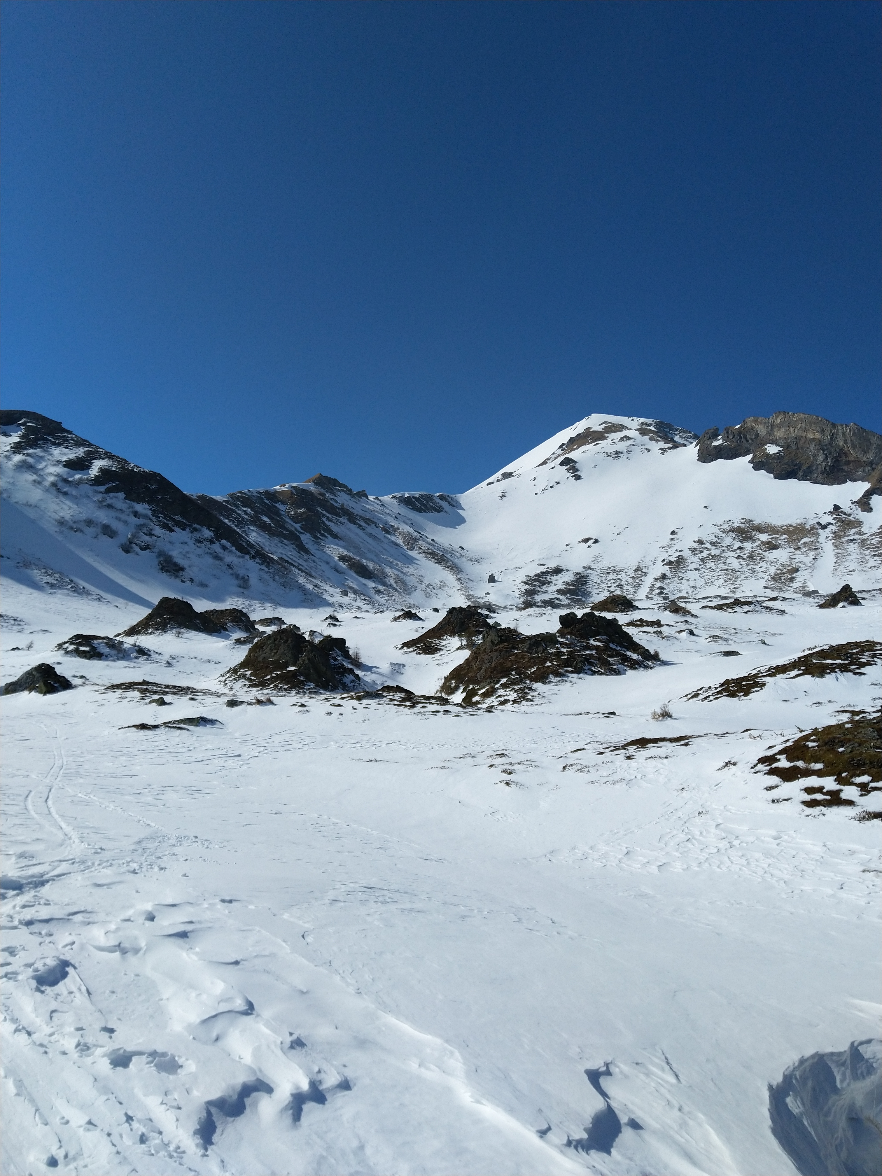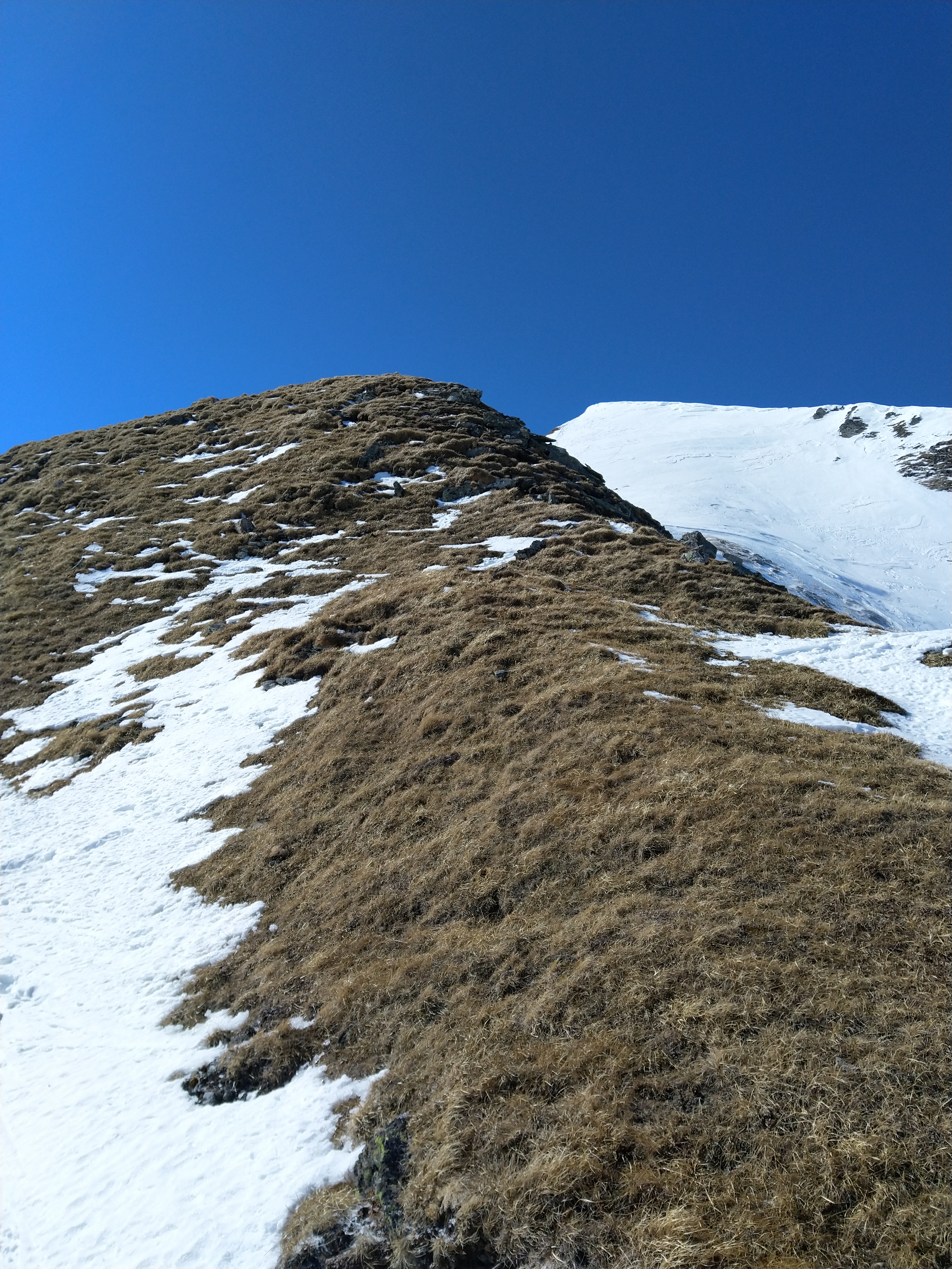 Ab der Pölsenhütte windgepresster Triebschnee der tw hart und eisig ist.