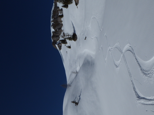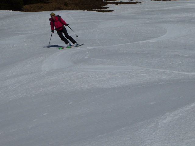 Heute keine Lust mehr auf Experimente, daher für eine sichere Bank entscheiden: Die Gabel verspricht feinsten Firn. Aufgestiegen von der Landesstraße in Au (nach der Lambach-Brücke) über die Bauernwiesen hinauf zum Parkplatz und über die Breitenebenalm, vorbei an der Kasegggalm hinauf zum Gipfel. Alles in der Sonne und windstill 😊 Dann in das unverspurte Kar östlich des Gipfels eingefahren, wieder aufgestiegen und nochmal nordseiteig die Pulver-Zöpferl ergänzt. Bei der Abfahrt abwechselnd gut zu fahrender Sulz und Firn bis ins Tal.
