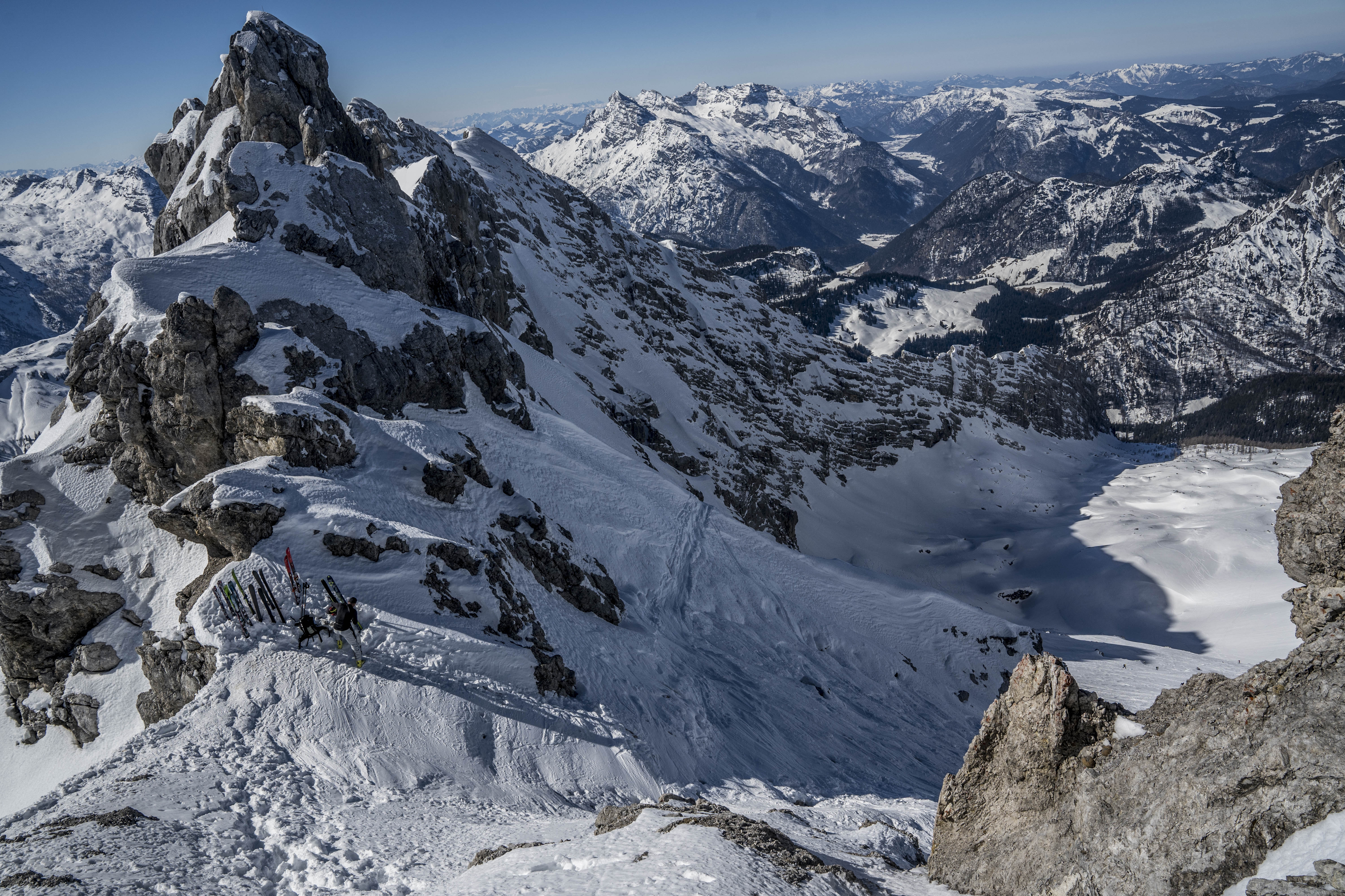 Nach dem Spaziergang vom Parkplatz auf der Geräumten Hirschbichlstraße gab es darauf sehr gute Bedingungen. feste Unterlage und alles Gespurt aber noch nicht überall Verspurt für die Abfahrt. Oben im Kar im "Steilhang" haben dann auch wir, wie der Großteil doch sicherheitshalber die Harscheisen angelegt. wirklich nötig waren sie eher nicht. oben an der Scharte war genug platz für das Skidepot. Über den Grat waren die Stapfer teils Eisig, Steigeisen und Pickel gaben hier Sicherheit. Die Jausenaussicht direkt neben dem Gipfel war in der Ferne super, nur der "gelbe Schnee" mitten auf so einer Fläche sehr unnötig...