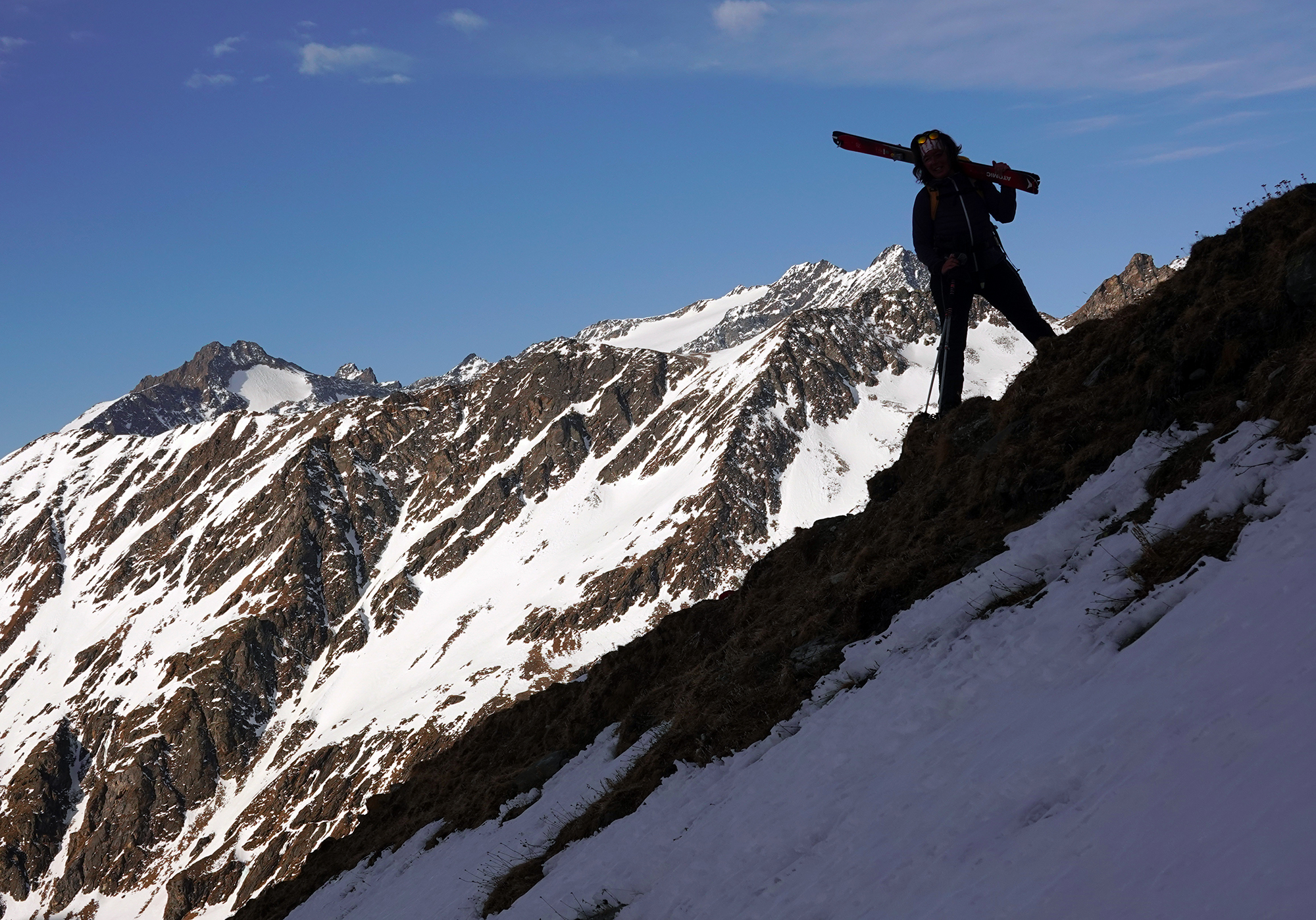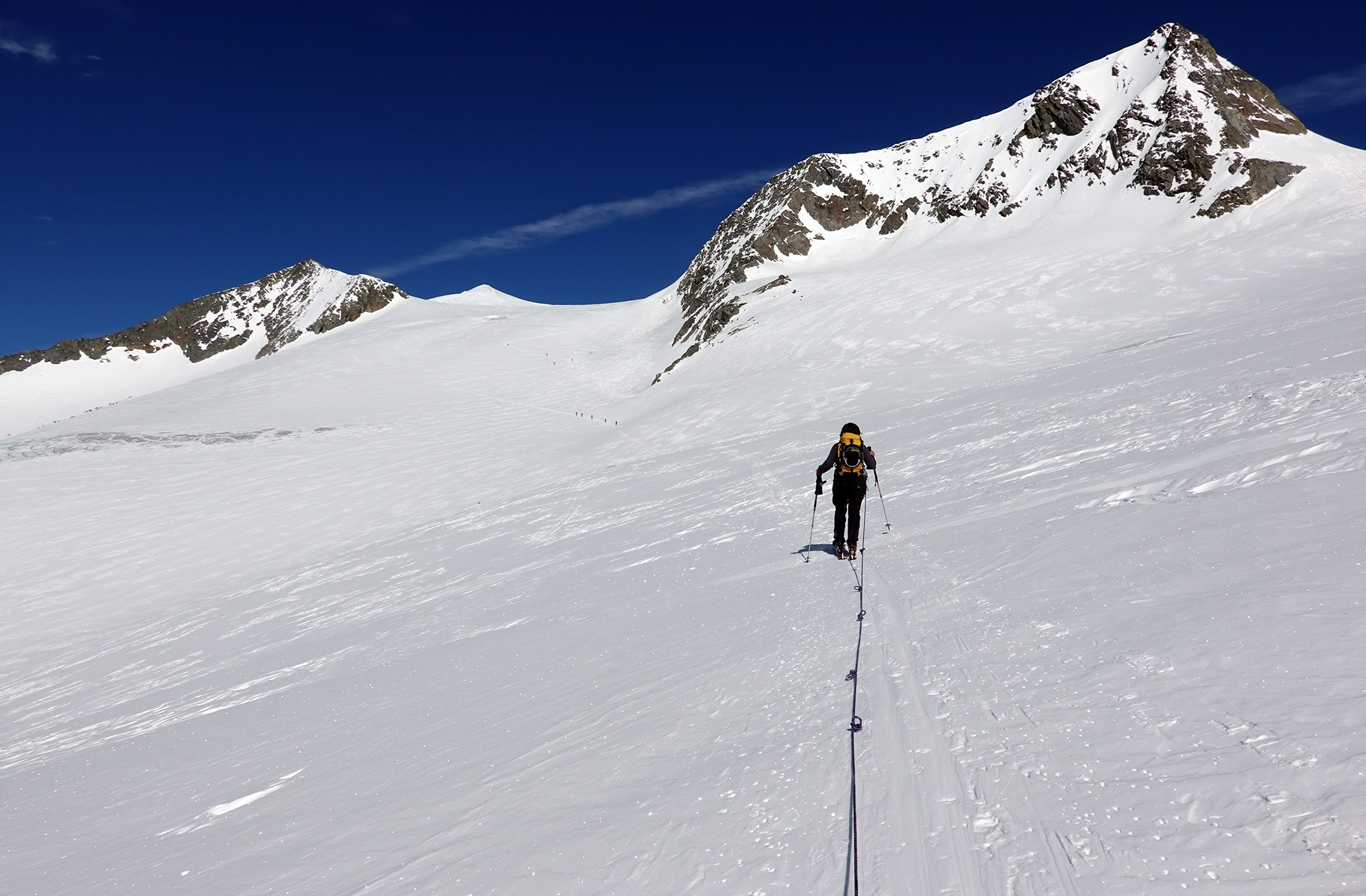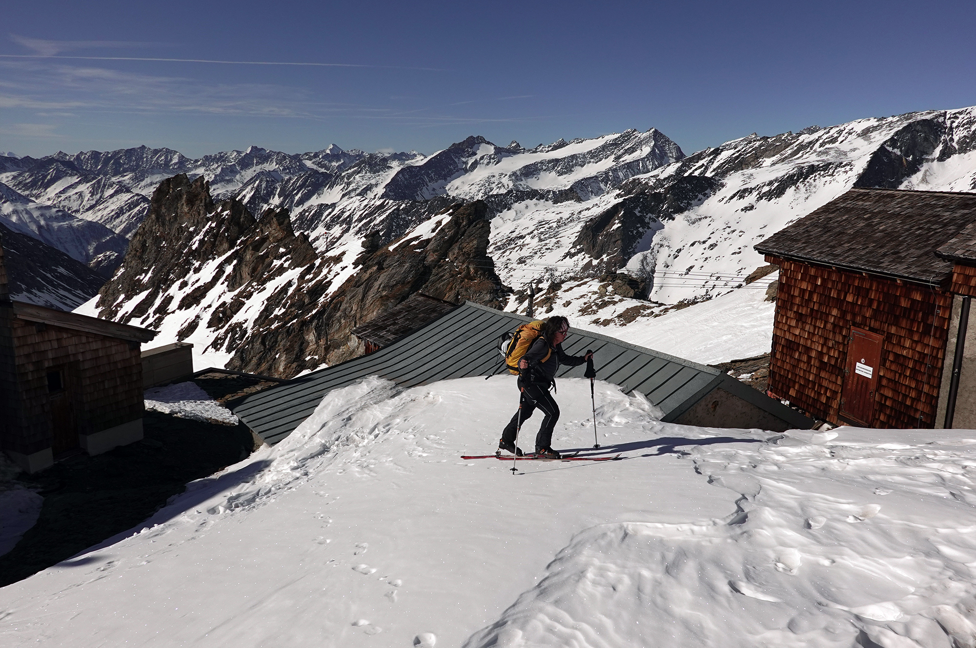 Mit Übernachtung auf der Johannishütte (bis Anfang Mai geöffnet) sind wir von Süden auf den Großvenediger gestiegen. Bis zur Johannishütte ist der Weg schon zum Teil aper, überhaupt ist auf der Südseite viel weniger Schnee als bei uns. Auch Tourengeher der Hochtirol haben von Tragepassagen berichtet. Das Defreggerhaus ist geschlossen. Der Schnee auf dem Gletscher ist hart und windbehandelt. Die Spalten sind fest zu, deshalb waren wir wohl die einzigen, die völlig "Old-School" auf dem Gletscher angeseilt haben. Für den kurzen Übergang zum Gipfel braucht man keine Steigeisen. Die Abfahrt war im oberen Teil sehr hart, böse Windgangeln konnte man aber meist umfahren. Weiter unten wird es firnig, und man kann in einer Rinne ohne Tragepassagen bis zur Johannishütte abfahren.