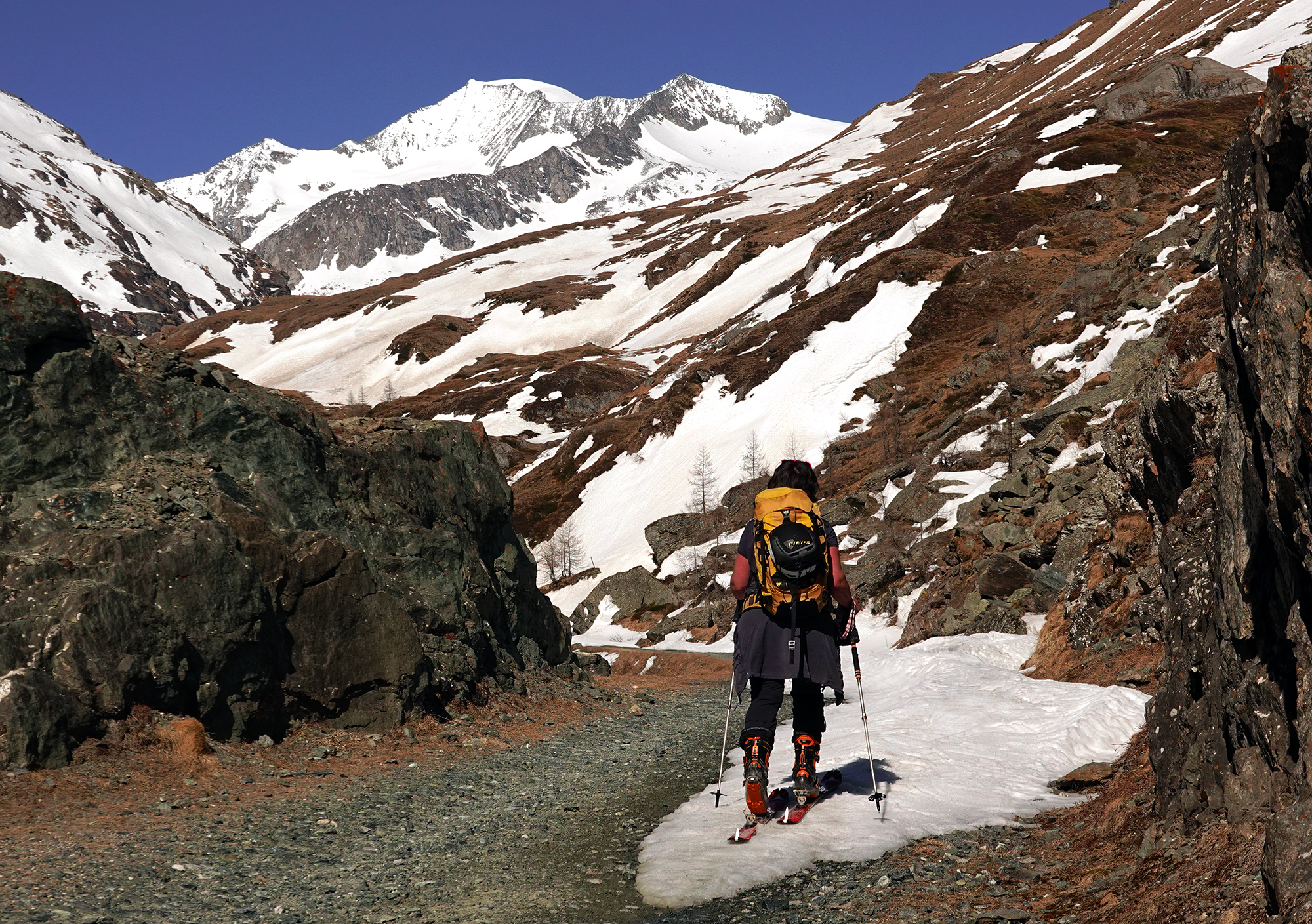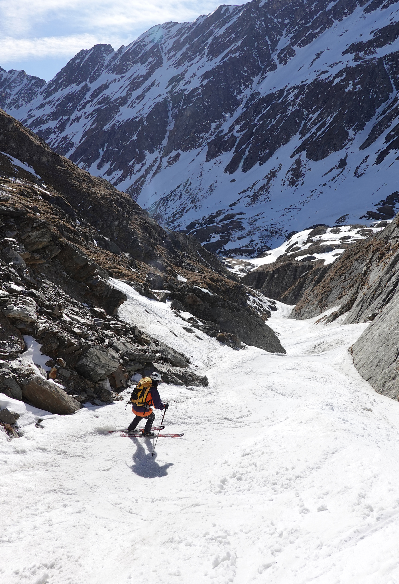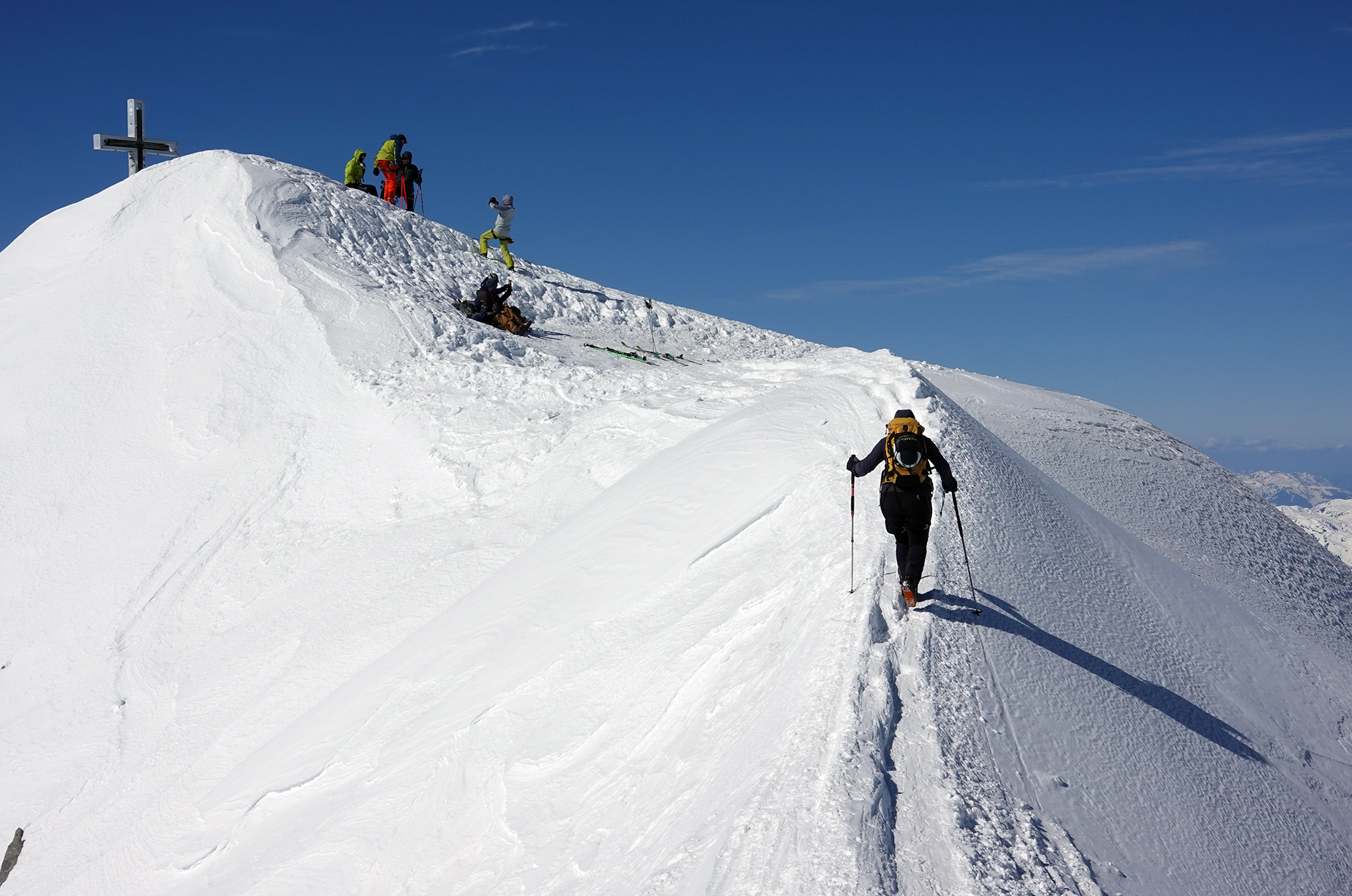 Mit Übernachtung auf der Johannishütte (bis Anfang Mai geöffnet) sind wir von Süden auf den Großvenediger gestiegen. Bis zur Johannishütte ist der Weg schon zum Teil aper, überhaupt ist auf der Südseite viel weniger Schnee als bei uns. Auch Tourengeher der Hochtirol haben von Tragepassagen berichtet. Das Defreggerhaus ist geschlossen. Der Schnee auf dem Gletscher ist hart und windbehandelt. Die Spalten sind fest zu, deshalb waren wir wohl die einzigen, die völlig "Old-School" auf dem Gletscher angeseilt haben. Für den kurzen Übergang zum Gipfel braucht man keine Steigeisen. Die Abfahrt war im oberen Teil sehr hart, böse Windgangeln konnte man aber meist umfahren. Weiter unten wird es firnig, und man kann in einer Rinne ohne Tragepassagen bis zur Johannishütte abfahren.