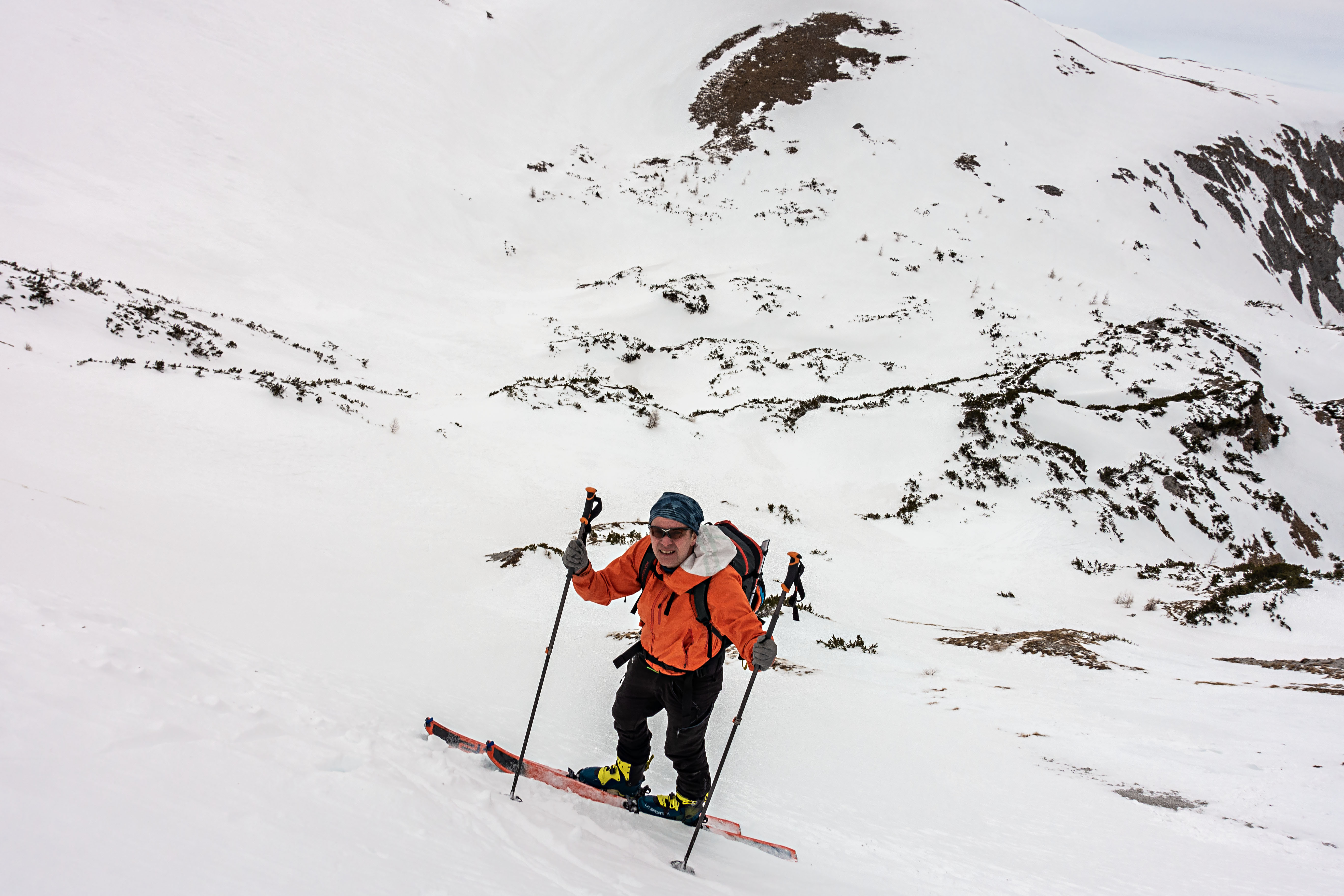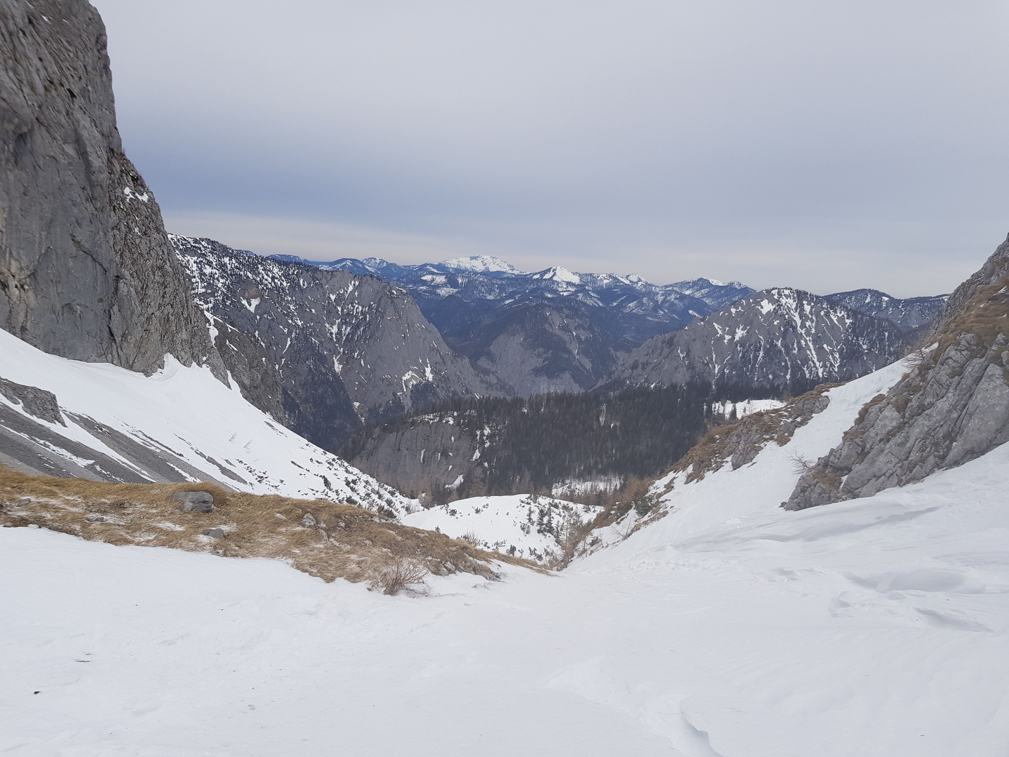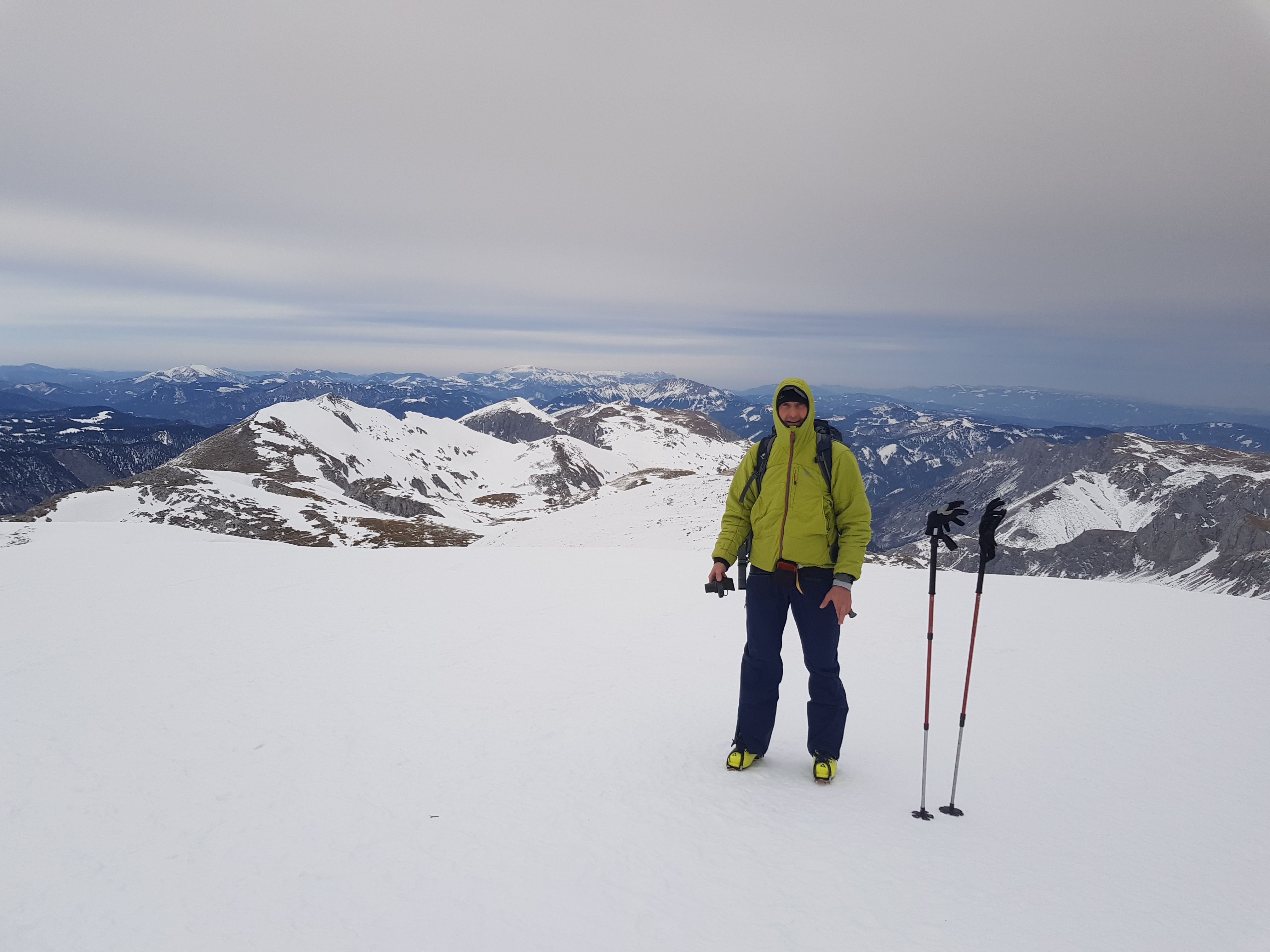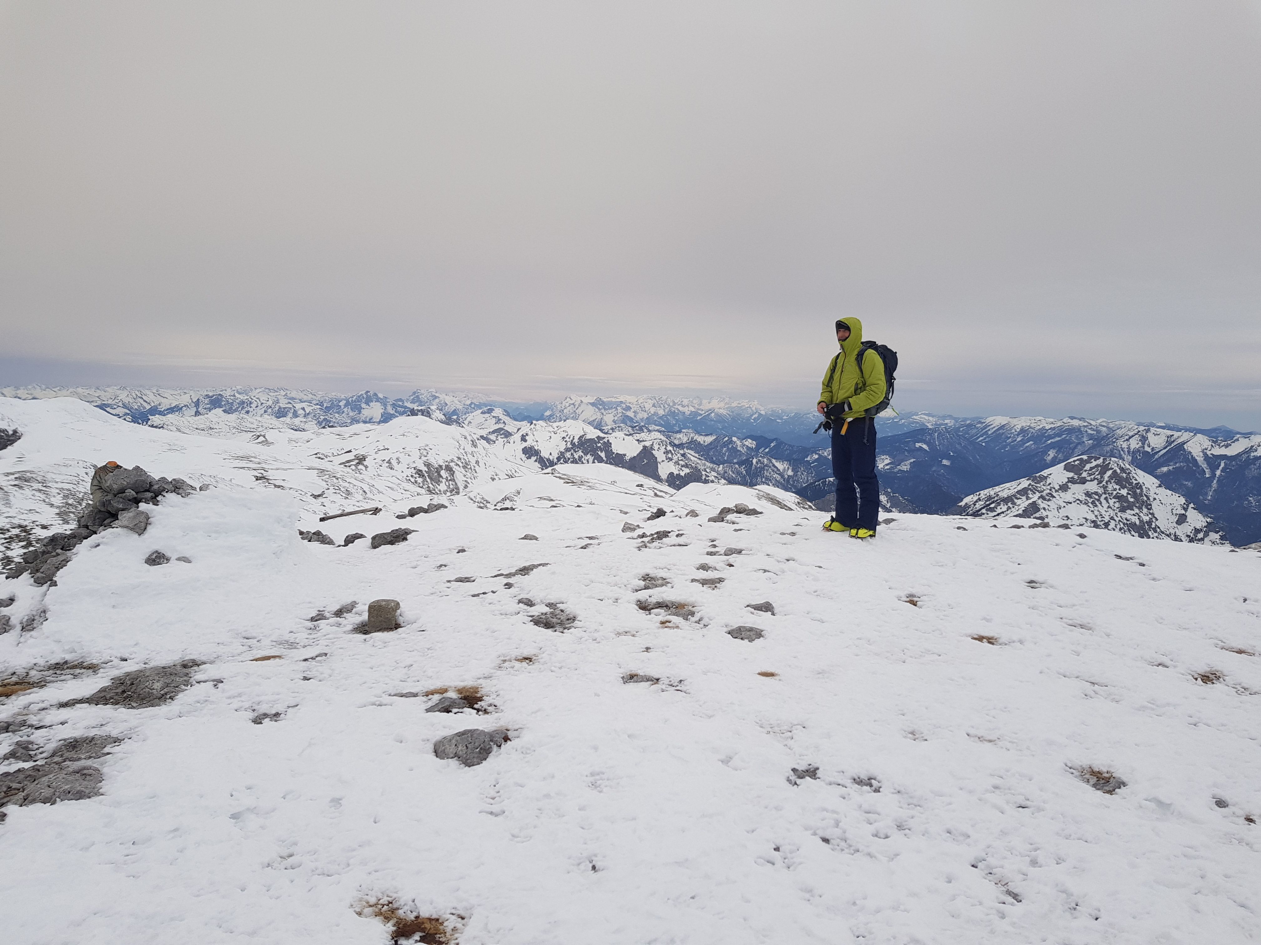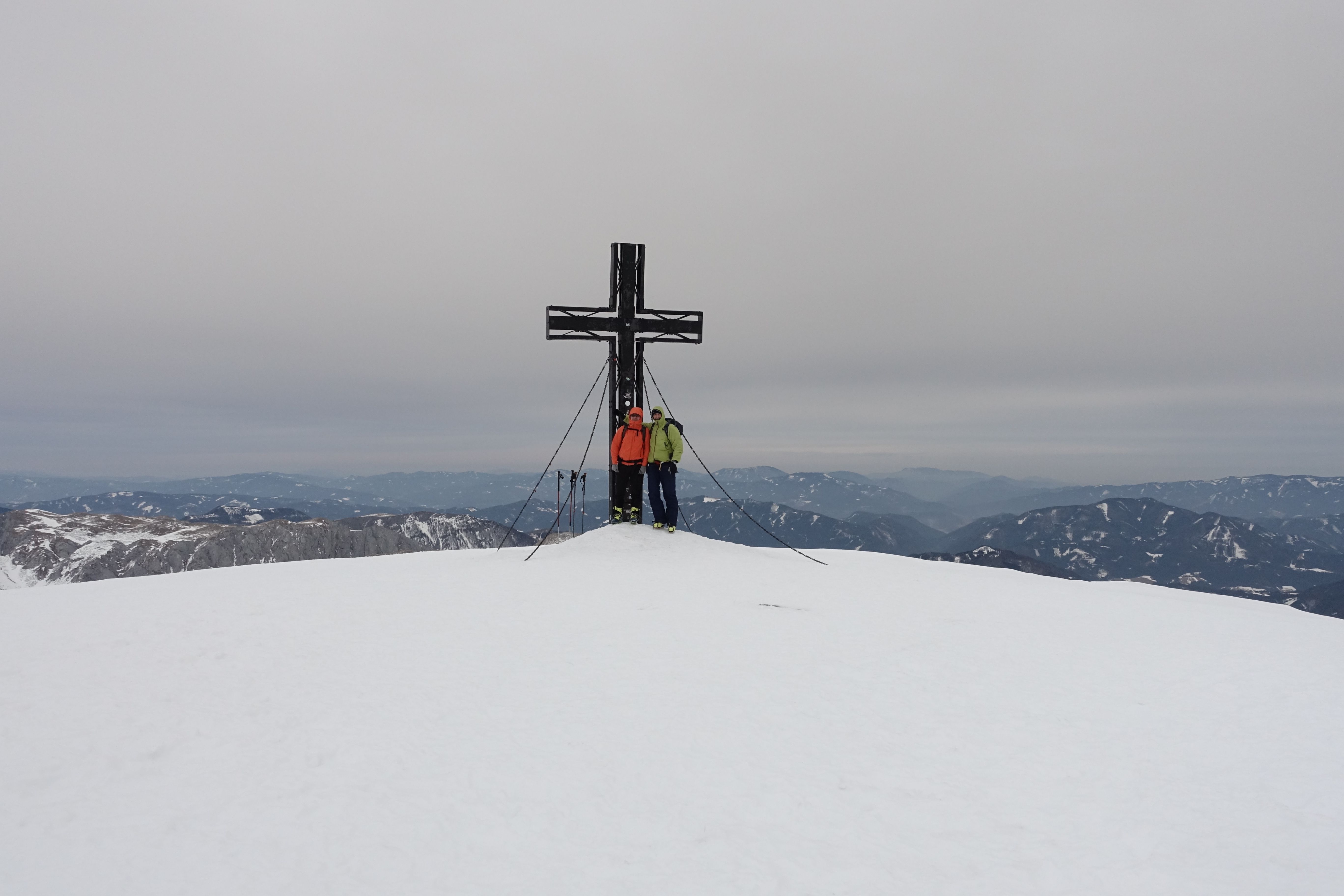 Lange und einsame Tour auf den Hochschwab. Gut 6 Stunden Aufstieg von Weichselboden (einziges Auto am Parkplatz) über die Edelbodenalm (noch genug Schnee bis fast zum Parkplatz hinunter) und Gschöderer Kar. Wetter war gut, bedeckt nicht kalt und nur zeitweise windig. Beim Aufstieg spätestens bei der ersten Steilstufe Harscheisen nötig - auch später beim Siebenbrunner Kogel empfehlenswert - dort sehr eisig und hart und abgeweht.