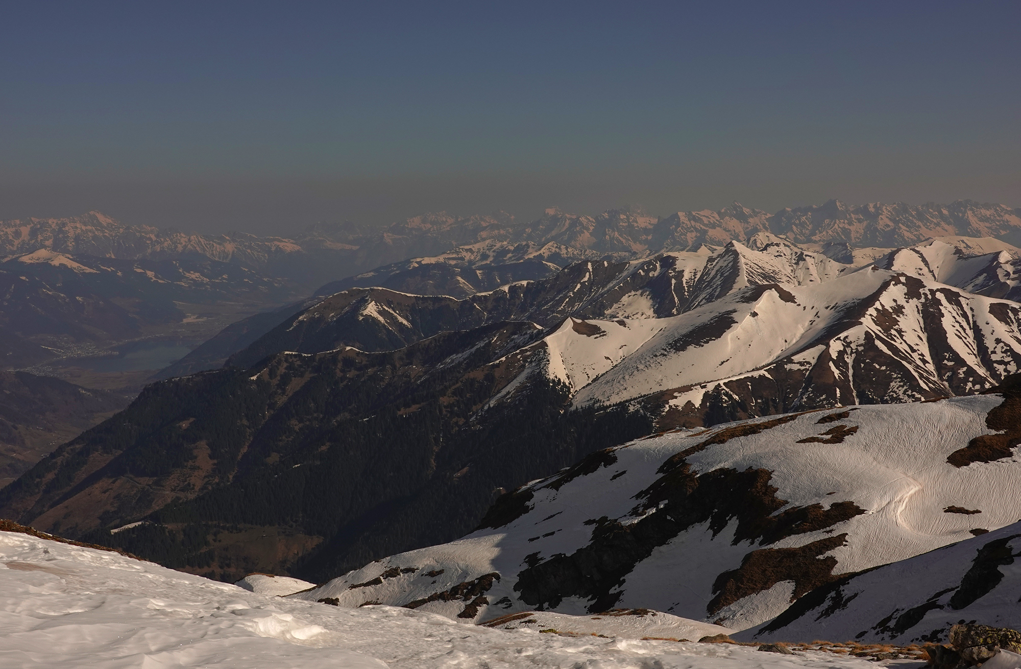 Am Schwarzkopf geht es mit Ski von und bis zum Parkplatz Bad Fusch. An der Gipfelflanke sehr wenig Schnee. Kleinräumige Unterschiede, windgepresste Platten, Büßerschnee, Hartgefrorenes, - das gegen Mittag an der Riegeralm gut fahrbarer Firn ist. Die übliche Naßschneelawine ist schon unten. --- Wer allein sein will, geht zum Imbachhorn, - da muss man schon recht weit die Ski tragen!